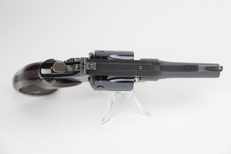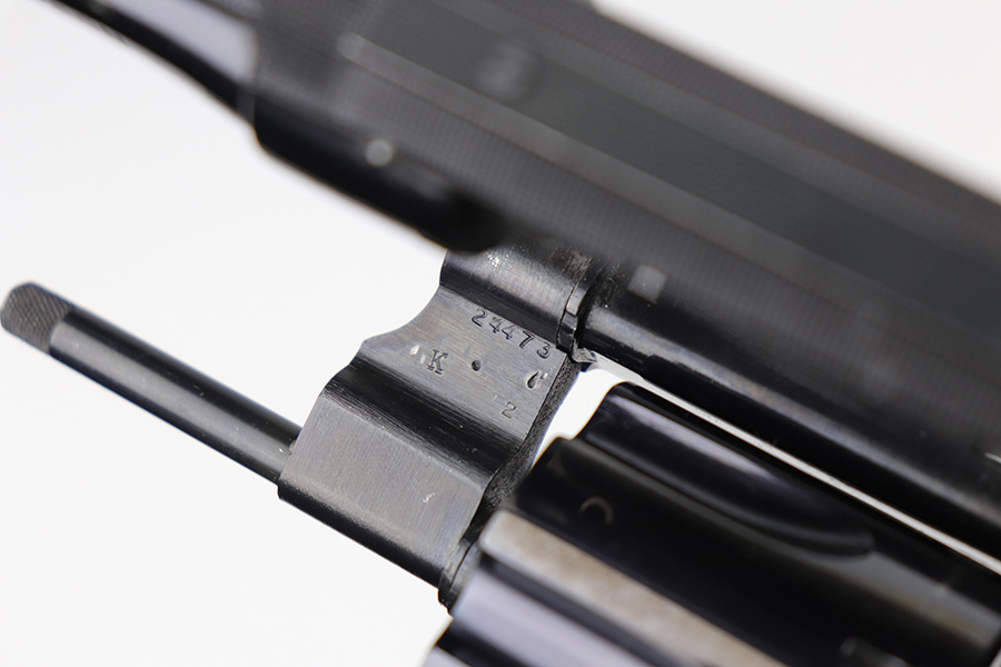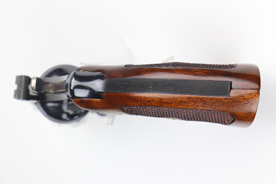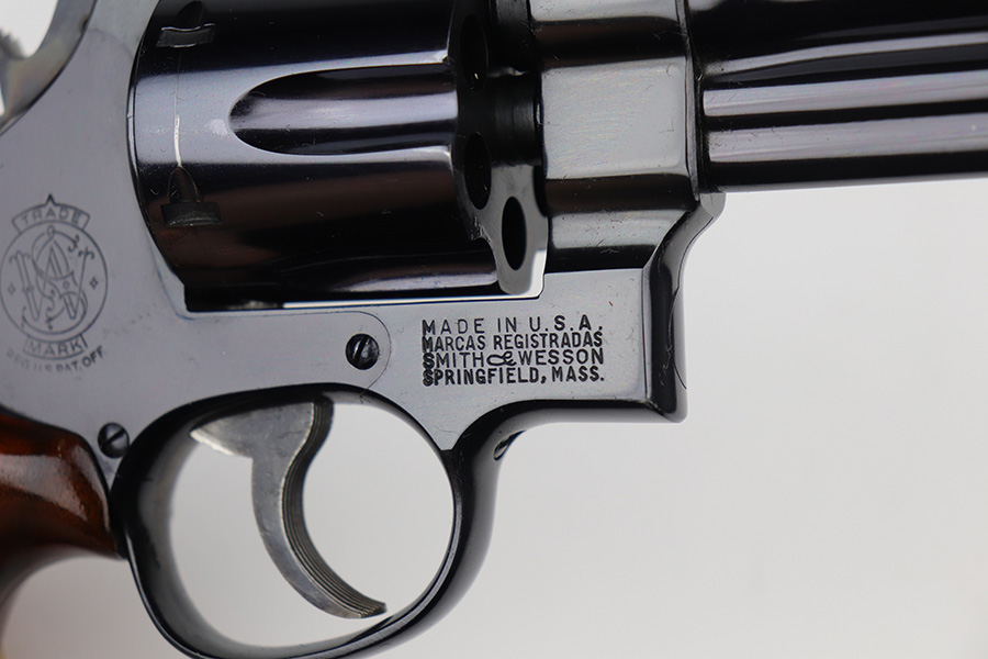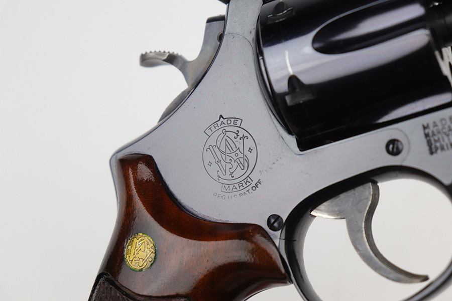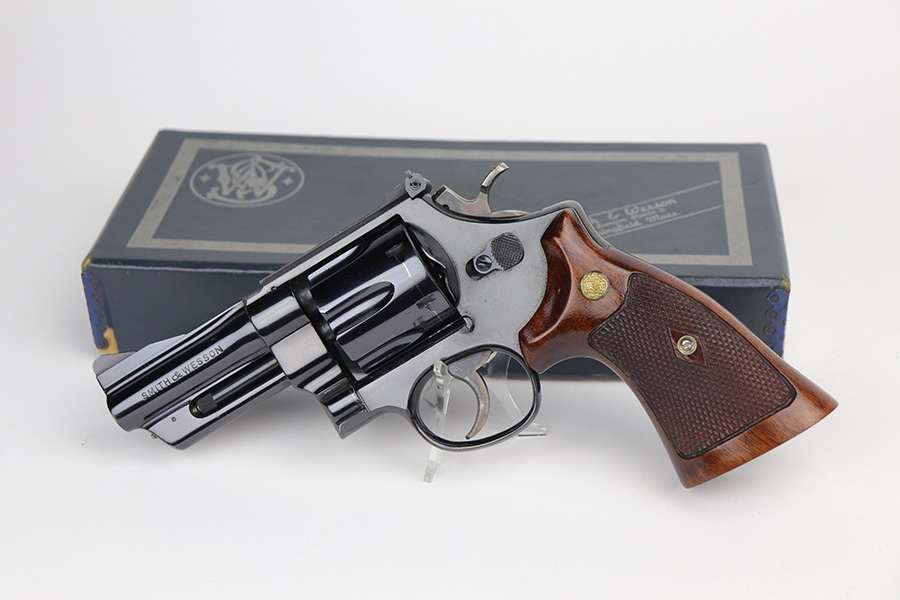 10/29/21 – This is a near-mint Smith & Wesson Model 27 in its original, matching box. It features a 3in barrel and the target grips. The original blue is beautiful and rates at 98-99% with just a turn line on cylinder and a hint of muzzle wear. Minty bore and grips. Nice case hardening on trigger and hammer. Perfect timing/action. Serial dates this one to either the later months of 1958 or early in 1959.