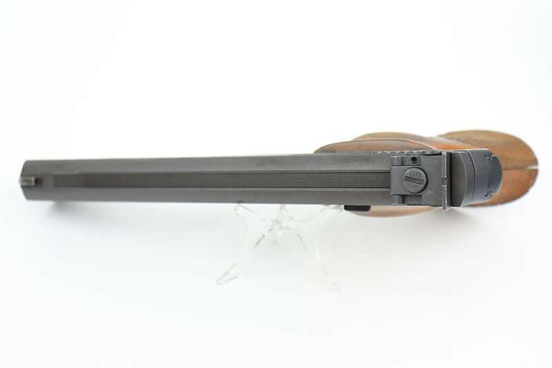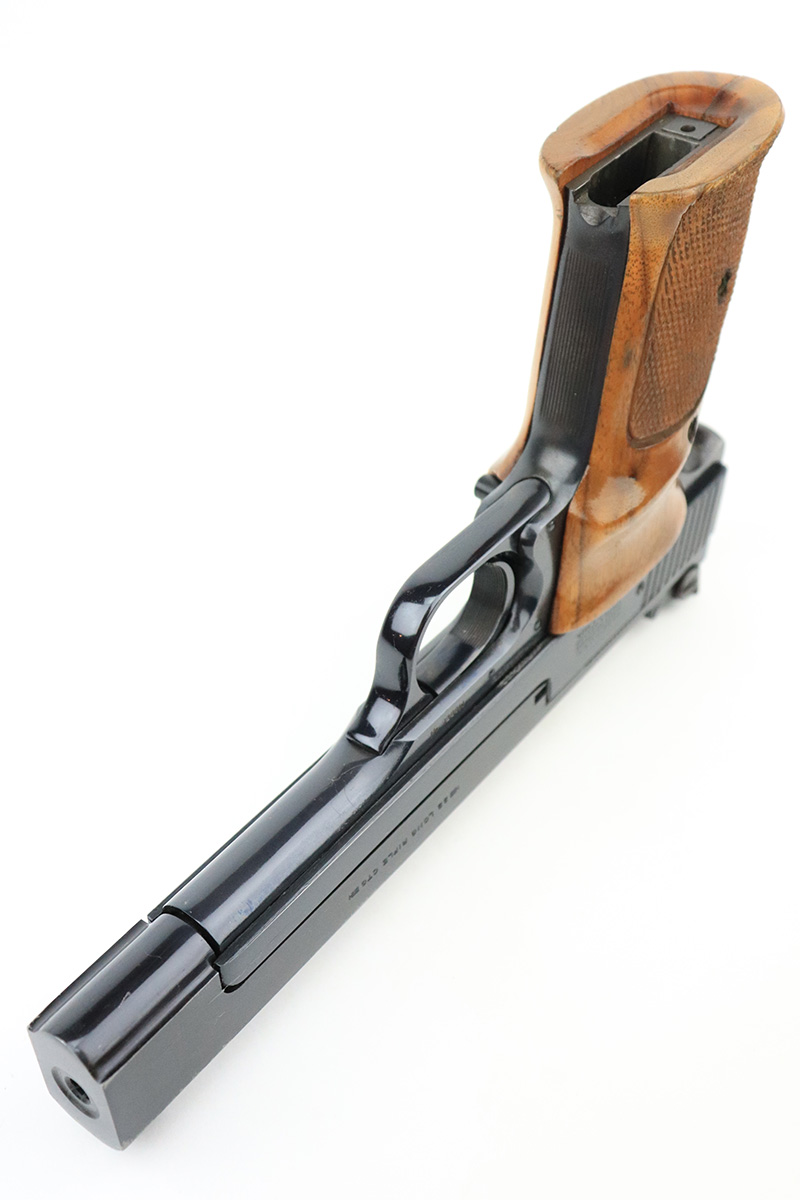 9/21/22 – This is a minty example of a Smith & Wesson Model 41, manufactured in 1979 and chambered in .22 LR. The gun is matching and comes with its original matching-numbered box, owners manual, and two proper magazines. The gun itself has retained about 97% of its original high polish bluing. There is minor muzzle wear and small dots of discoloration on the right side of the tang and along the high edge of the right side of the slide. Comes with beautiful wood grips. Mint bore.