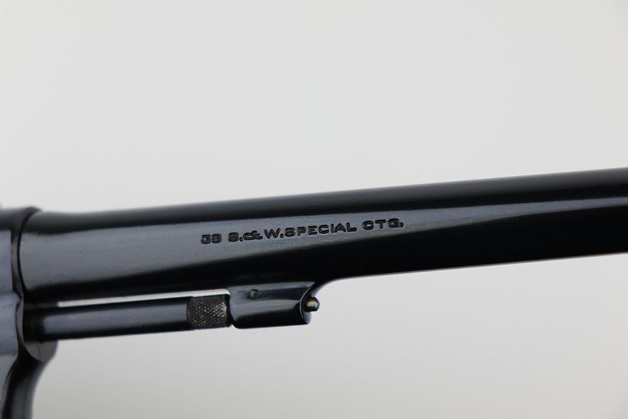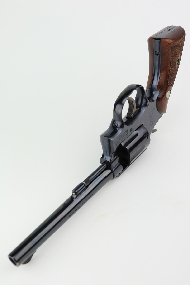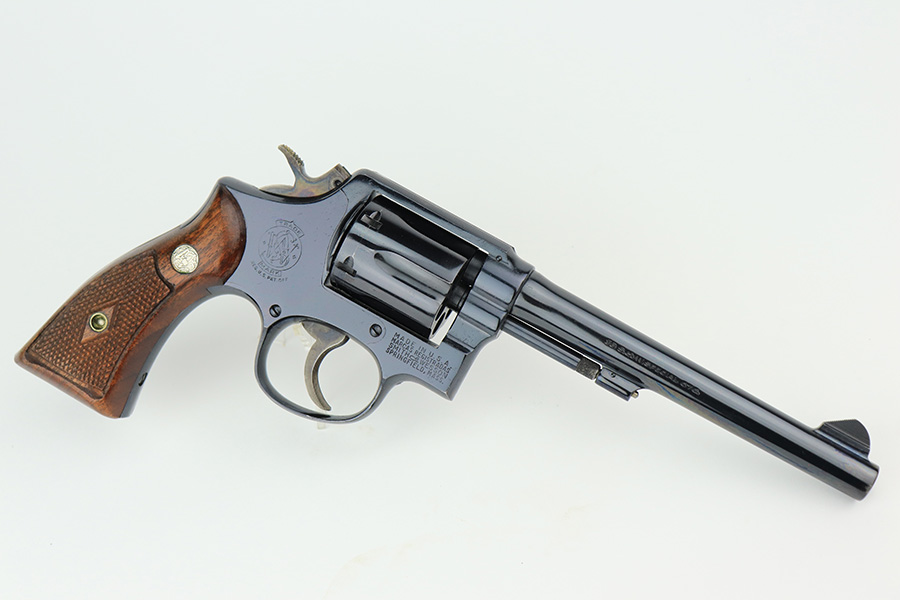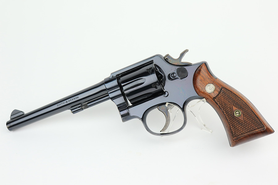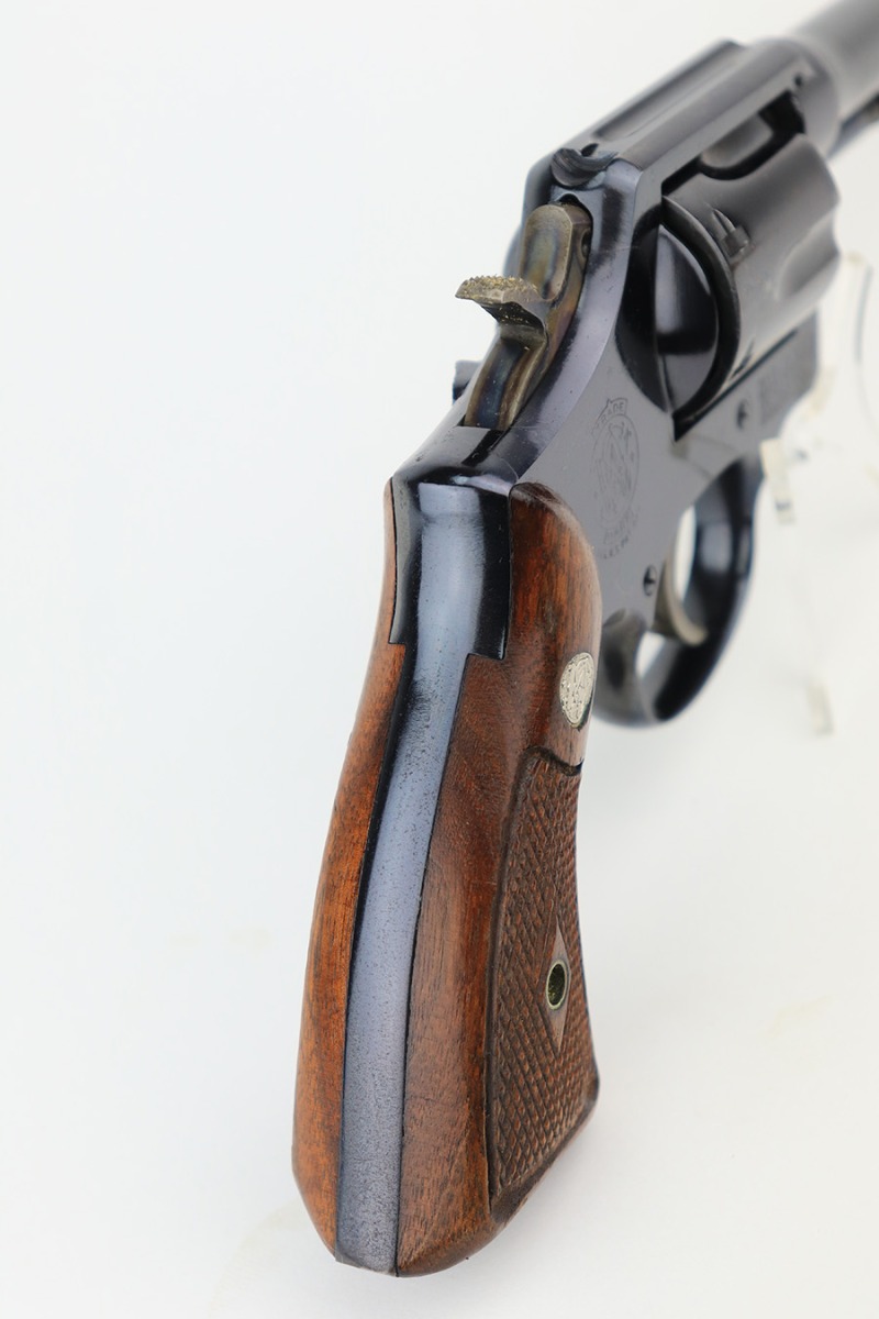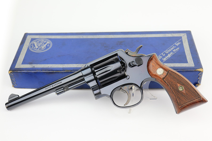 4/20/22 – This is a near-mint example of a Smith & Wesson M&P Model 10 revolver, manufactured around 1961 and chambered in .38 Special. 6″ barrel. The gun comes with a period-correct box (not numbered) and owners manual. It has retained about 99% of its high polish finish. There is just a hint of wear around the muzzle and a very faint roll mark on the cylinder. There is just very minor freckling on both grip straps. A few tiny scratches on the butt of the frame. Excellent case-hardening on the hammer and trigger. Comes with excellent wood grips. Mint bore. The cylinder is tight, and the action is smooth.
