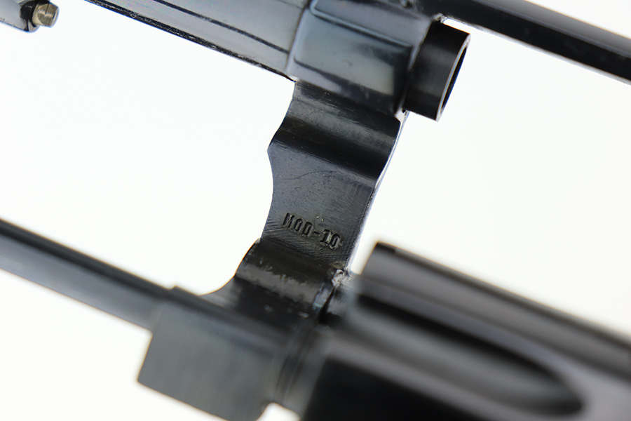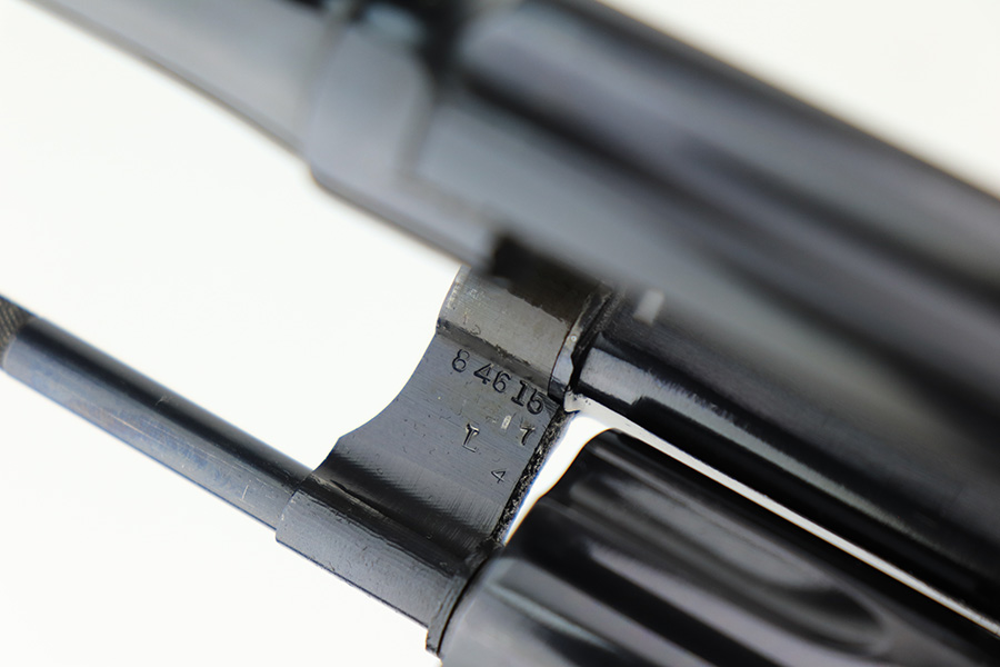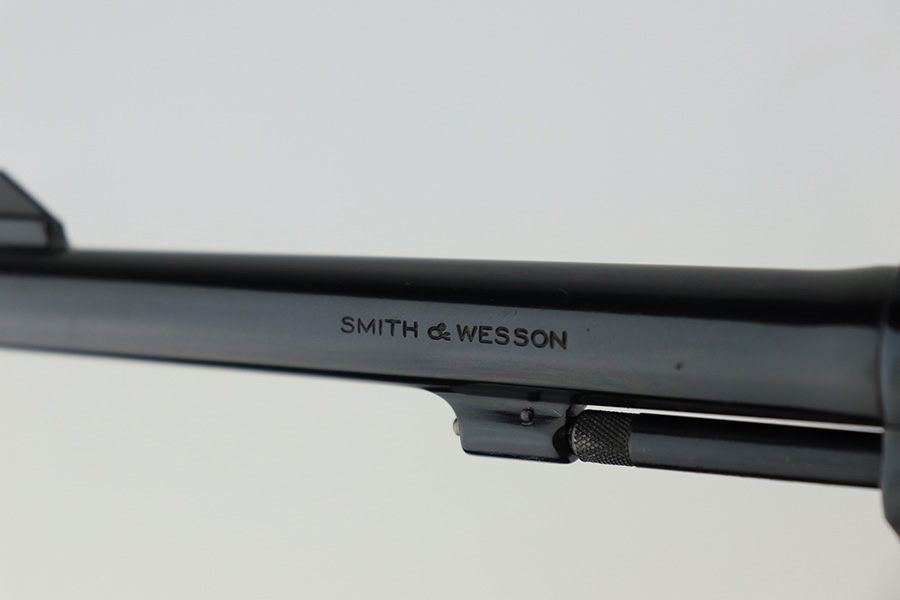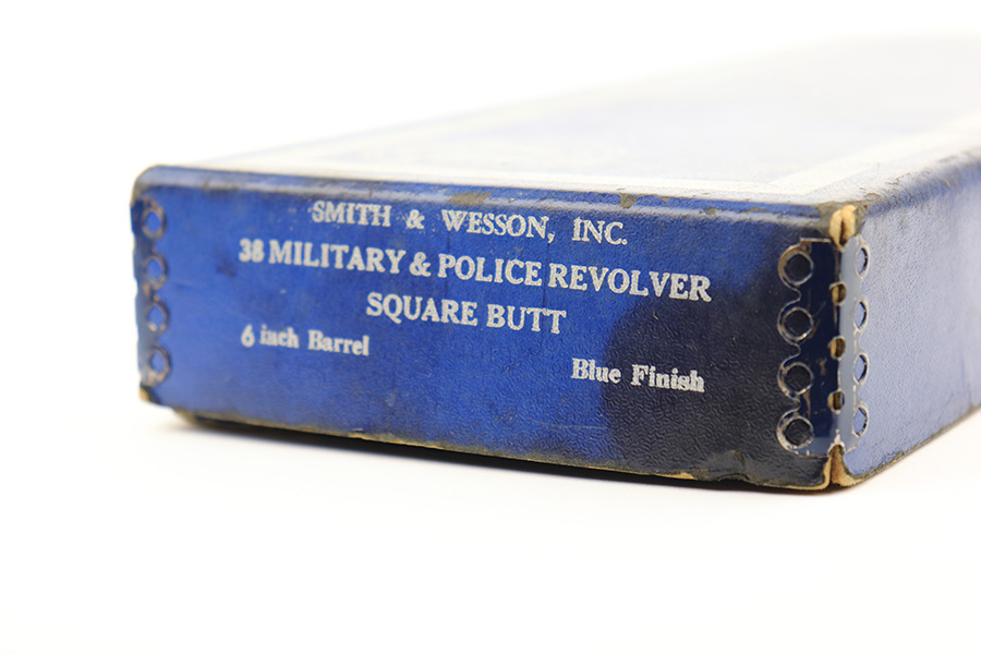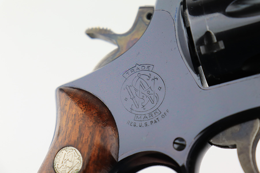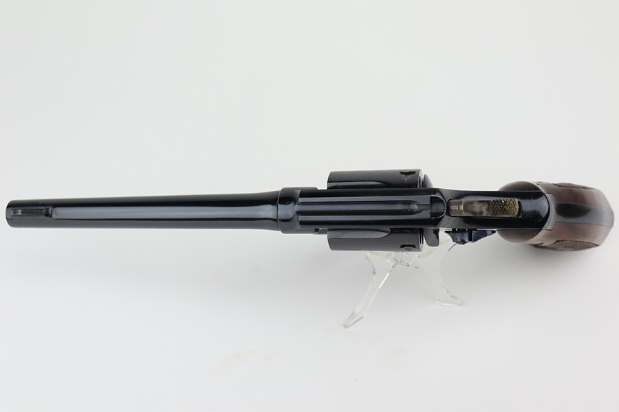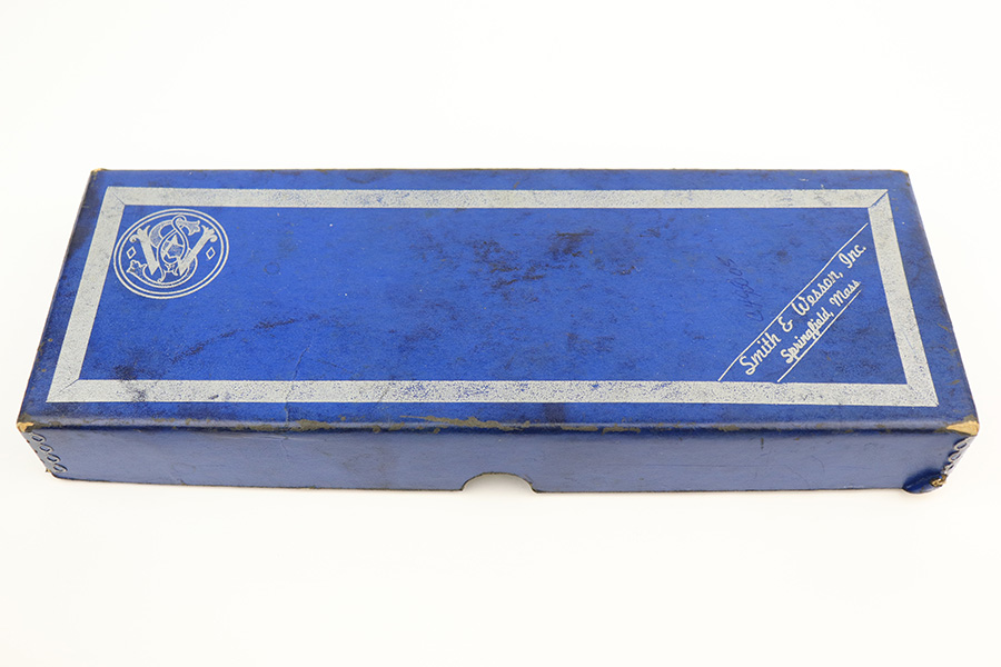 4/20/22 – This is a near-mint example of a Smith & Wesson M&P Model 10 revolver, manufactured around 1961 and chambered in .38 Special. 6″ barrel. The gun comes with a period-correct box (not numbered) and owners manual. It has retained about 99% of its high polish finish. There is just a hint of wear around the muzzle and a very faint roll mark on the cylinder. There is just very minor freckling on both grip straps. A few tiny scratches on the butt of the frame. Excellent case-hardening on the hammer and trigger. Comes with excellent wood grips. Mint bore. The cylinder is tight, and the action is smooth.