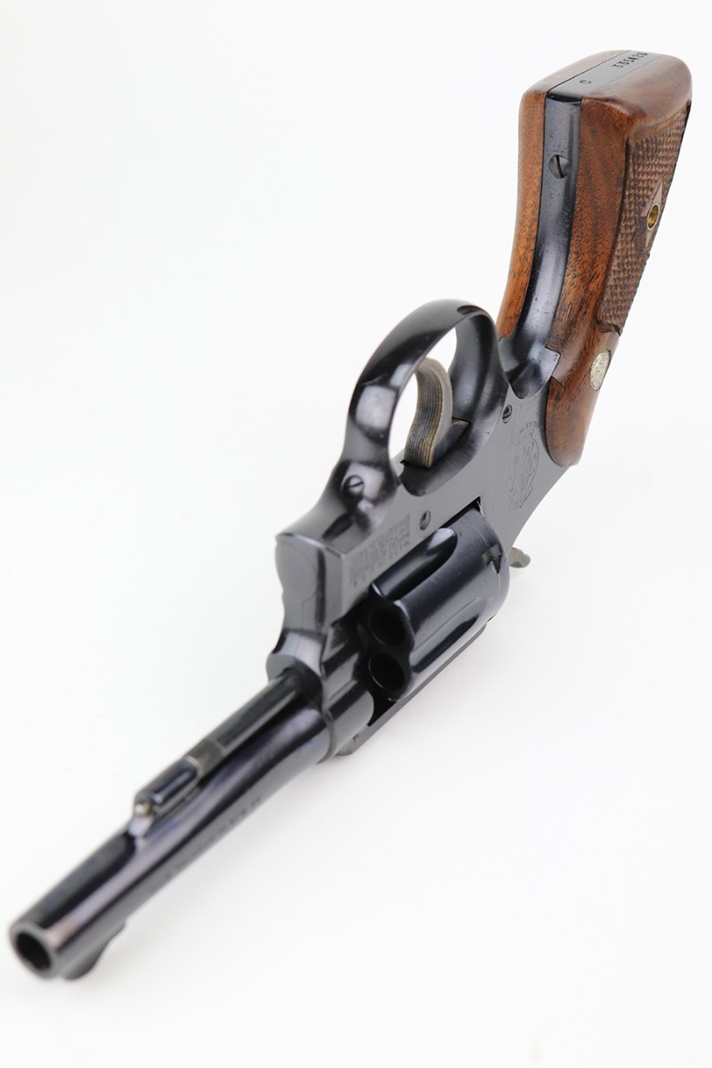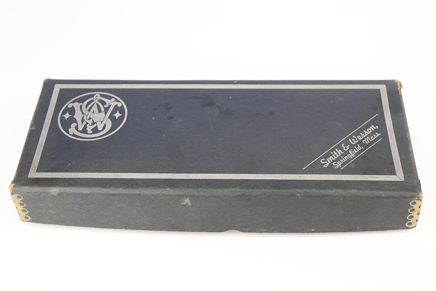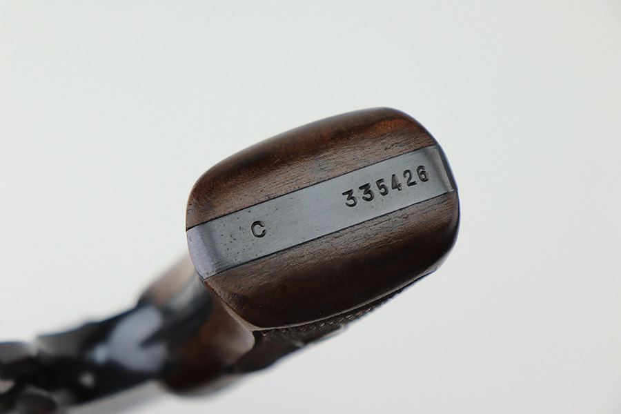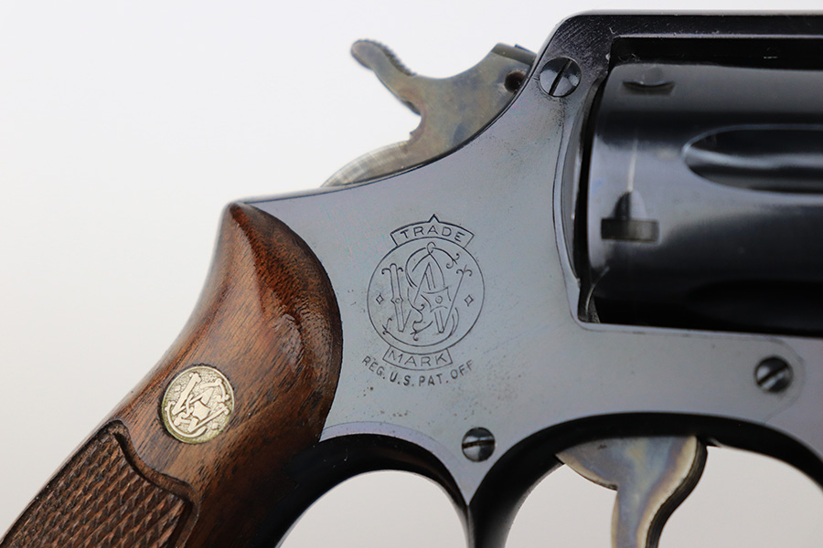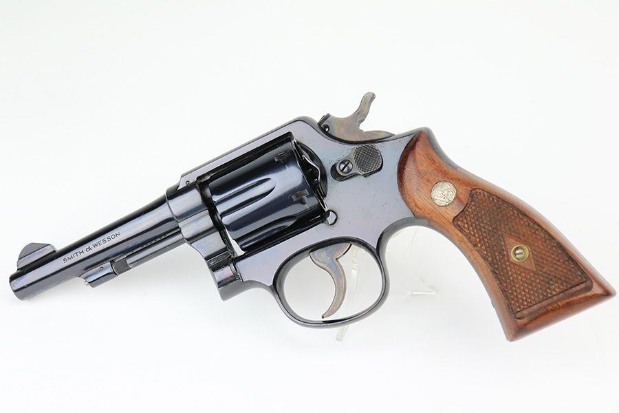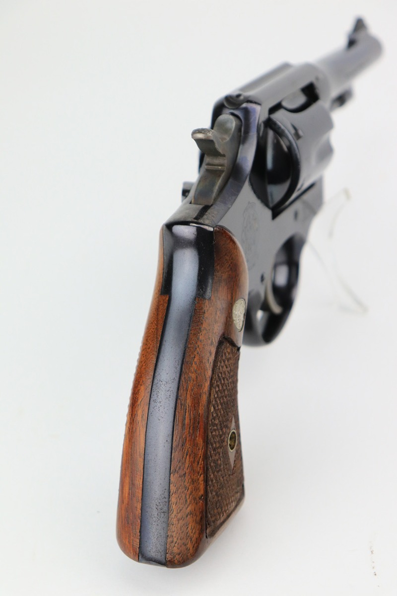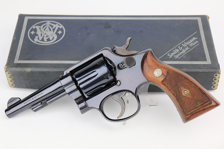 5/3/22 – This is a near-mint example of a Smith & Wesson M&P revolver manufactured around 1956. It is all matching, has a 4 inch barrel, and is chambered in .38 Special. It comes in a period-correct box that is not matching but very close in serial number. The gun itself has retained nearly all of its high polish finish with just a faint roll mark on the cylinder. Some tiny freckling on the grip straps. Excellent case-hardening on the small parts. Comes with minty walnut grips. Mint bore. The cylinder is tight, and the action is very smooth.