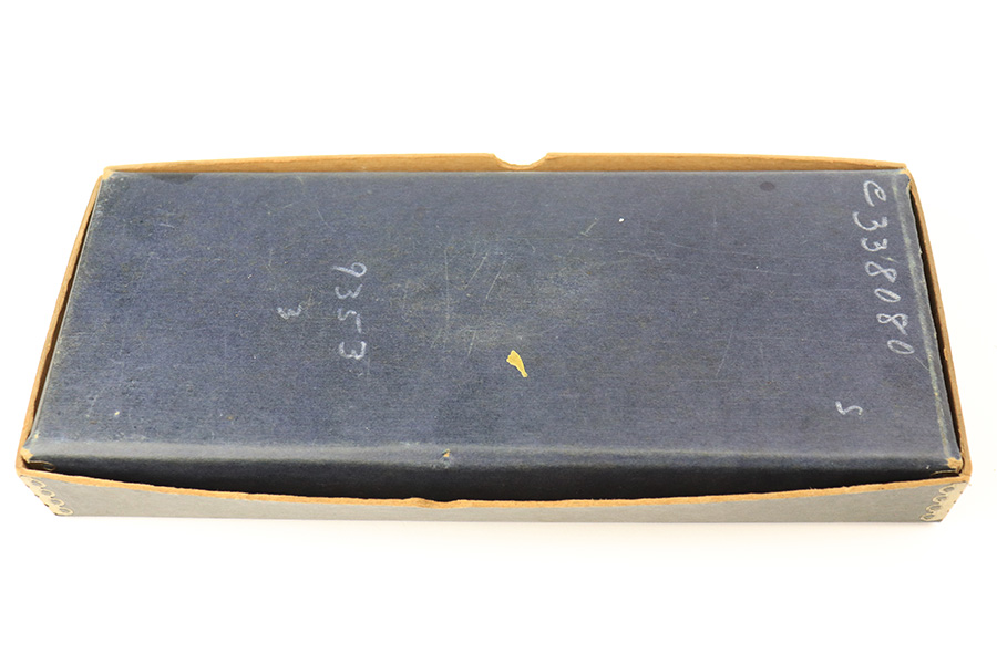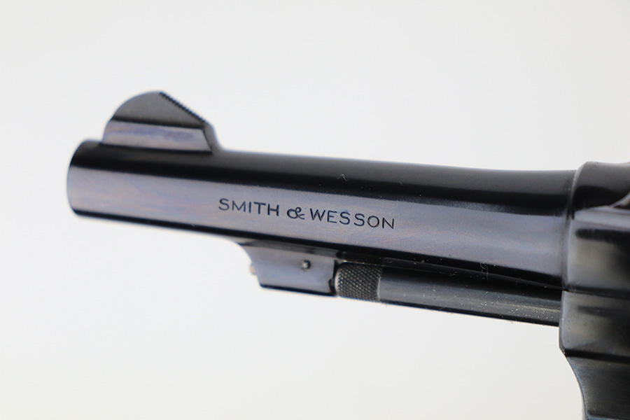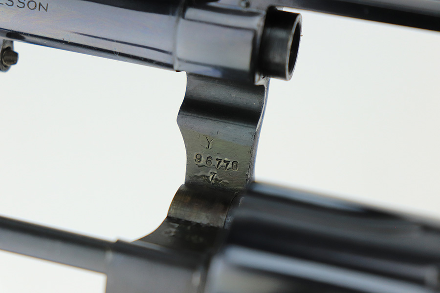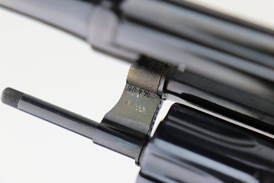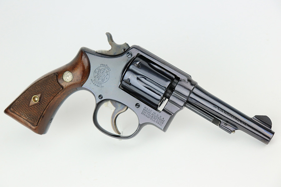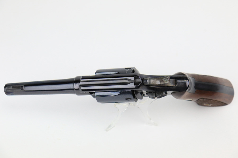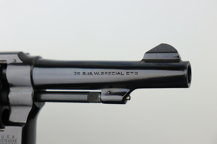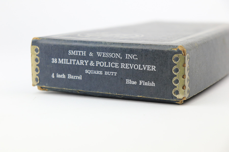 5/3/22 – This is a near-mint example of a Smith & Wesson M&P revolver manufactured around 1956. It is all matching, has a 4 inch barrel, and is chambered in .38 Special. It comes in a period-correct box that is not matching but very close in serial number. The gun itself has retained nearly all of its high polish finish with just a faint roll mark on the cylinder. Some tiny freckling on the grip straps. Excellent case-hardening on the small parts. Comes with minty walnut grips. Mint bore. The cylinder is tight, and the action is very smooth.