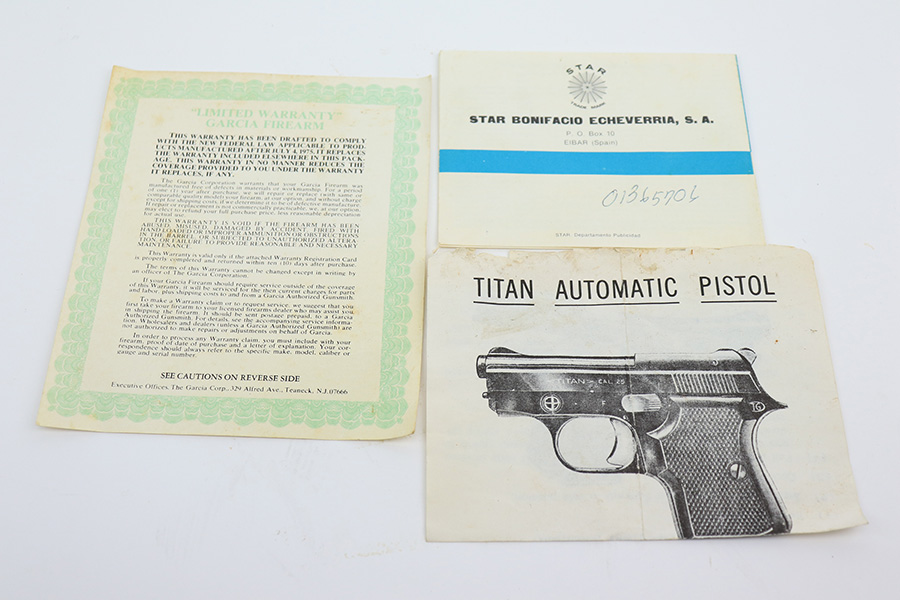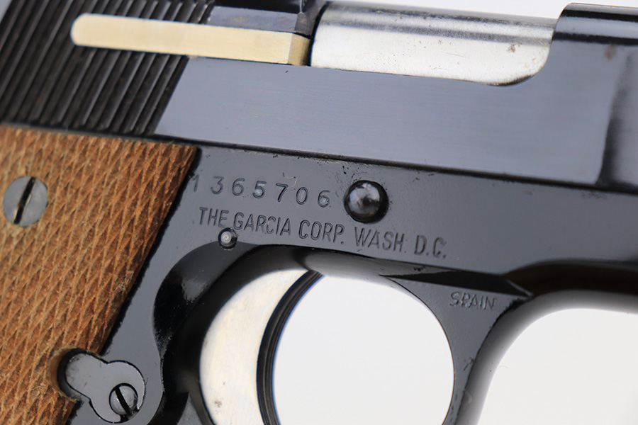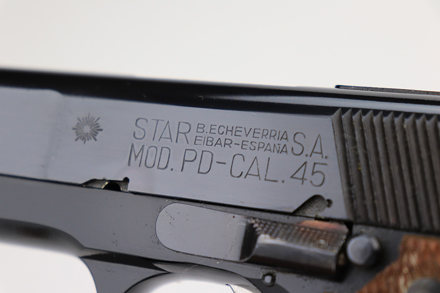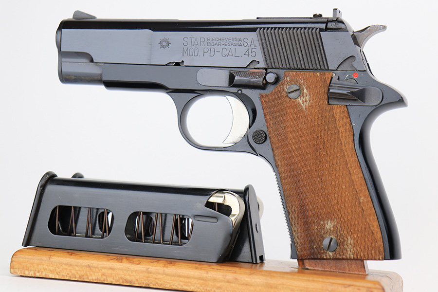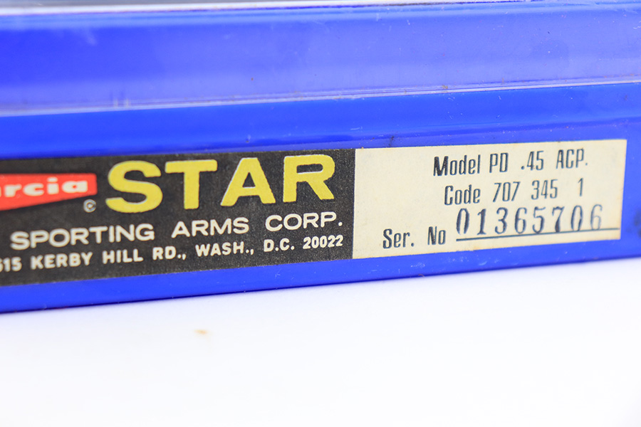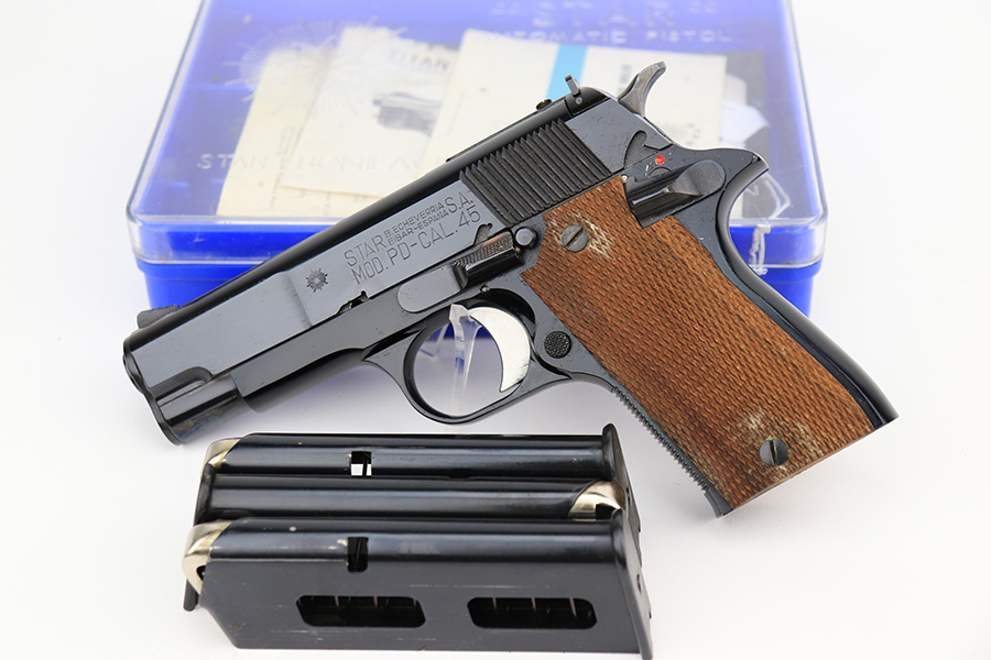 5/4/23 – This is a minty example of a Spanish Star Model PD chambered in .45 ACP. It is all matching and has the proper Spanish proofs under the left grip panel. From the “T1” date code, it was manufactured in 1975. Import mark on the right side of the frame. It comes with its original matching plastic box, owners manual, sales papers, and three proper magazines. The gun itself has retained essentially all of its original finish, but there are a few small spots of oxidation on the right side of the slide and on the top of the rear sight housing. Fitted with excellent wood grips. Mint bore.