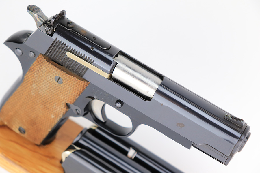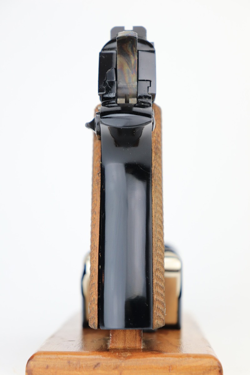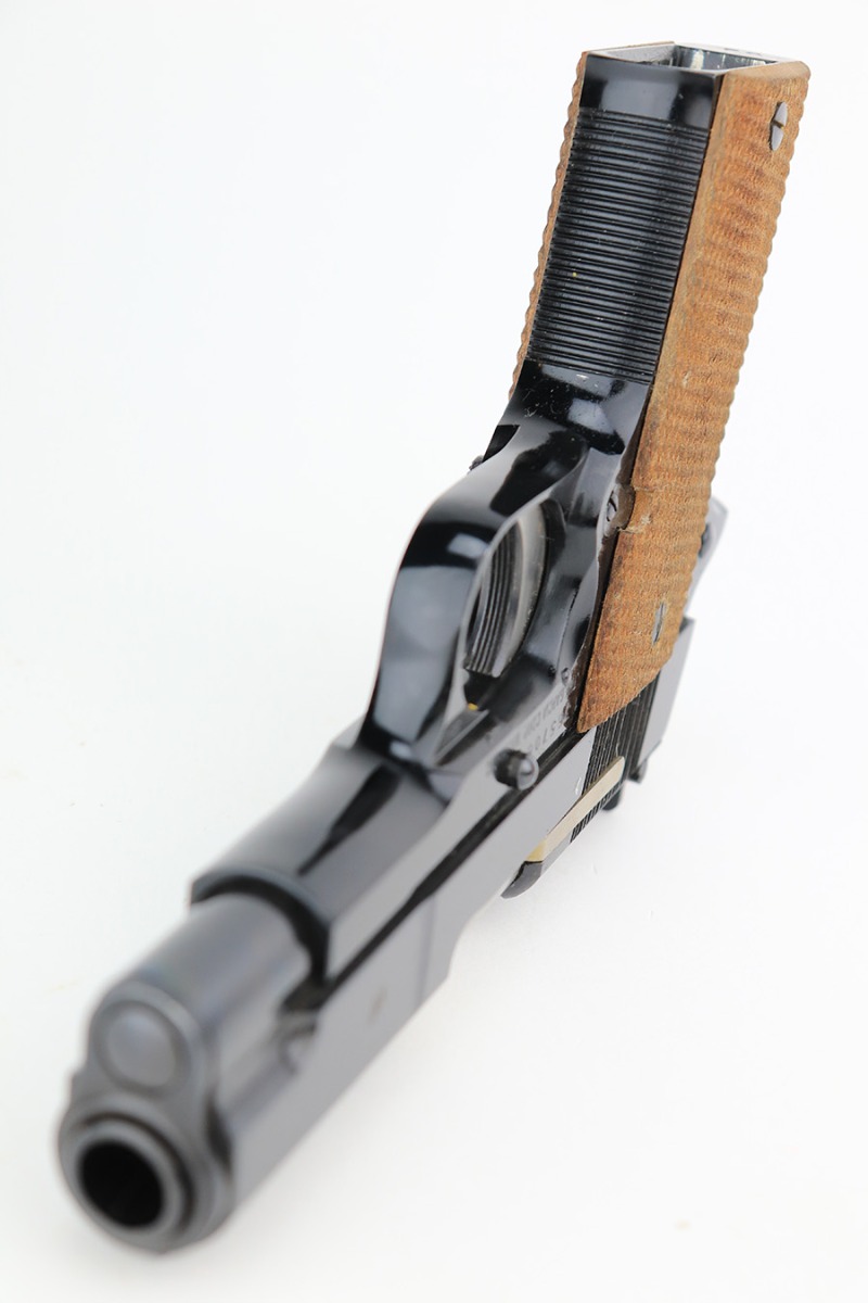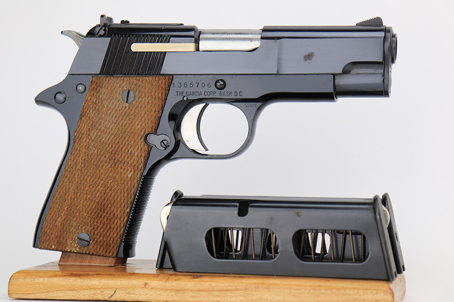 5/4/23 – This is a minty example of a Spanish Star Model PD chambered in .45 ACP. It is all matching and has the proper Spanish proofs under the left grip panel. From the “T1” date code, it was manufactured in 1975. Import mark on the right side of the frame. It comes with its original matching plastic box, owners manual, sales papers, and three proper magazines. The gun itself has retained essentially all of its original finish, but there are a few small spots of oxidation on the right side of the slide and on the top of the rear sight housing. Fitted with excellent wood grips. Mint bore.