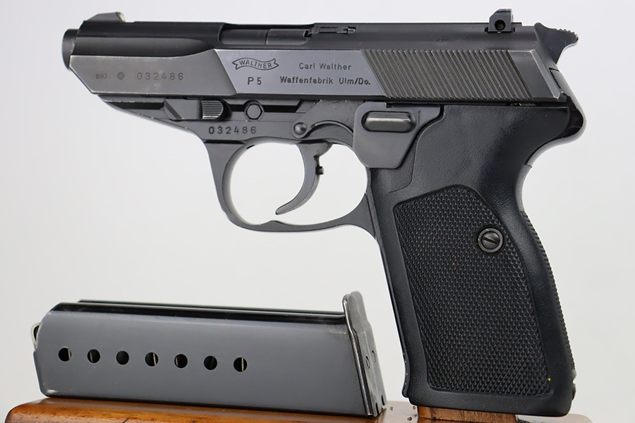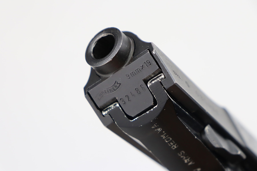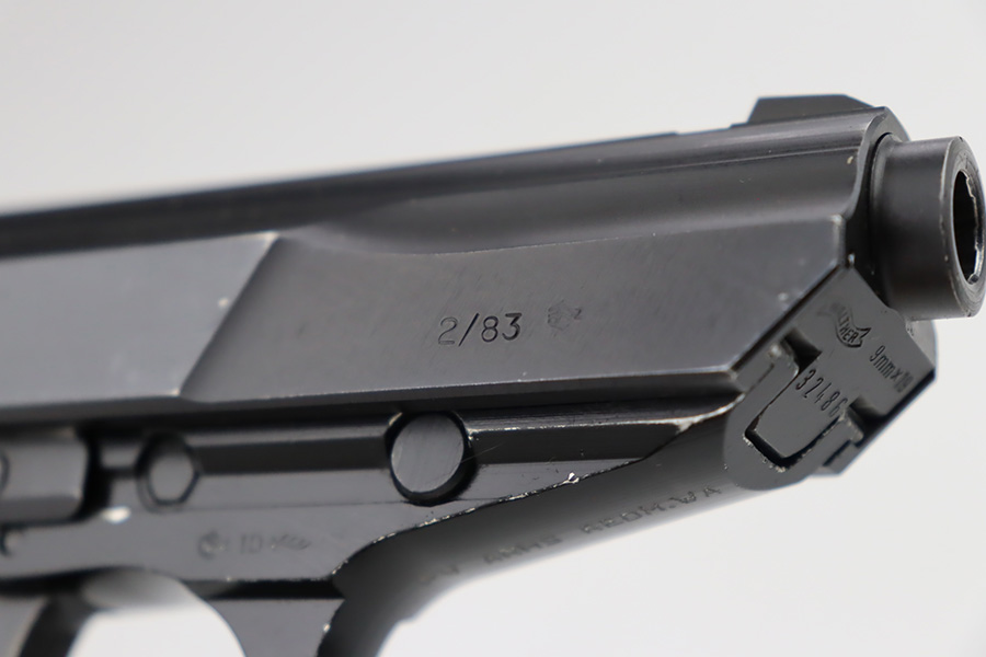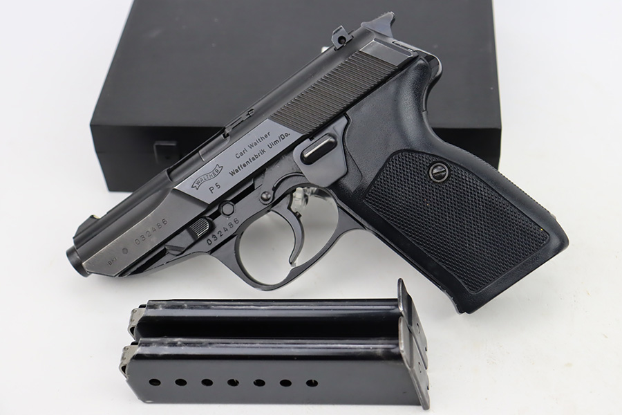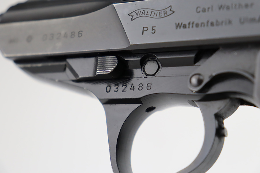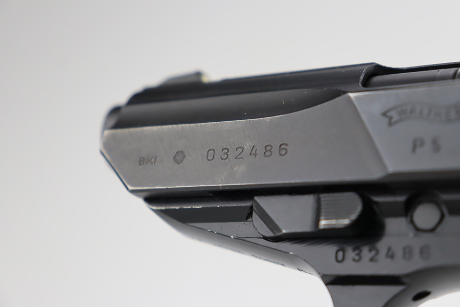9/27/23 – This is a minty example of a Walther P5 manufactured in 1983. All matching with the proper proofs, but there is an import mark on the underside of the frame. This one is also marked “BMI” on the slide, indicating it was issued to the “Bundesministerium des Innern” or the Federal Ministry of the Interior. The “BMI” marking has a light hash mark through it. The gun comes in a period-correct box (not matching), two P5 magazines, a cleaning rod, and an owners manual. The gun itself has retained most of its original finish with hints of wear on some of the high edges. Excellent black plastic grips. Mint bore.