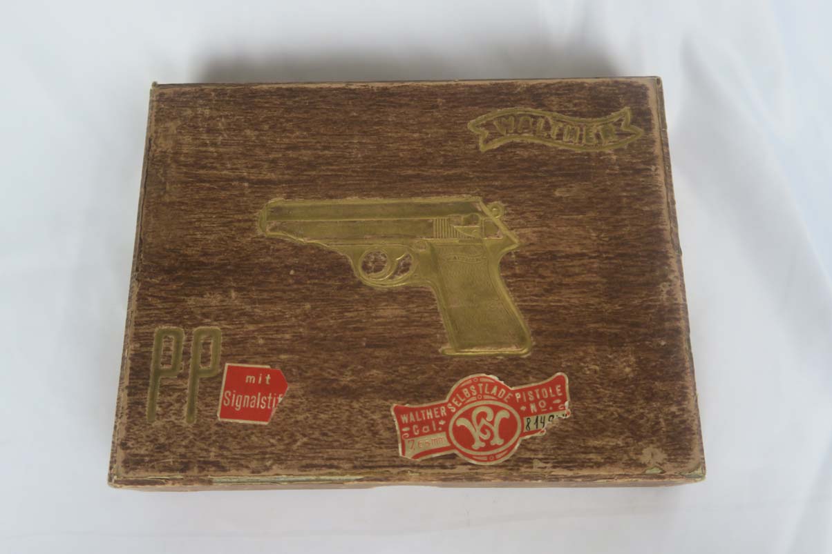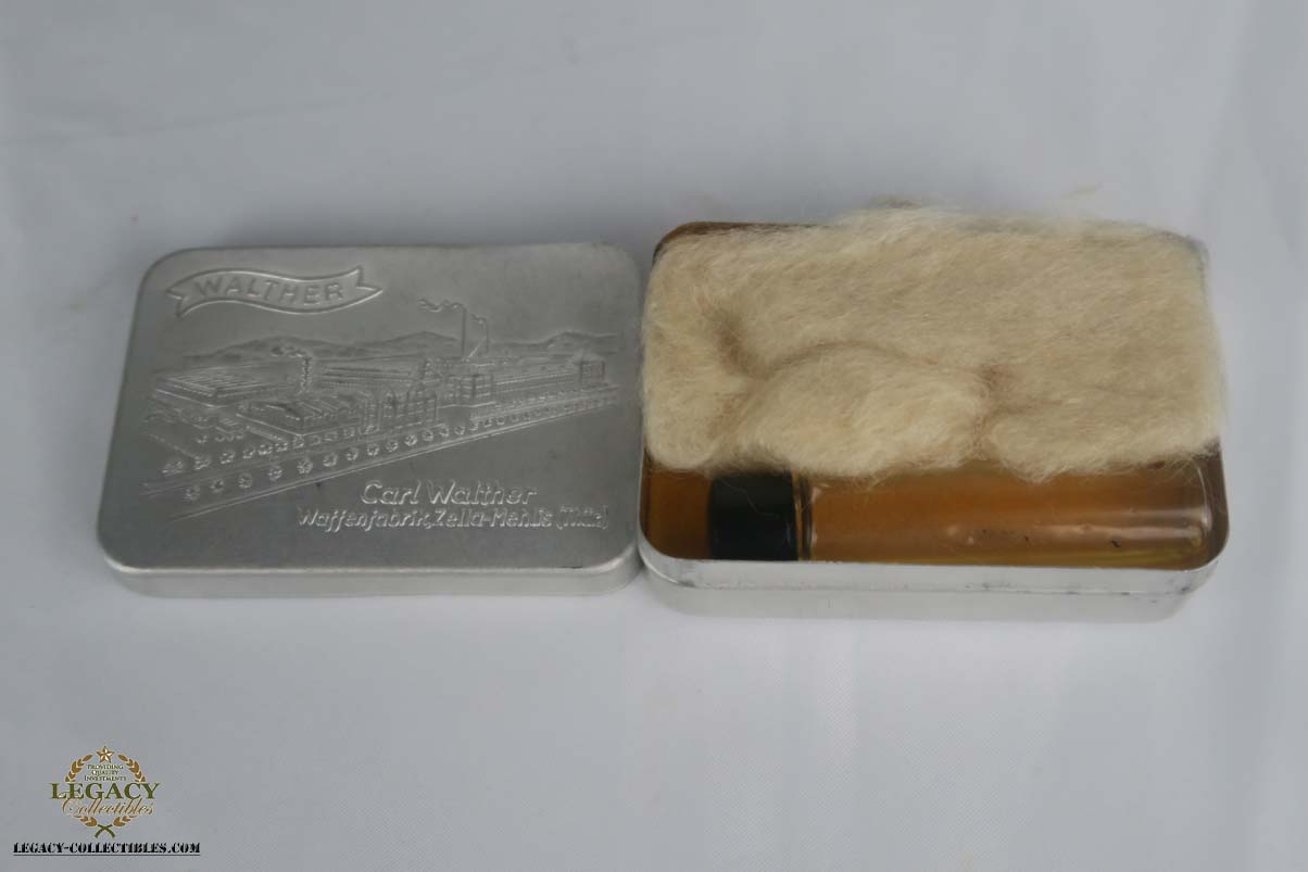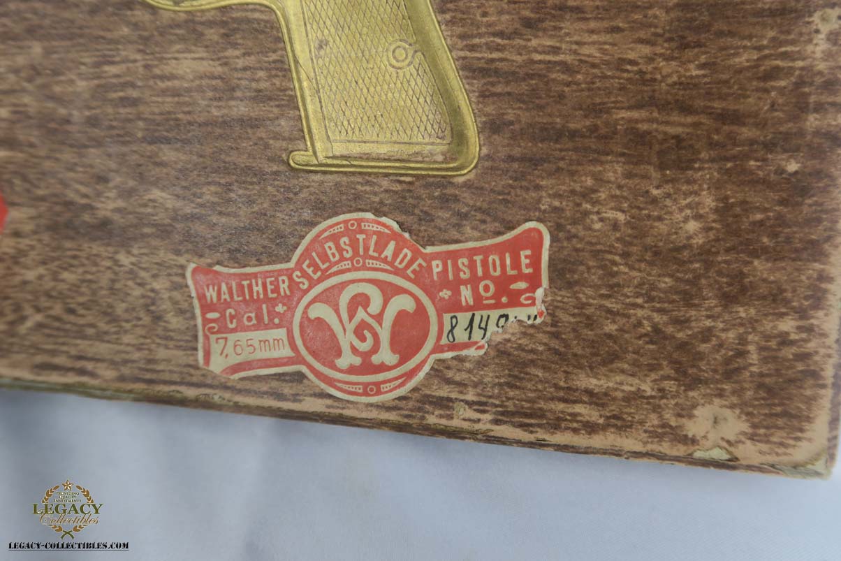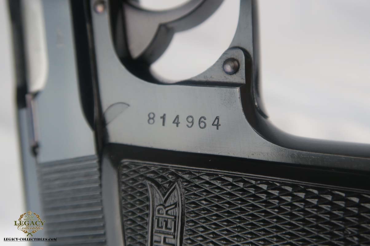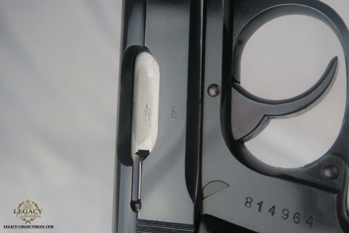5/22/17 – This is a minty Walther PP in 7.65 caliber. The original finish approaches 100%, with just a minor spot of the wear on the bottom of the back strap. All correct and original. It came in what I believe is the original box. As you can see, the original “bow tie” label has the last 2 digits torn away, but the serial is also written inside. For these early guns, the handwritten numbering IS correct. Comes with an early style tin, with original contents(oil and cleaning rag). Also includes the original dummy rounds and the cleaning rod. A pre-war original manual is included. The box is also excellent with the exception of the torn label. Minty magazine, grips and bore.