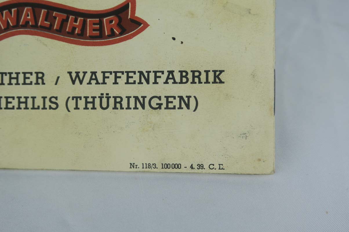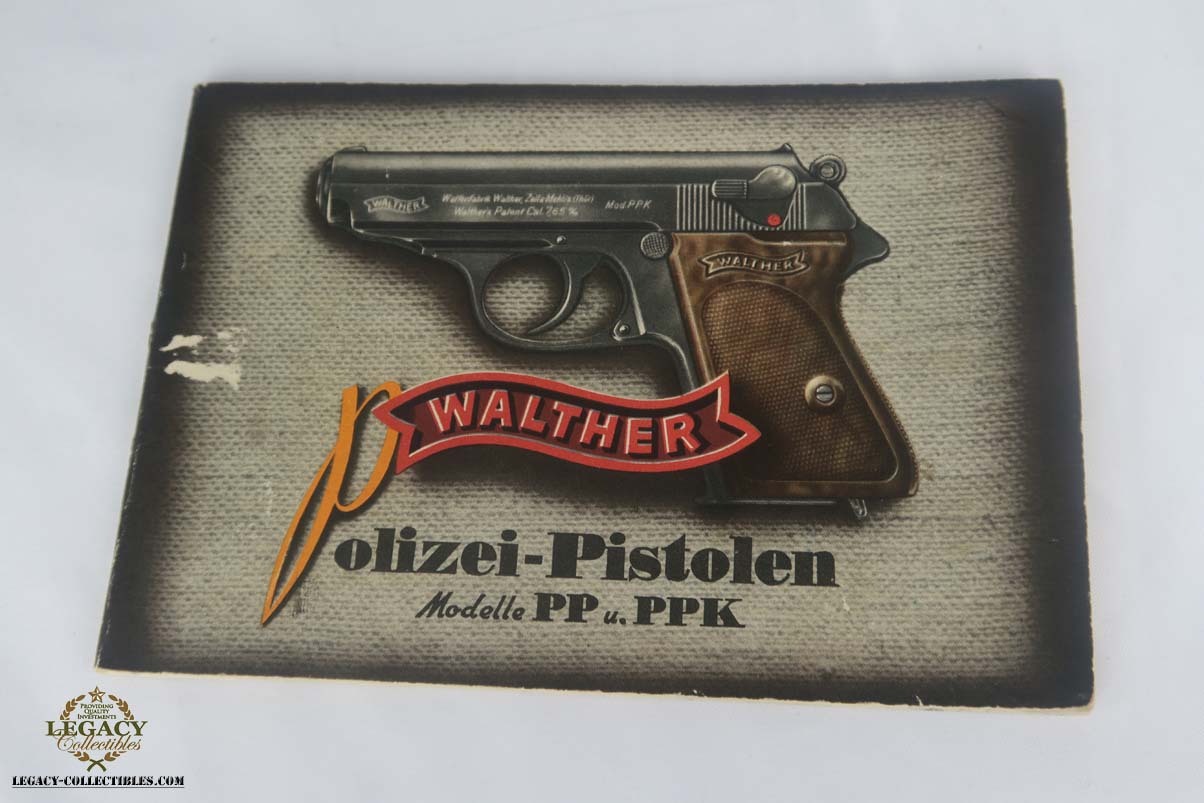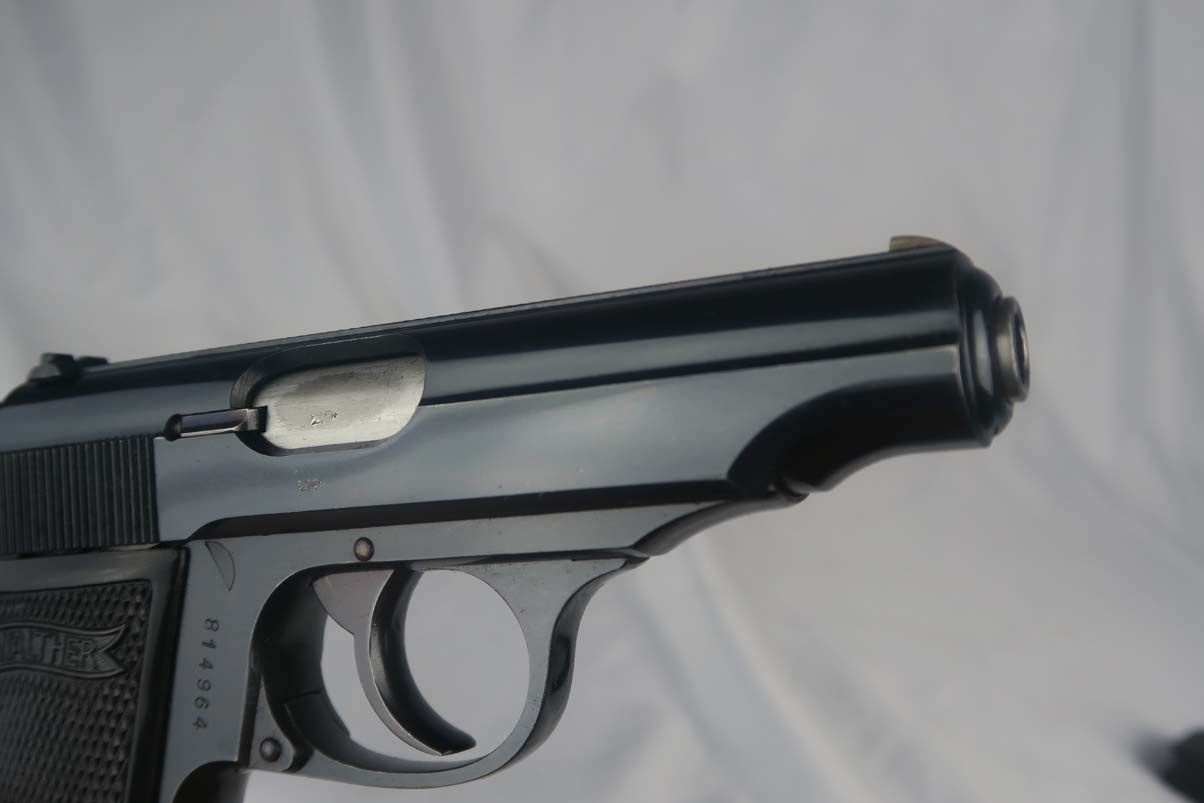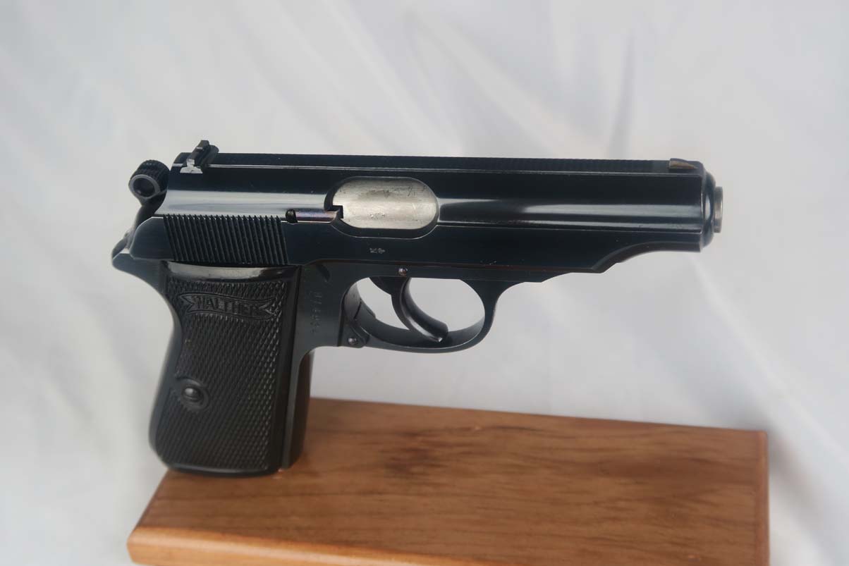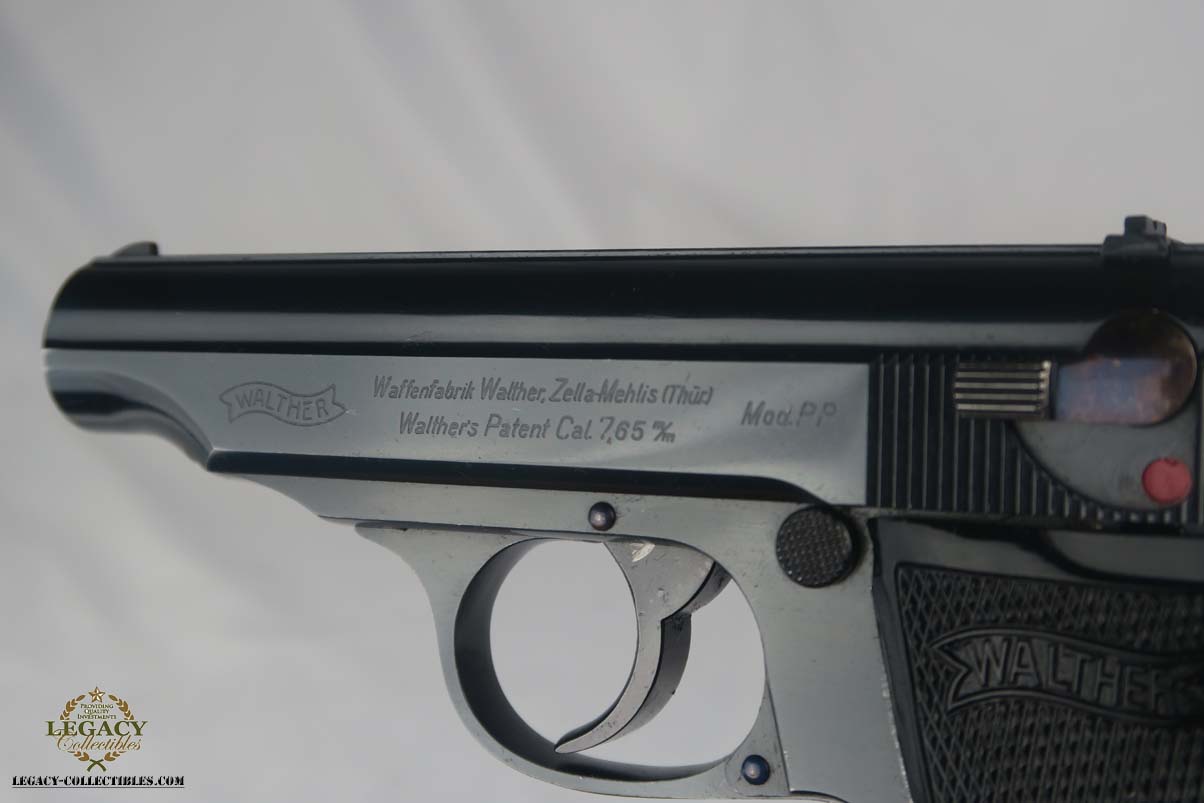 5/22/17 – This is a minty Walther PP in 7.65 caliber. The original finish approaches 100%, with just a minor spot of the wear on the bottom of the back strap. All correct and original. It came in what I believe is the original box. As you can see, the original “bow tie” label has the last 2 digits torn away, but the serial is also written inside. For these early guns, the handwritten numbering IS correct. Comes with an early style tin, with original contents(oil and cleaning rag). Also includes the original dummy rounds and the cleaning rod. A pre-war original manual is included. The box is also excellent with the exception of the torn label. Minty magazine, grips and bore.