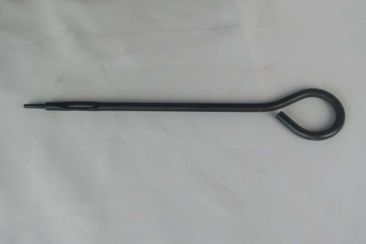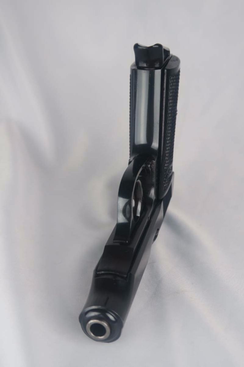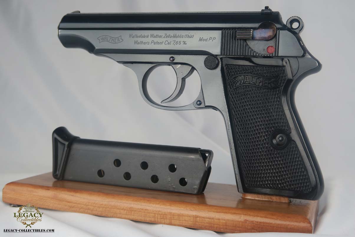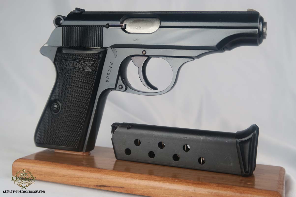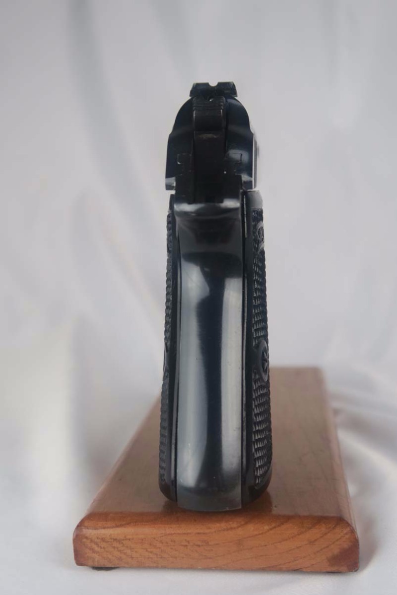 5/22/17 – This is a minty Walther PP in 7.65 caliber. The original finish approaches 100%, with just a minor spot of the wear on the bottom of the back strap. All correct and original. It came in what I believe is the original box. As you can see, the original “bow tie” label has the last 2 digits torn away, but the serial is also written inside. For these early guns, the handwritten numbering IS correct. Comes with an early style tin, with original contents(oil and cleaning rag). Also includes the original dummy rounds and the cleaning rod. A pre-war original manual is included. The box is also excellent with the exception of the torn label. Minty magazine, grips and bore.