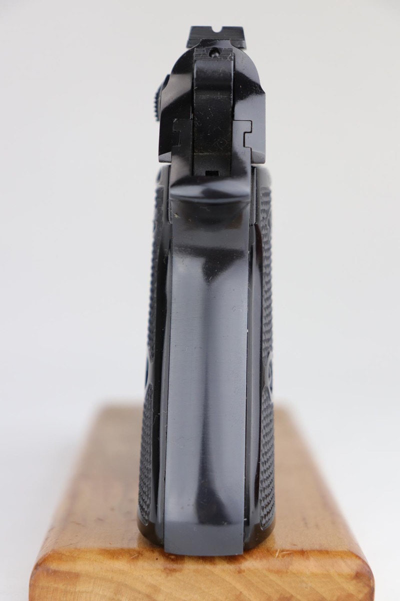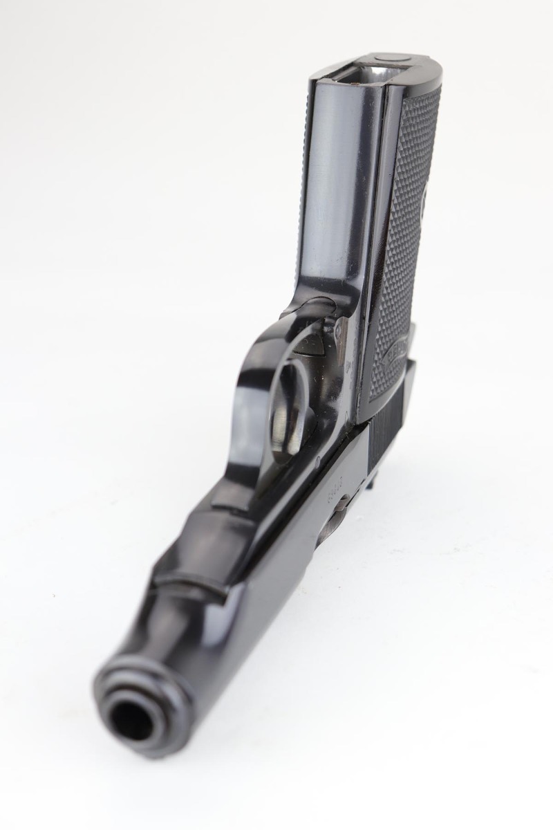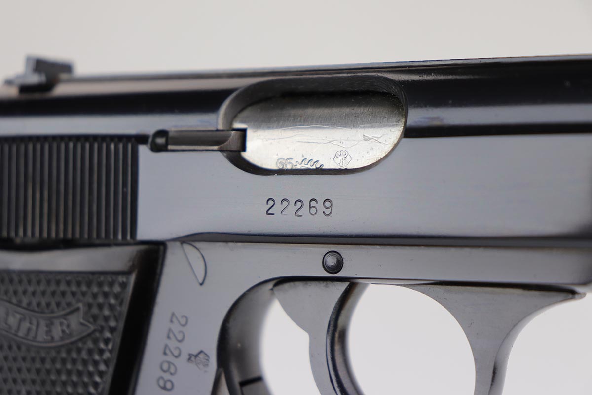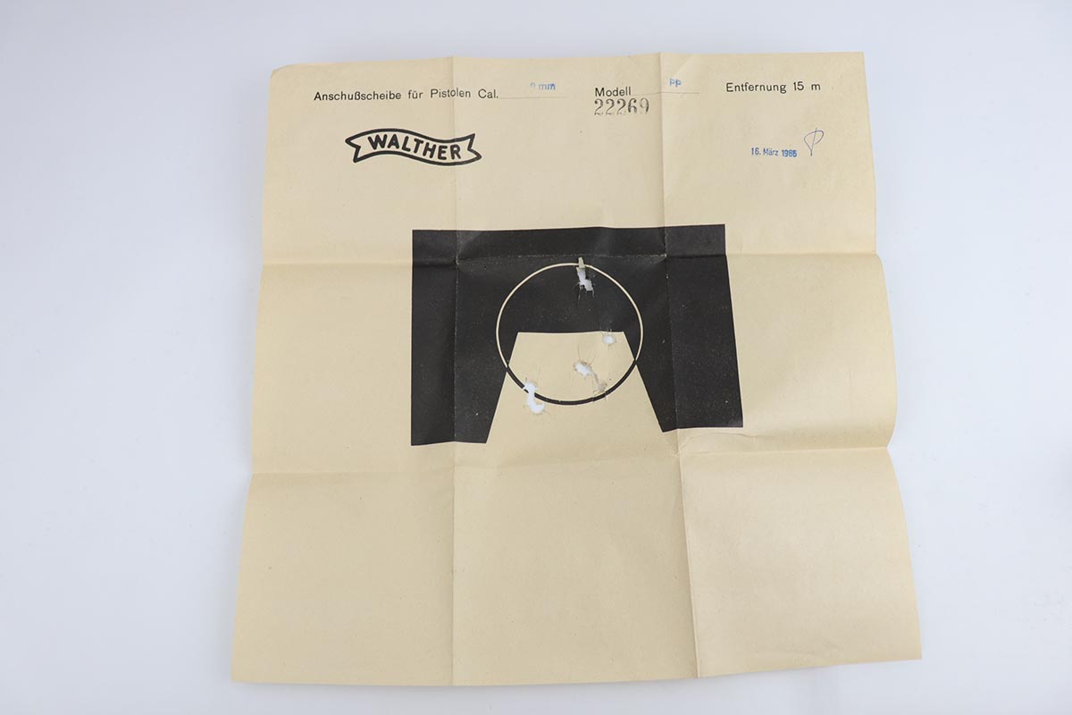 2/25/20 – This is a minty Walther PP in the original matching box, with manual, cleaning rod and matching test target. The pistol is dated to 1966, so C&R eligible. It has 99+% of the original blue, with just a tiny spot of finish loss on the left side of the muzzle. Mint bore and grips. Finger extension magazine. The box and test target are both numbered to the pistol. No import marks.