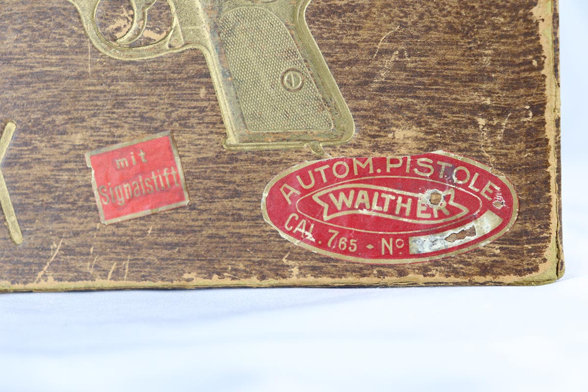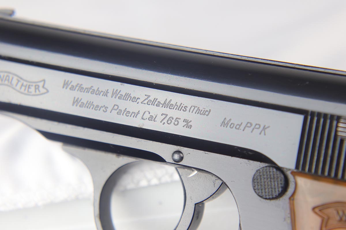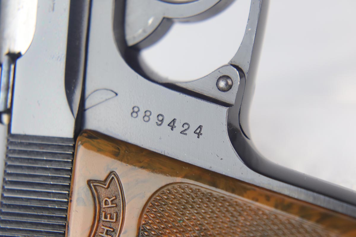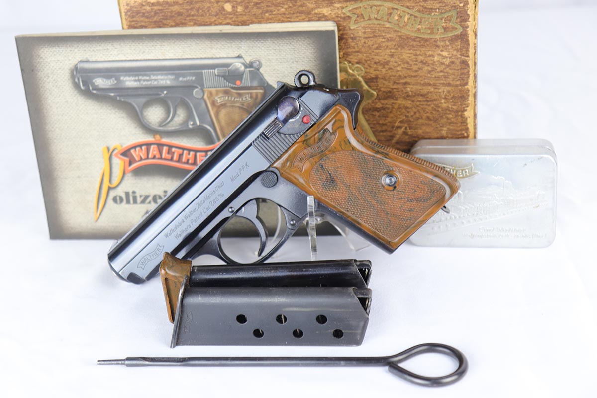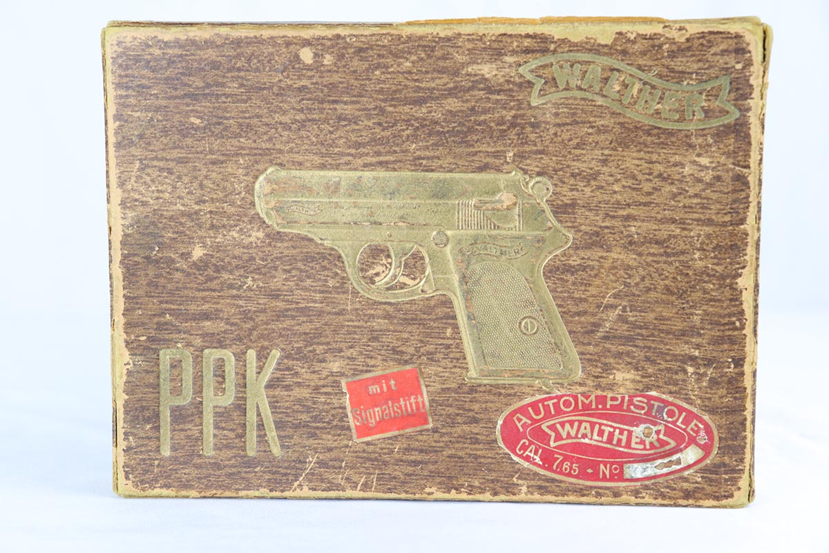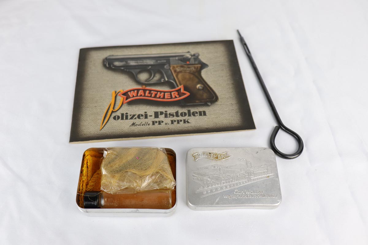 10/1/18 – This is a mint PPK from the pre-war, high-polish blue era. Manufactured in 1935, it has the early 90 degree safety and has matching slide and frame. The original finish of the gun has almost no wear on it. It comes with an early (pink interior) Walther PPK box. I wish I could tell you it is matching but the full number is worn or scratched off. The box contents alone add $800 – $1000 of value to the gun if you add up the sum of the parts: original cleaning rod, original cleaning tin with original contents, correct spare magazine, and the early original manual dated 1936. Pistol has mint bore.