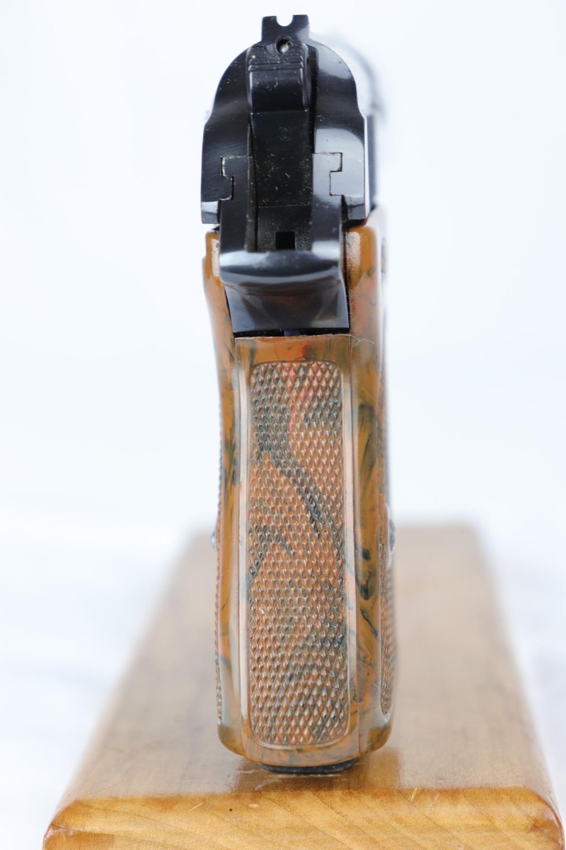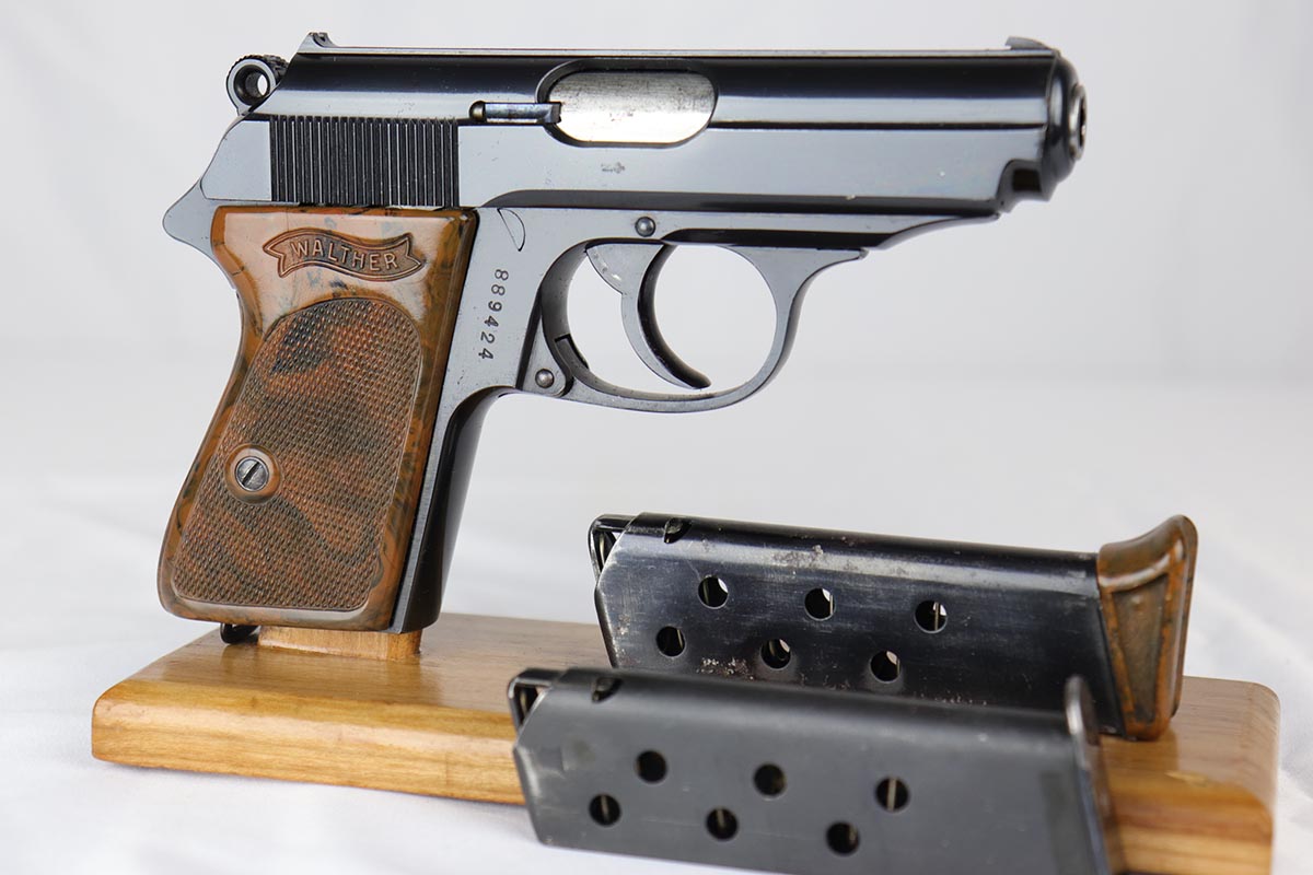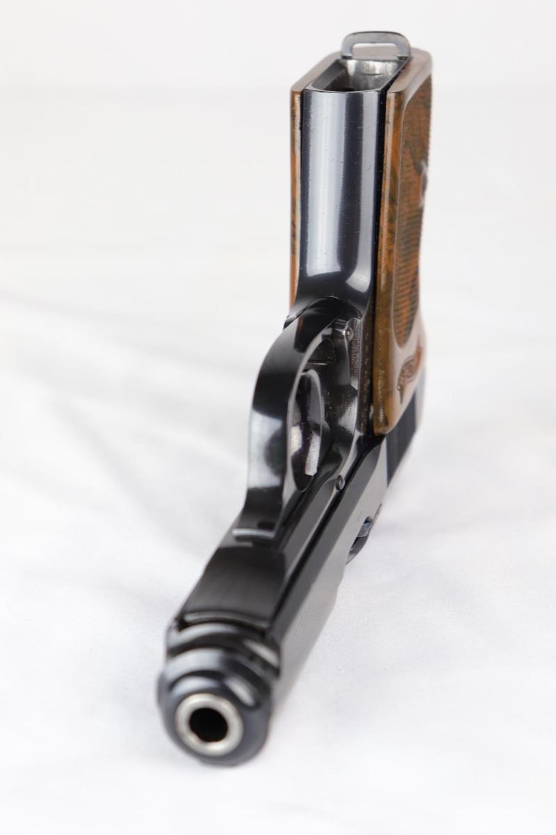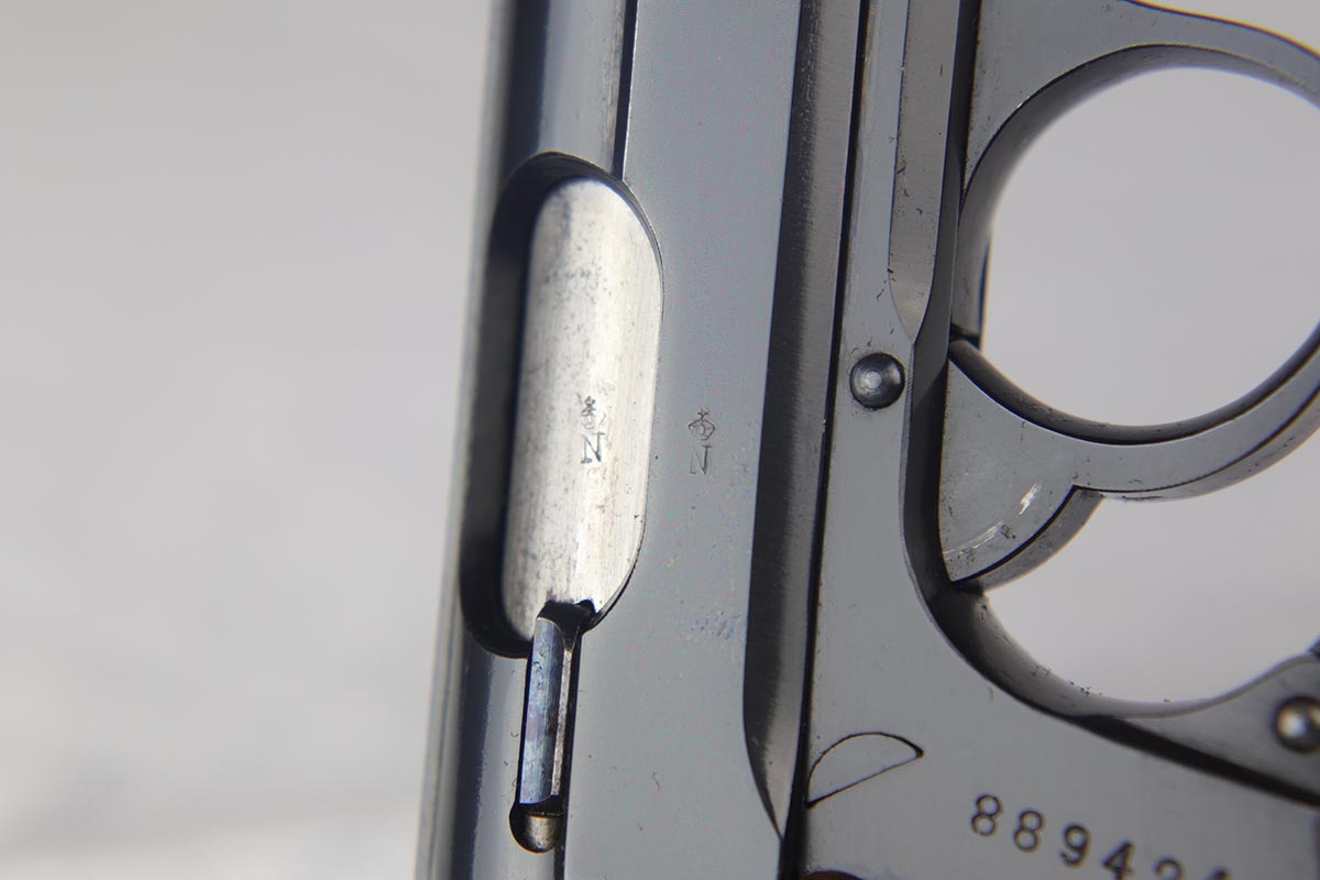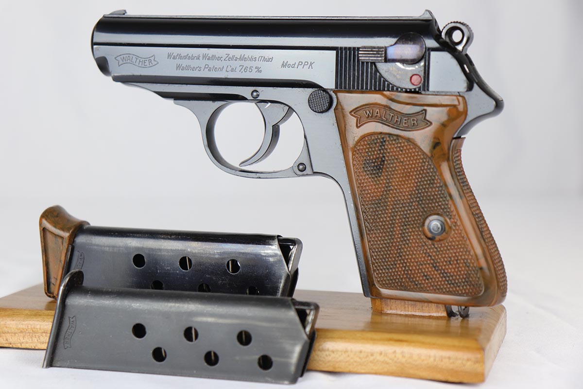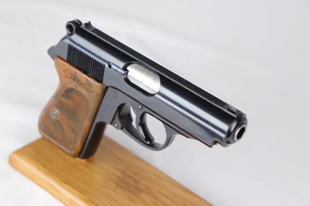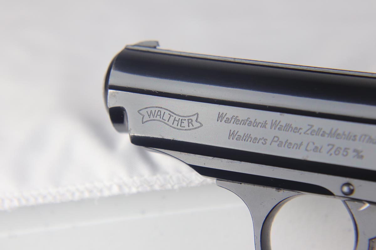 10/1/18 – This is a mint PPK from the pre-war, high-polish blue era. Manufactured in 1935, it has the early 90 degree safety and has matching slide and frame. The original finish of the gun has almost no wear on it. It comes with an early (pink interior) Walther PPK box. I wish I could tell you it is matching but the full number is worn or scratched off. The box contents alone add $800 – $1000 of value to the gun if you add up the sum of the parts: original cleaning rod, original cleaning tin with original contents, correct spare magazine, and the early original manual dated 1936. Pistol has mint bore.