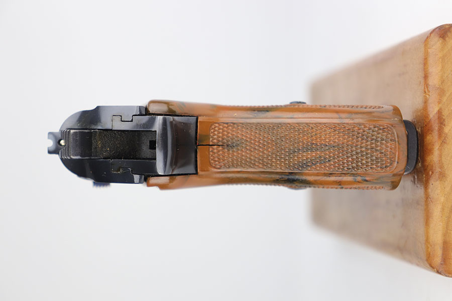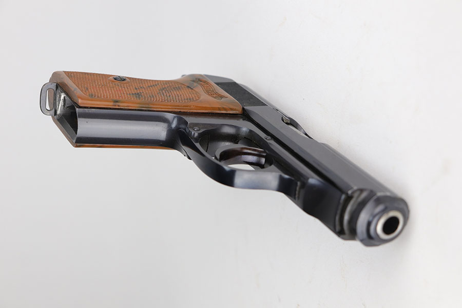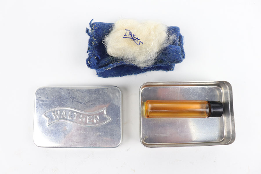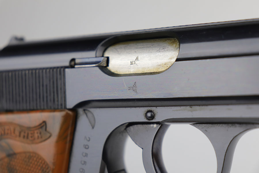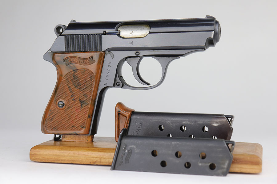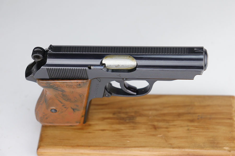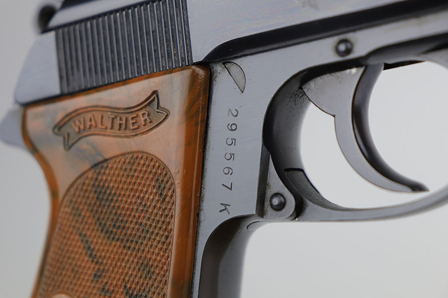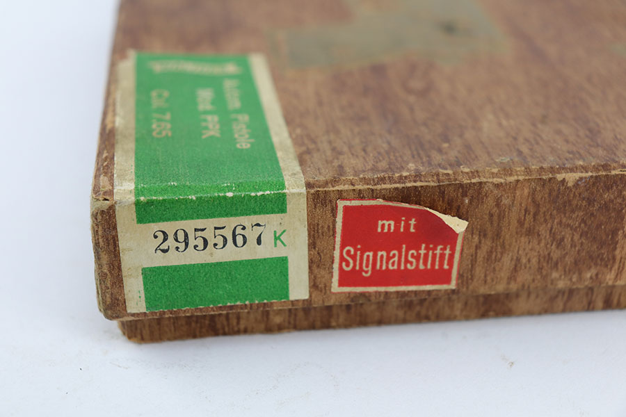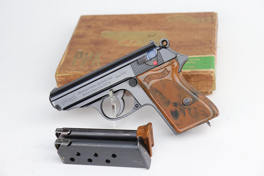 9/1/20 – This is a minty Walther PPK in its original, matching box with spare magazine, manual and cleaning tin. The pistol was made in 1940 for the German commercial market and looks brand new aside from a bit of muzzle wear on either side of the slide. Beautiful grip though it does have a couple of small stress cracks, and minty finger extension magazine. Bore hardly looks fired. Original box is numbered and matching to the gun. Original manual from December of 1936 is included. Spare magazine is flat bottom and minty condition. Original tin with just the banner logo.