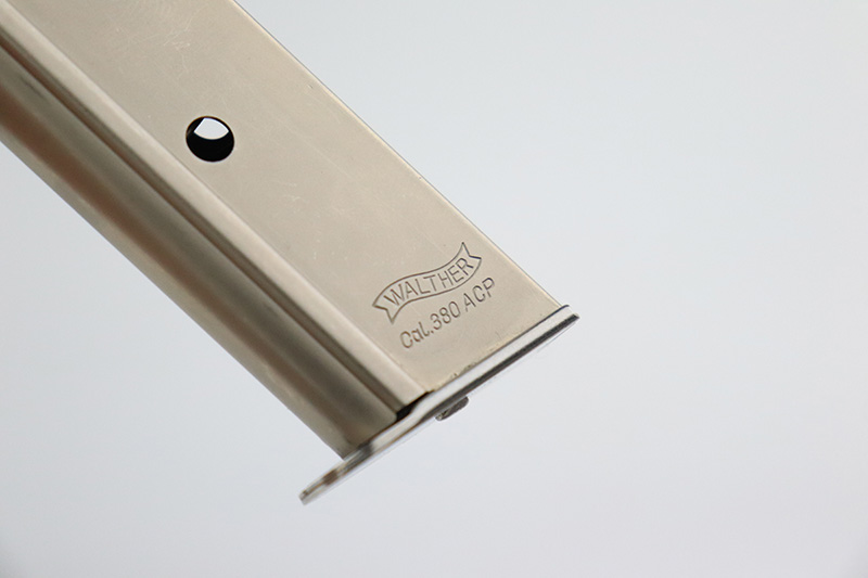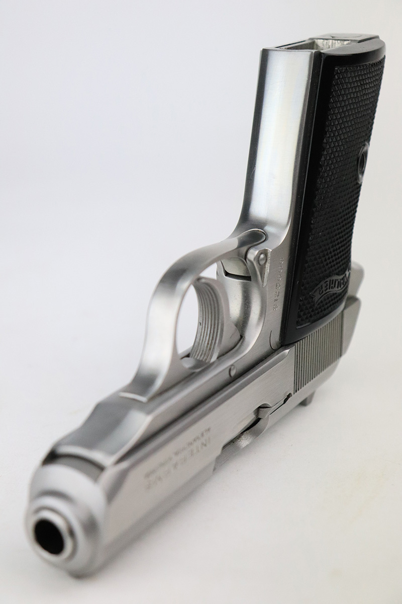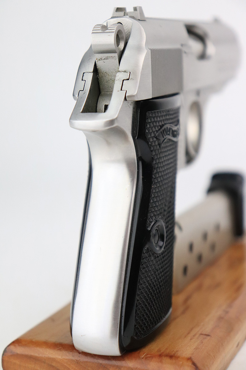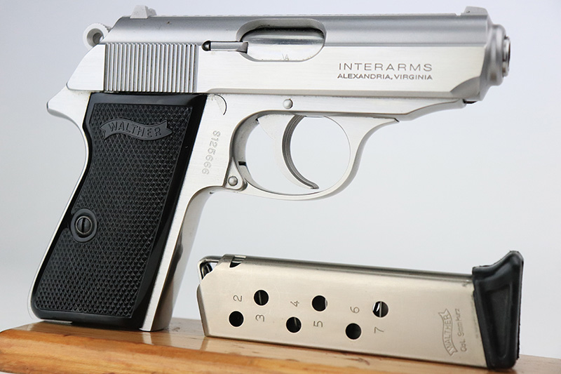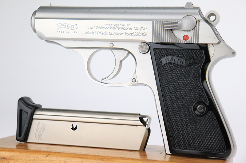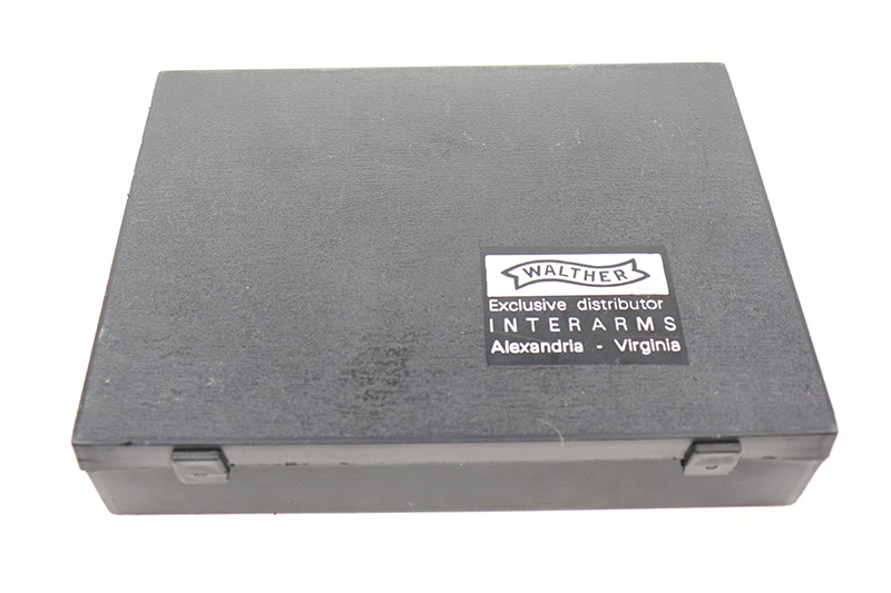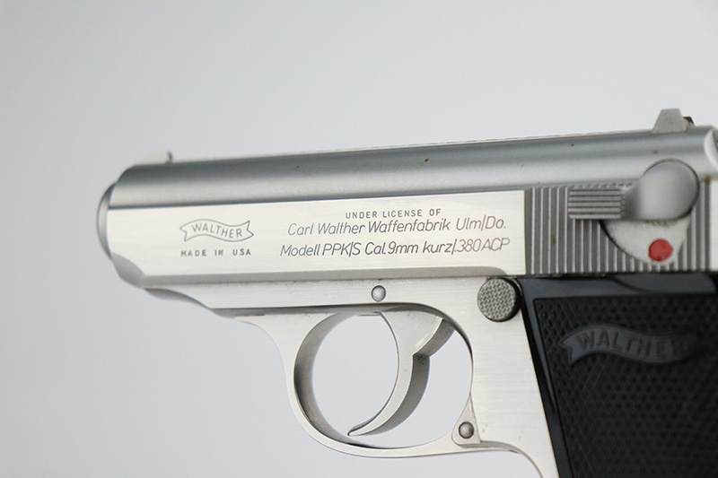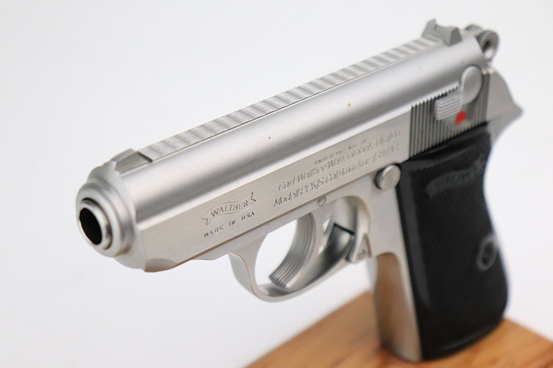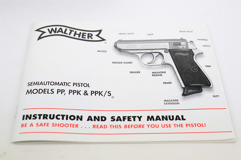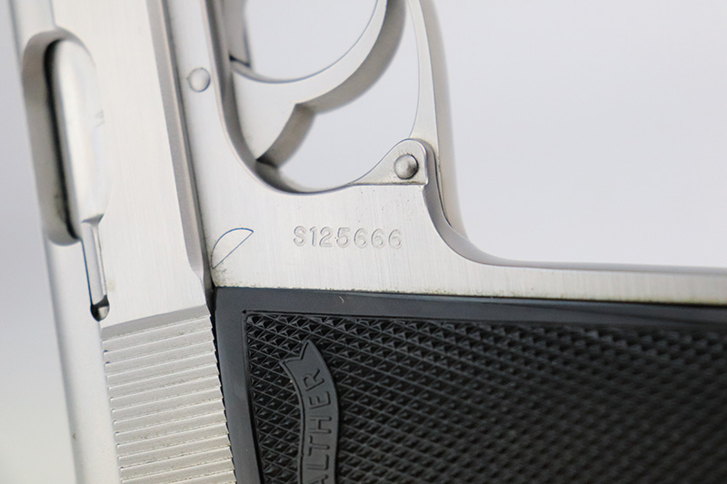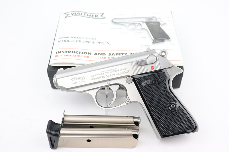 9/29/22 – This is a minty example of a Walther PPK/S manufactured mostly likely in the 1990’s and chambered in .380 ACP or 9mm Kurz. It is all matching and comes with a period-correct black plastic box (not numbered), owners manual, one flat-bottom magazine, and one finger extension magazine. It has a really nice stainless finish. There are very little signs of wear except for a some very light scratches on the grip straps and a few tiny dots of brown patina along the round edges of the slide. Comes with excellent black plastic grips. Mint bore.