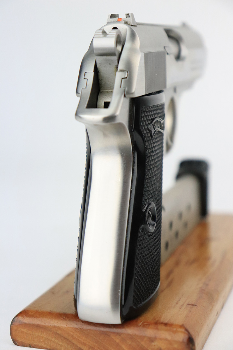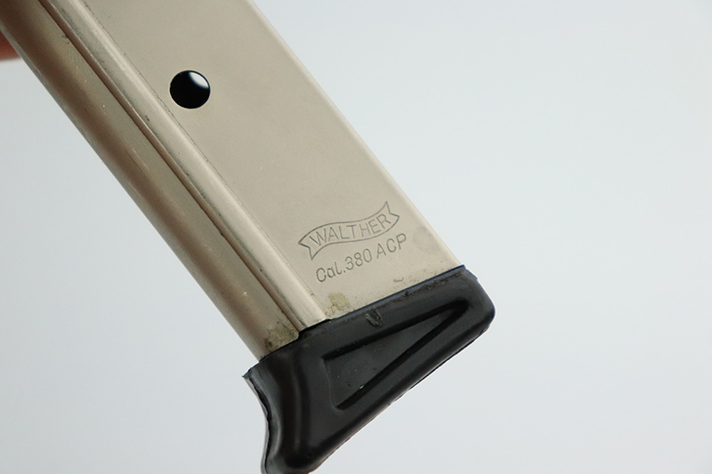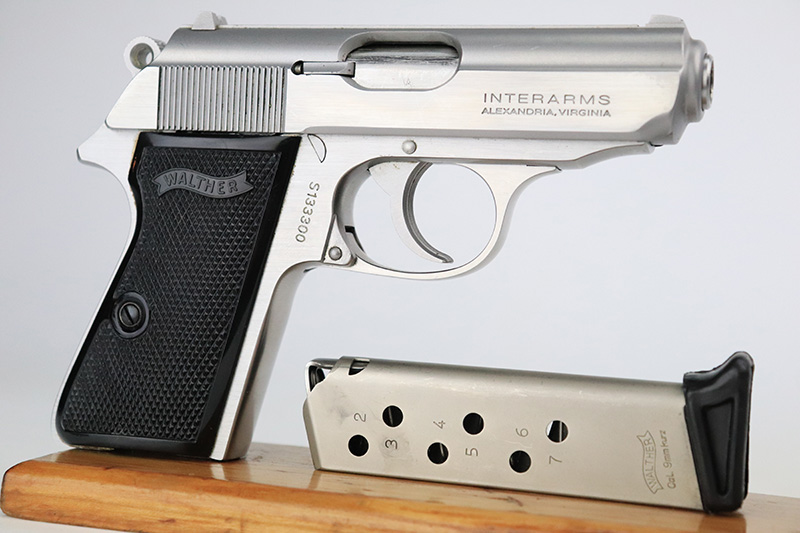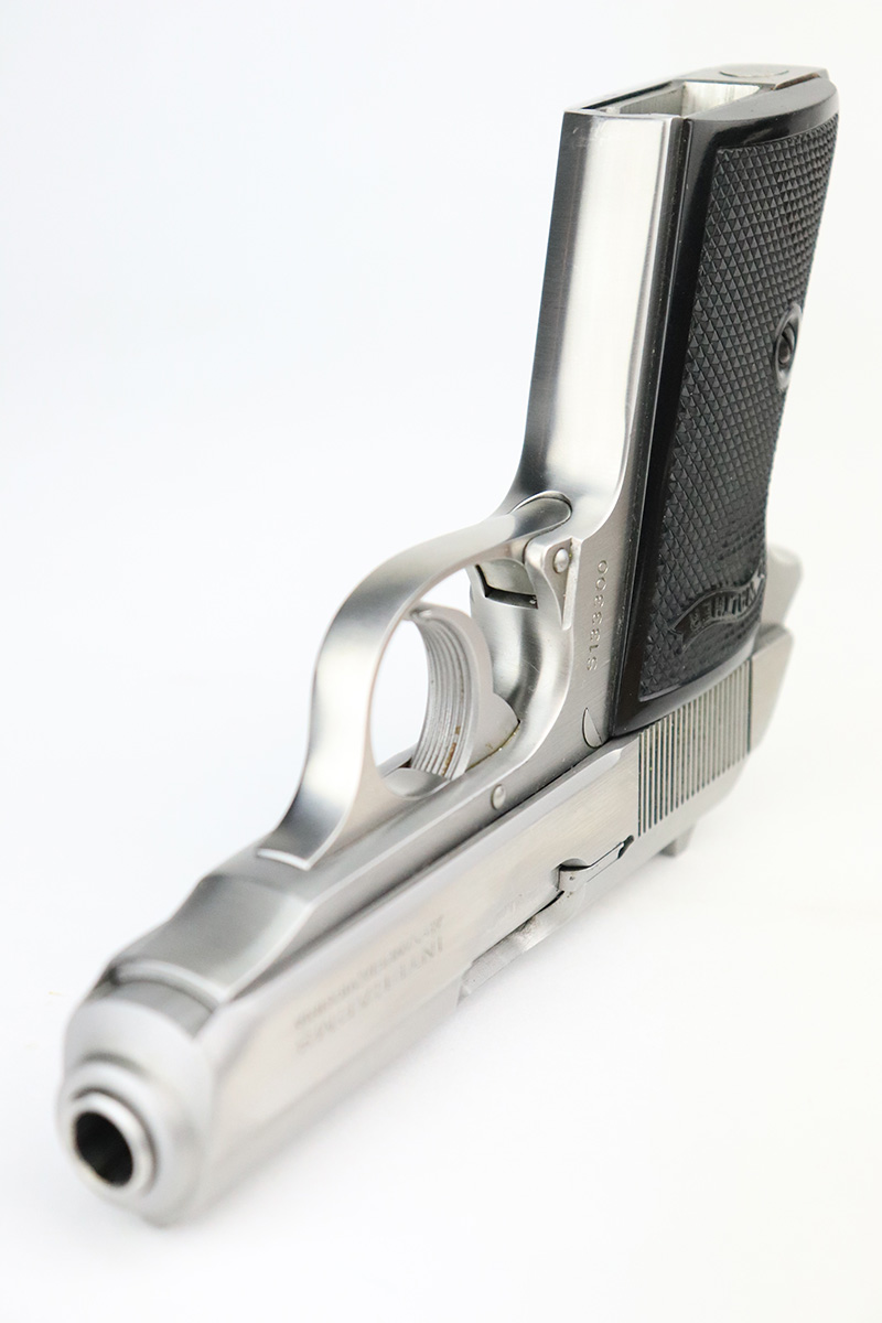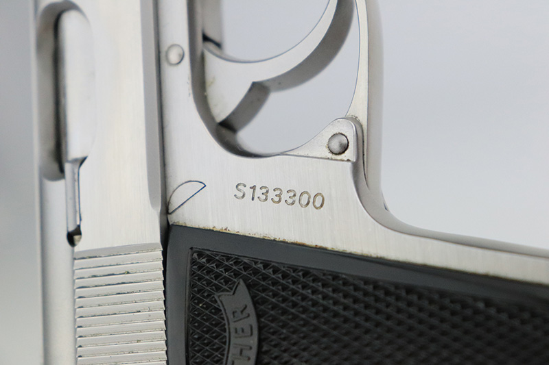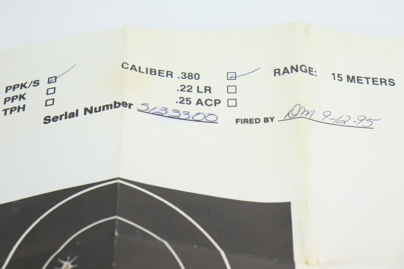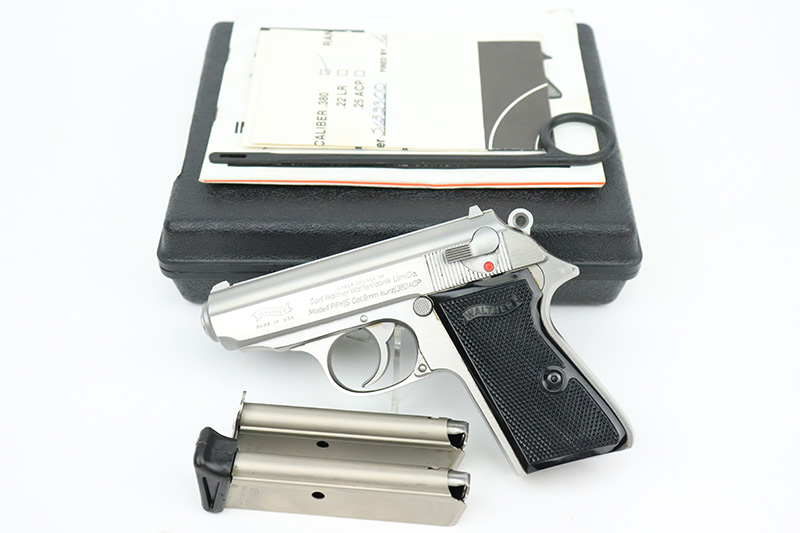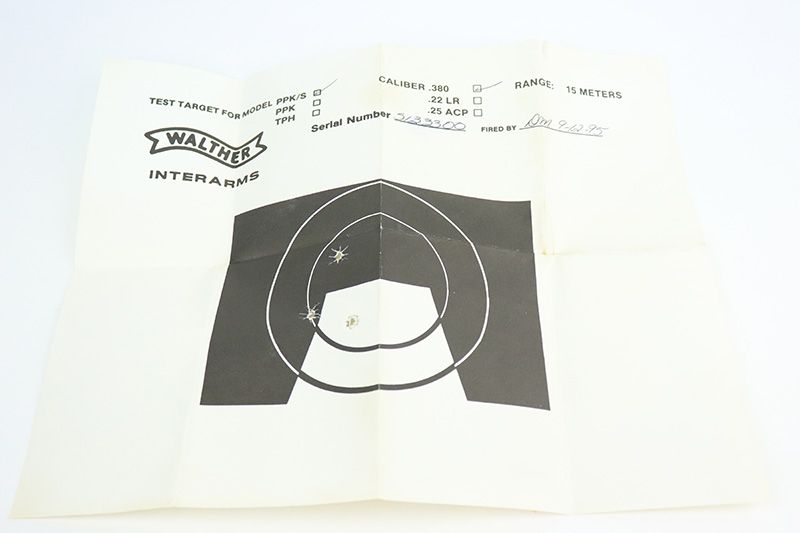 9/29/22 – This is a minty example of a Walther PPK/S manufactured in 1995 and chambered in .380 ACP or 9mm Kurz. It is all matching and comes with a matching-numbered hard case, matching-numbered test target (dated 1995), owners manual, one flat-bottom magazine, one finger extension magazine, and cleaning rod. It has a really nice stainless finish. There are very little signs of wear except for a some very light scratches on the back strap and right side of the slide. Comes with excellent black plastic grips. Minty bore.