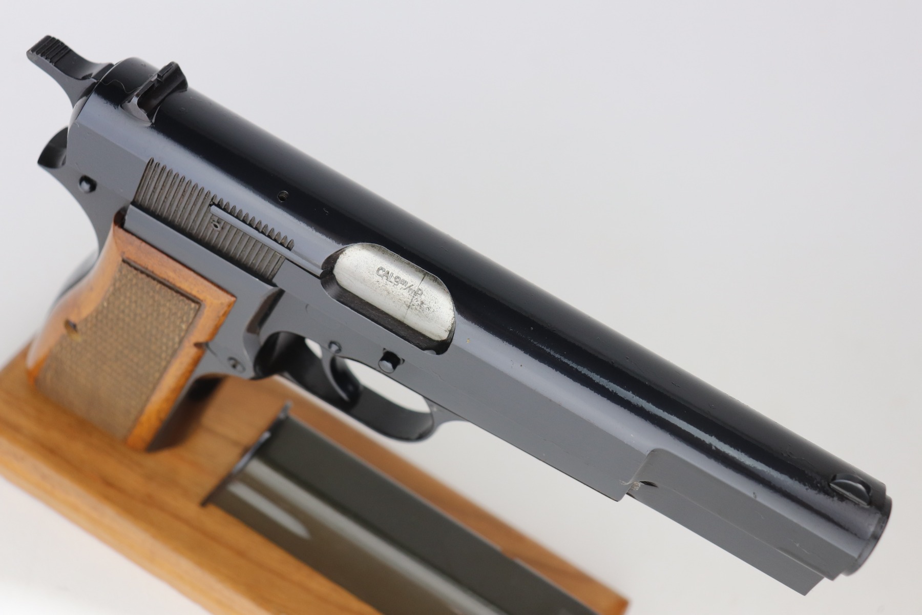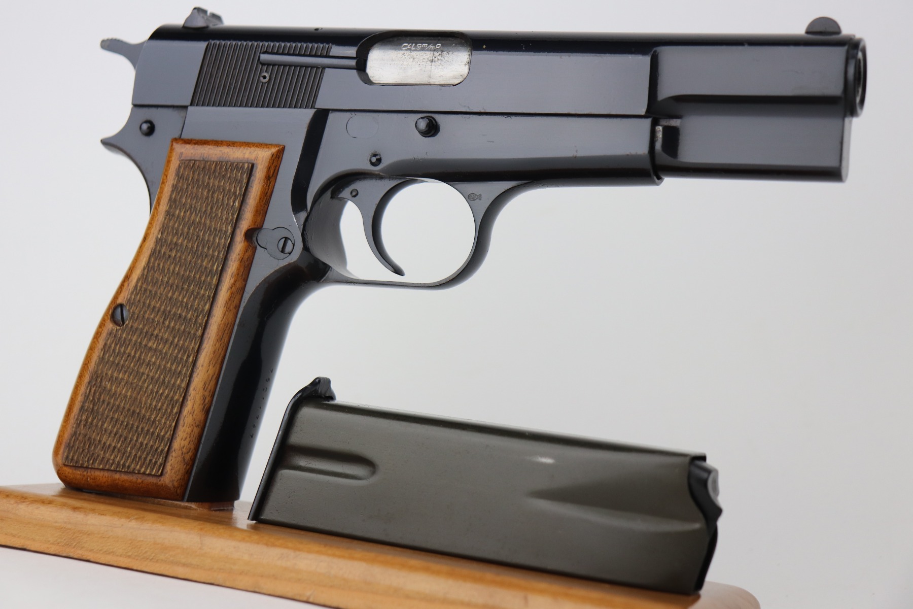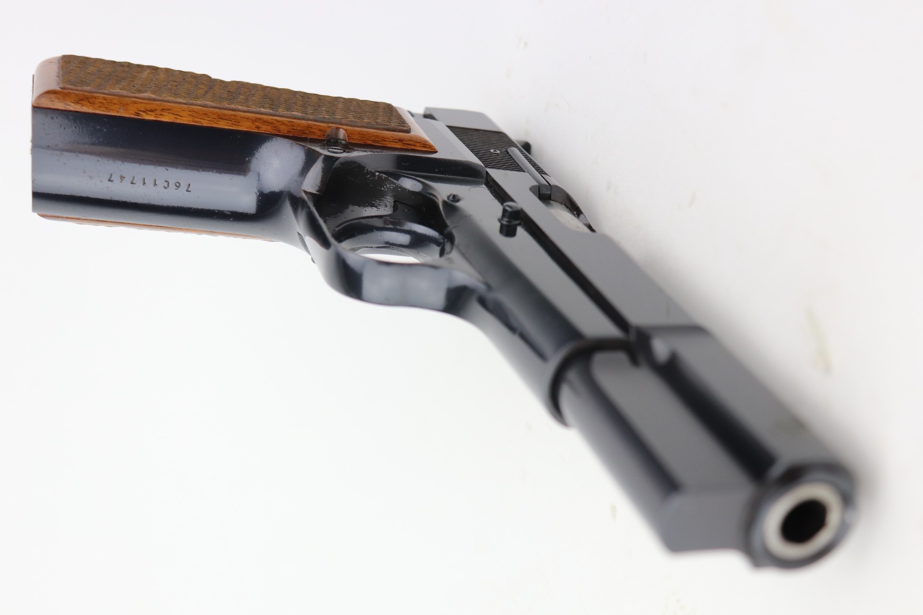 4/26/21 – This is a minty example of a Browning Hi Power manufactured in 1976. The gun has retained about 99% of its original finish. There is just one small spot of wear on the left side of the slide. There are tiny dots of oxidation on the straps. Comes with excellent wood grips and a proper magazine. The bore is near-mint.