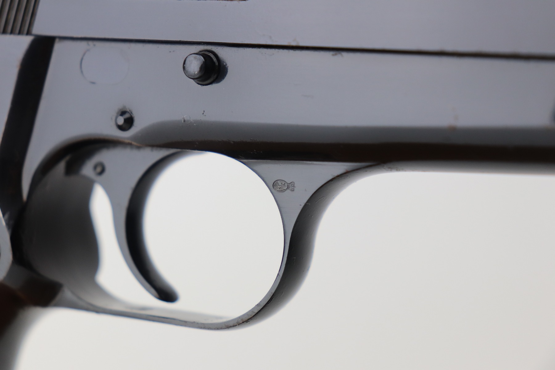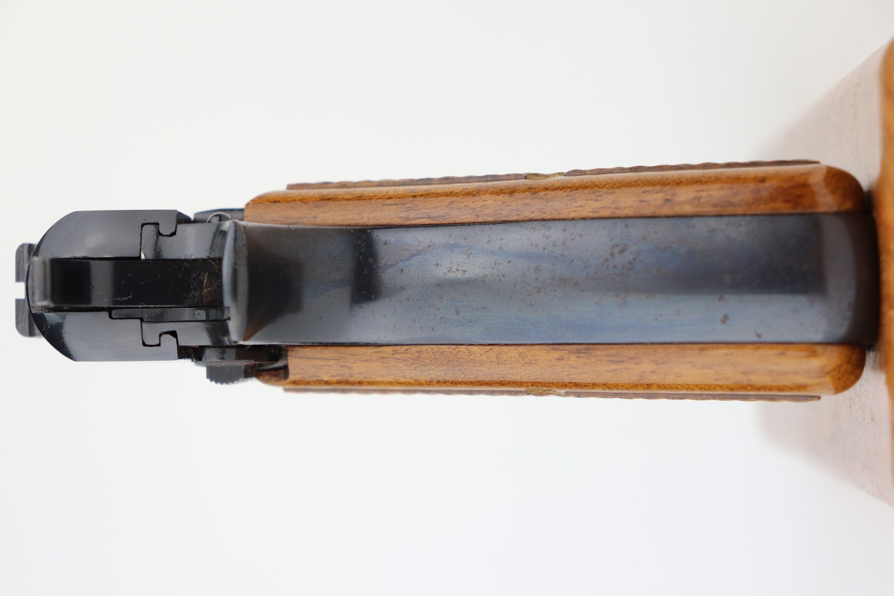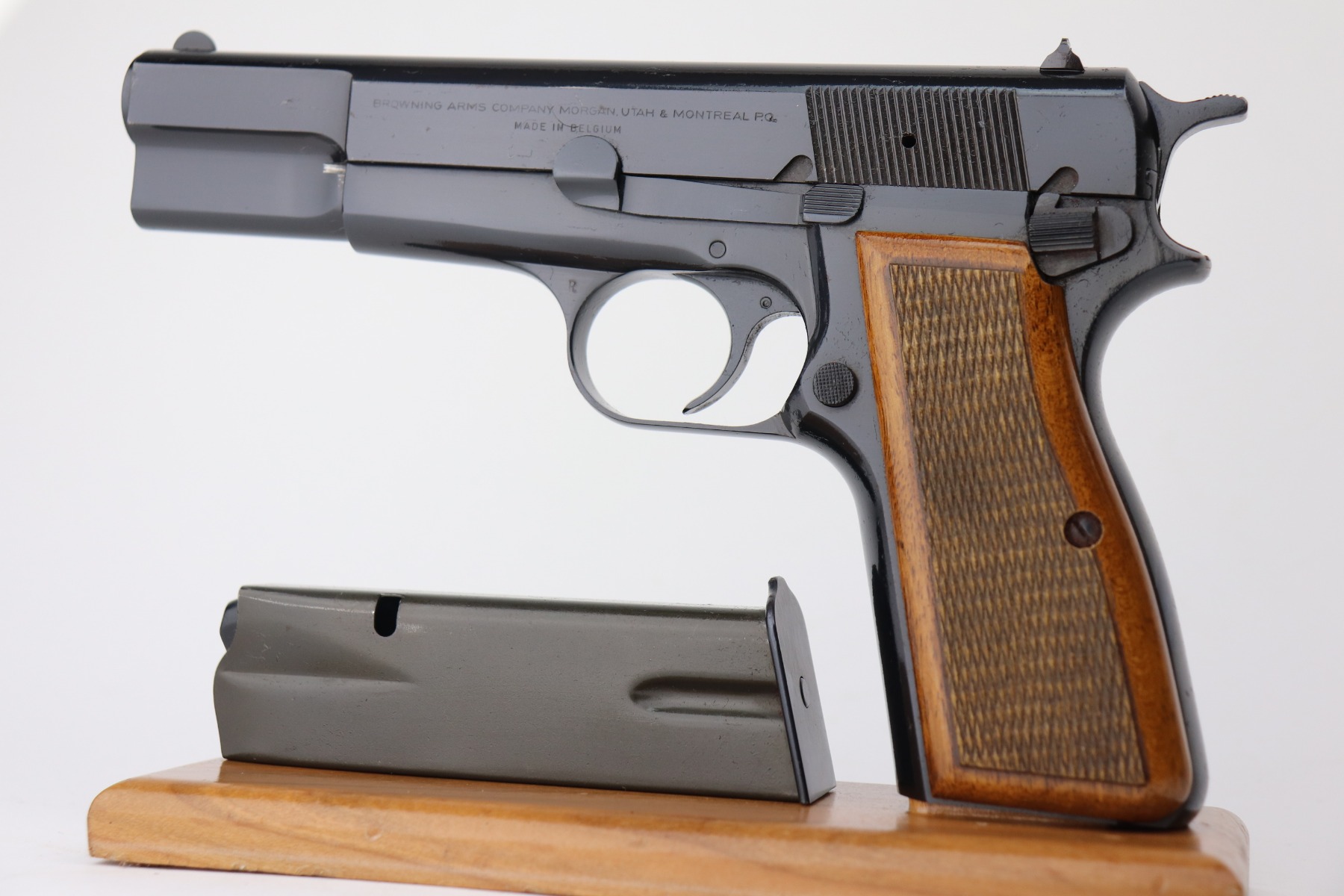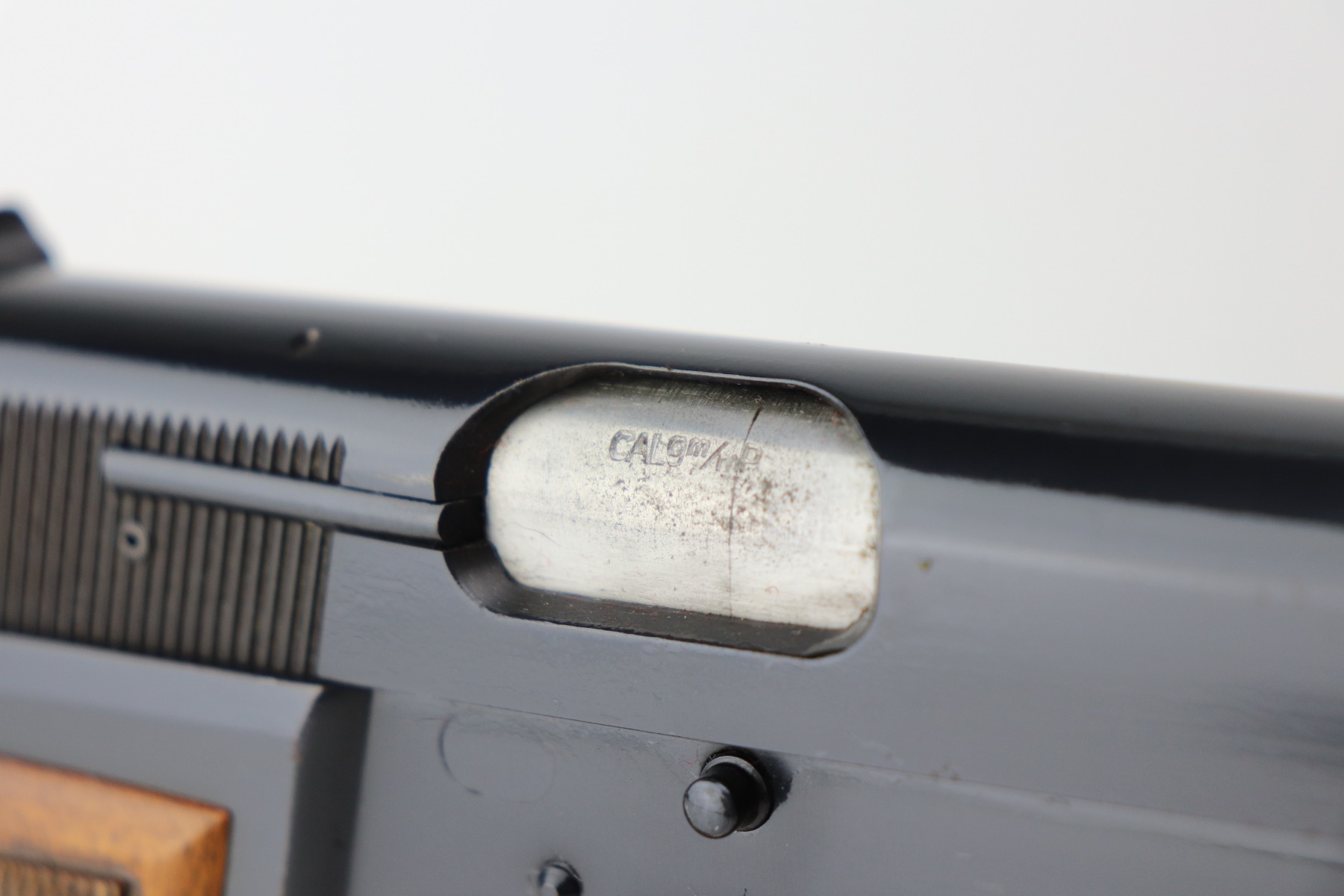 4/26/21 – This is a minty example of a Browning Hi Power manufactured in 1976. The gun has retained about 99% of its original finish. There is just one small spot of wear on the left side of the slide. There are tiny dots of oxidation on the straps. Comes with excellent wood grips and a proper magazine. The bore is near-mint.