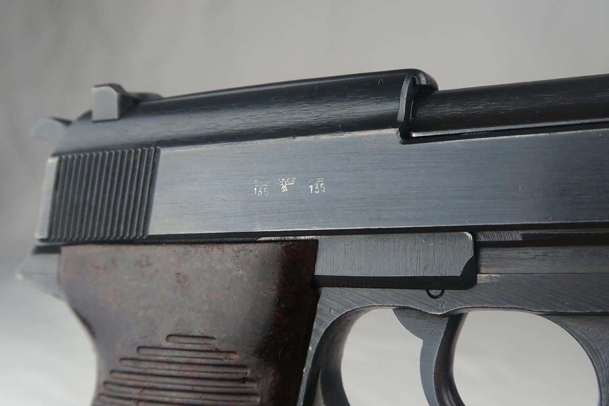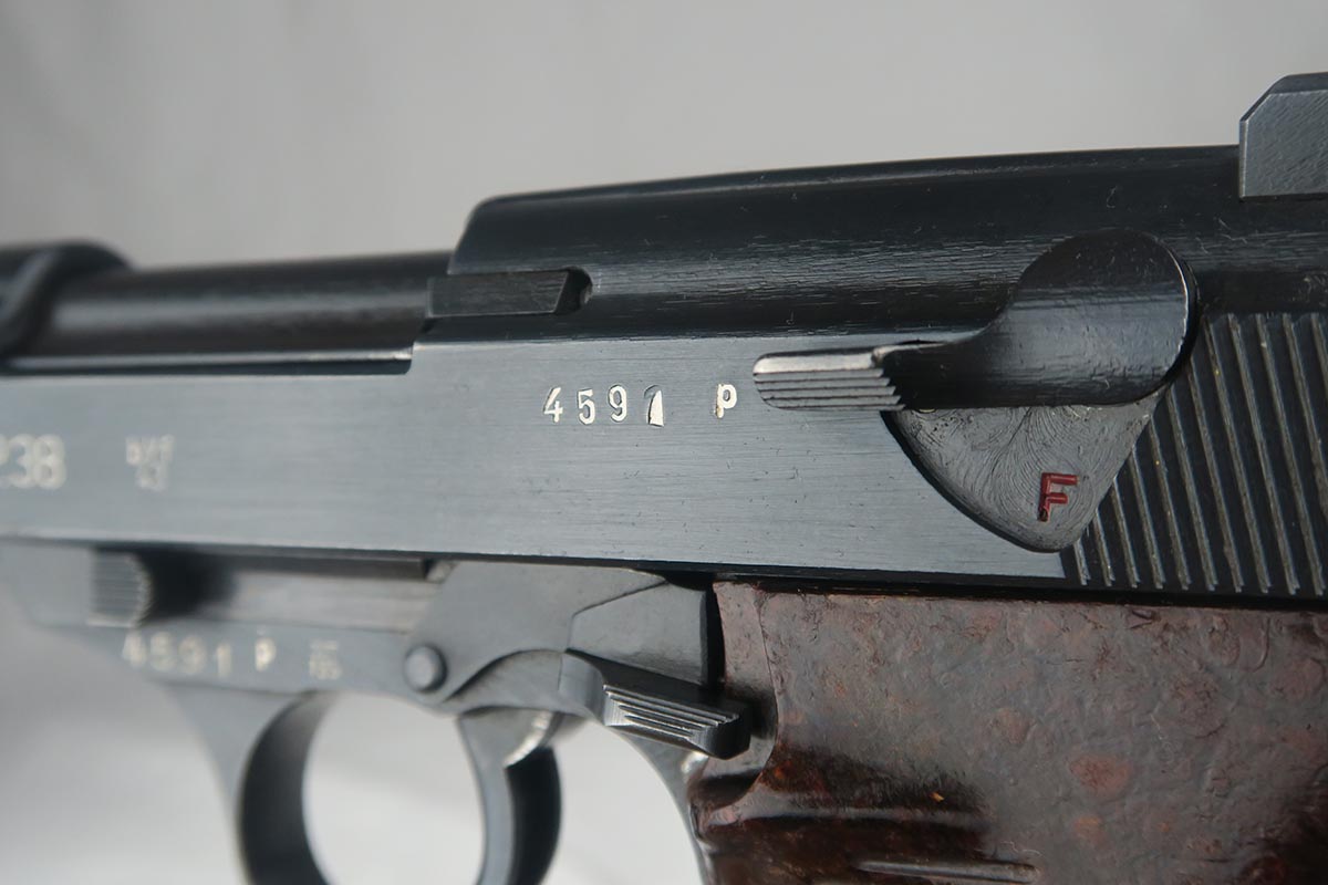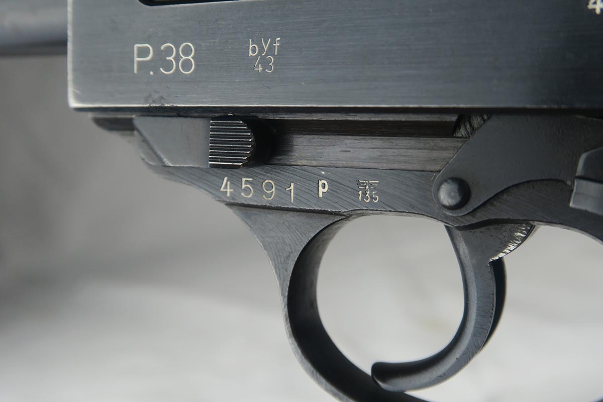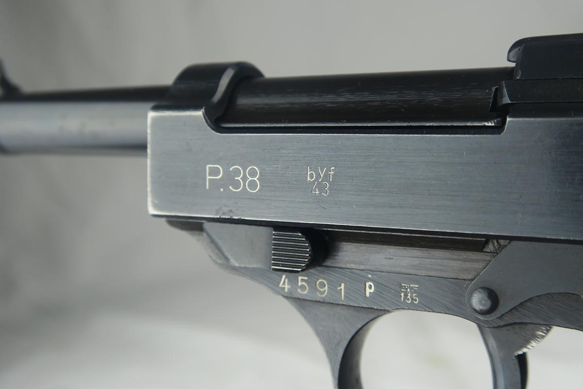 8/15/17 – This is a minty Mauser P.38, manufactured in 1943. All matching and correct, the original finish rates at 98-99% with minor edge/muzzle wear. Excellent reddish grips. Eagle/135 marked magazine. Proper mechanical function and minty bore.