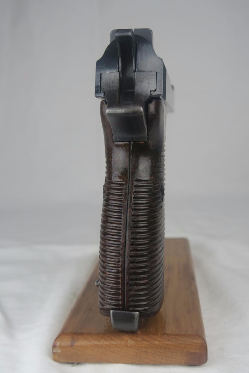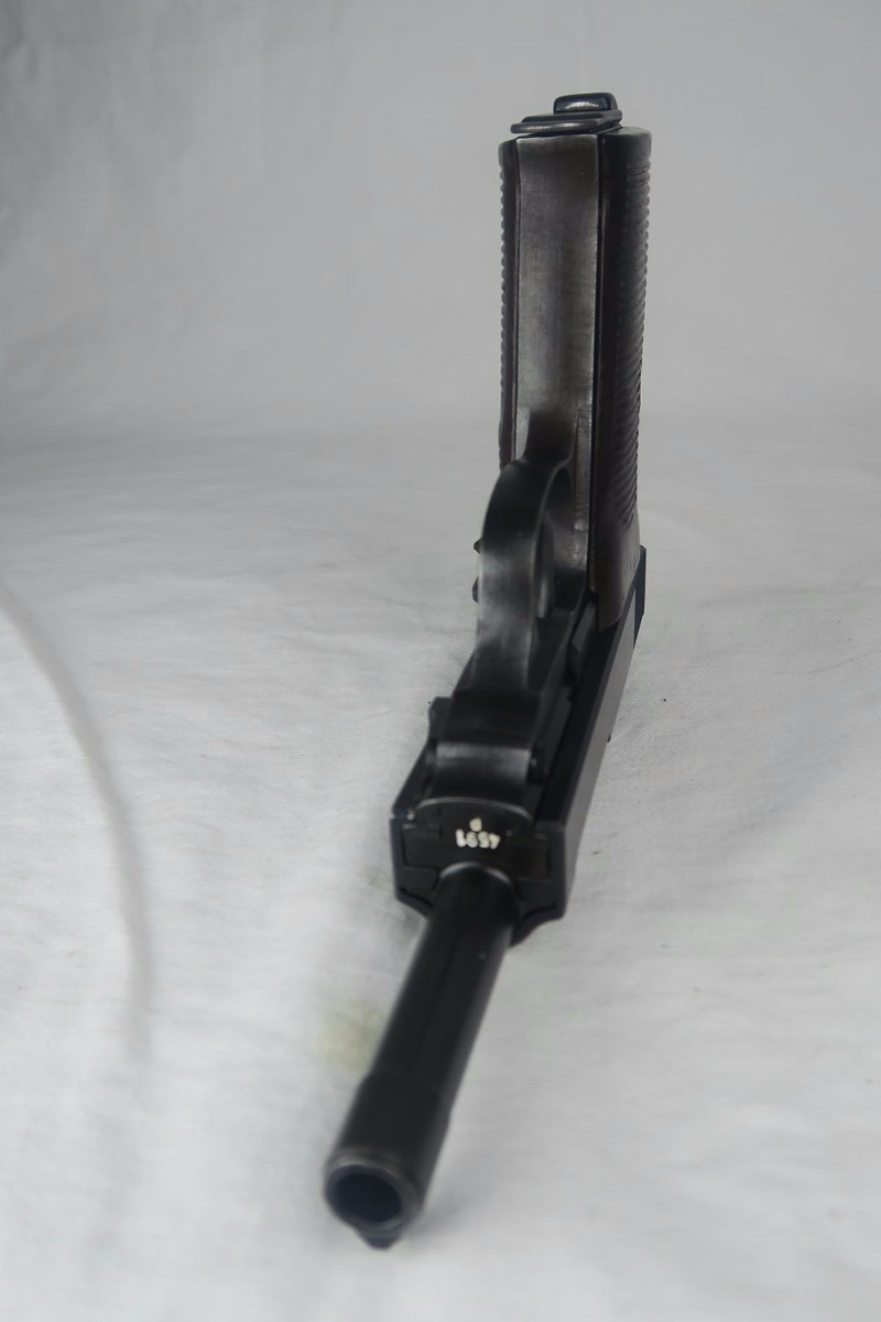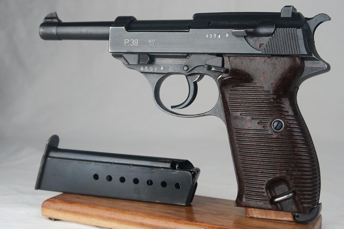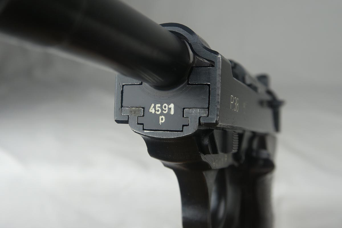 8/15/17 – This is a minty Mauser P.38, manufactured in 1943. All matching and correct, the original finish rates at 98-99% with minor edge/muzzle wear. Excellent reddish grips. Eagle/135 marked magazine. Proper mechanical function and minty bore.
