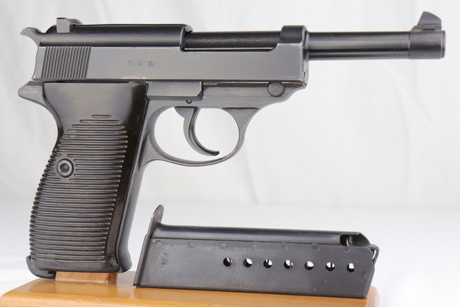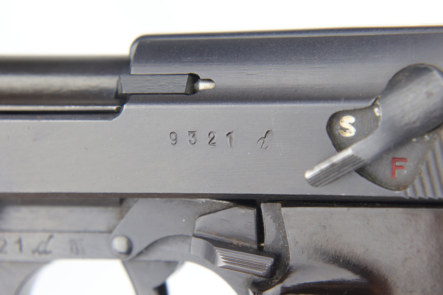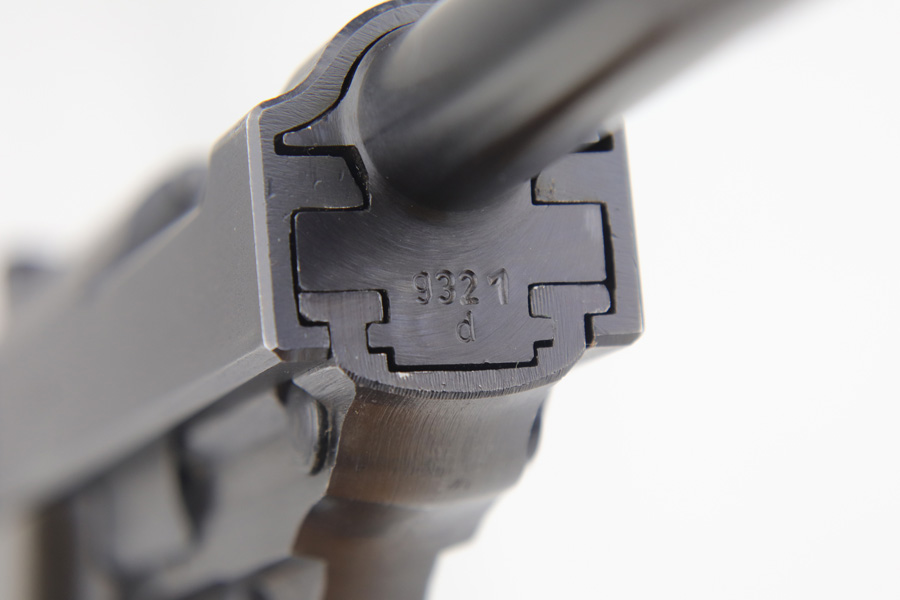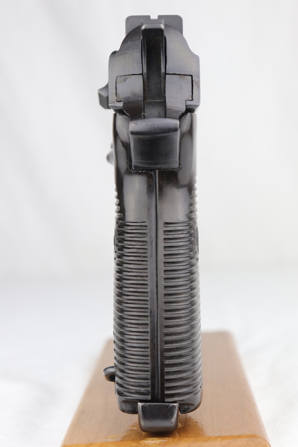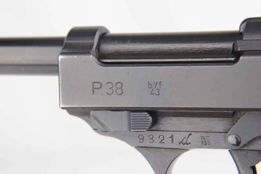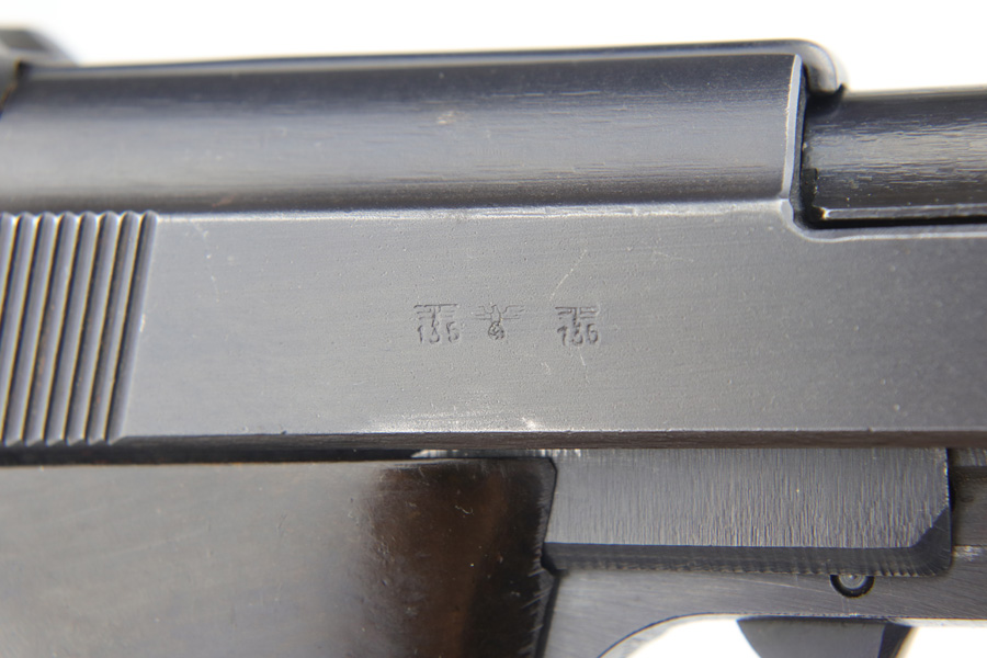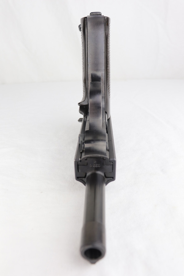 12/28/18 – This is a somewhat rare and unique P.38 made by Mauser. It was made in early 1943 (d block) and most of the finish is an original DUST blue finish. The barrel on the other hand is a high polish finish giving this gun a “dual tone” look. I have not seen another this nice or distinctly transitional from the dust blue to the later blued finish. It comes with excellent correct grips and a WaA135 marked magazine. The bore is excellent – near mint, with very strong rifling. Overall this is an excellent find, with all matching and correct parts. Guaranteed authentic and original.