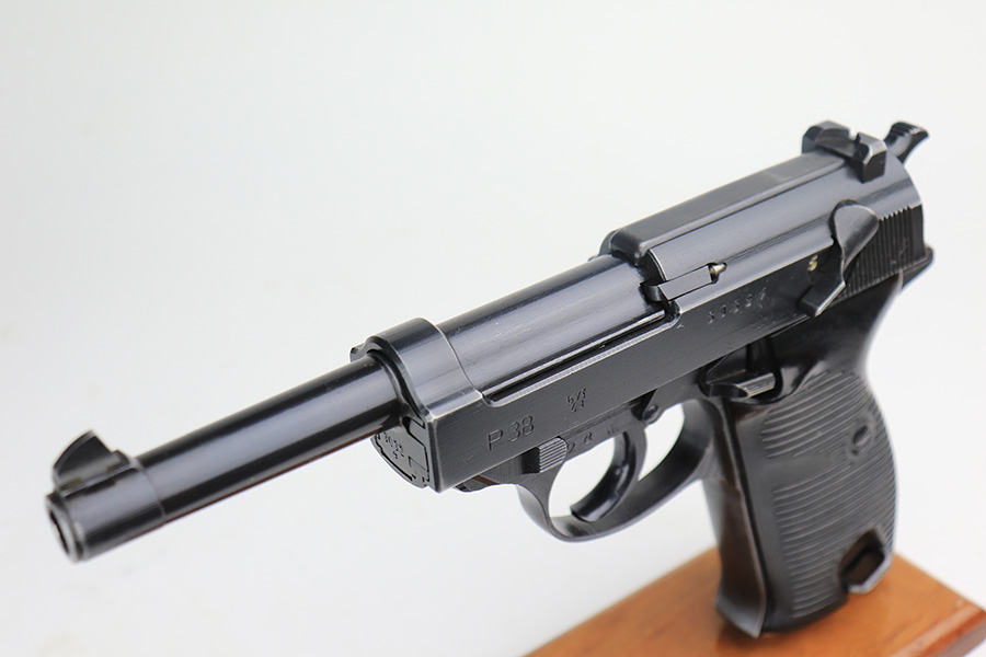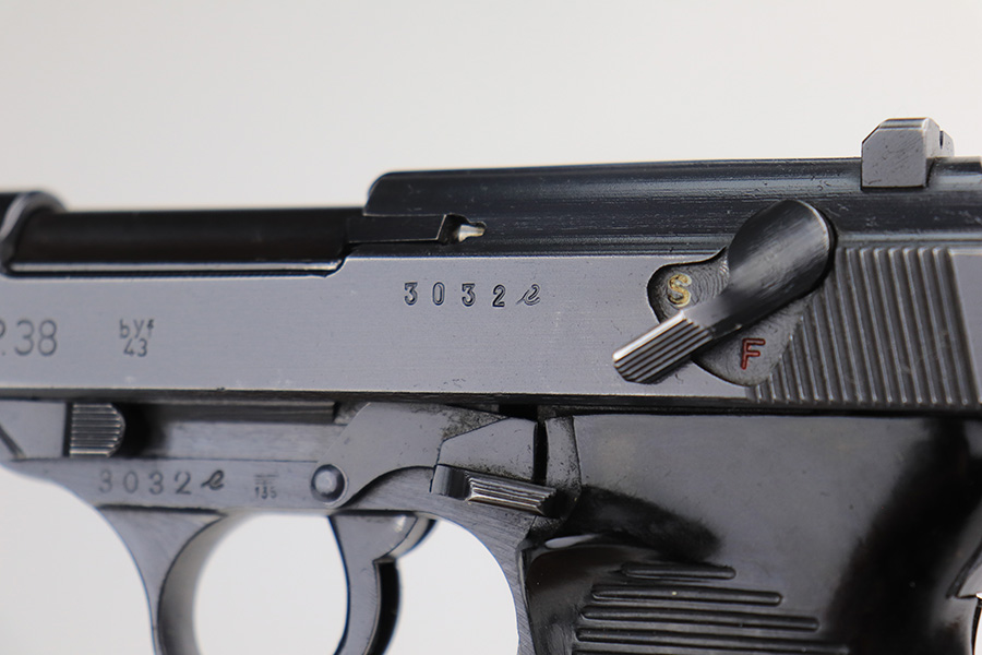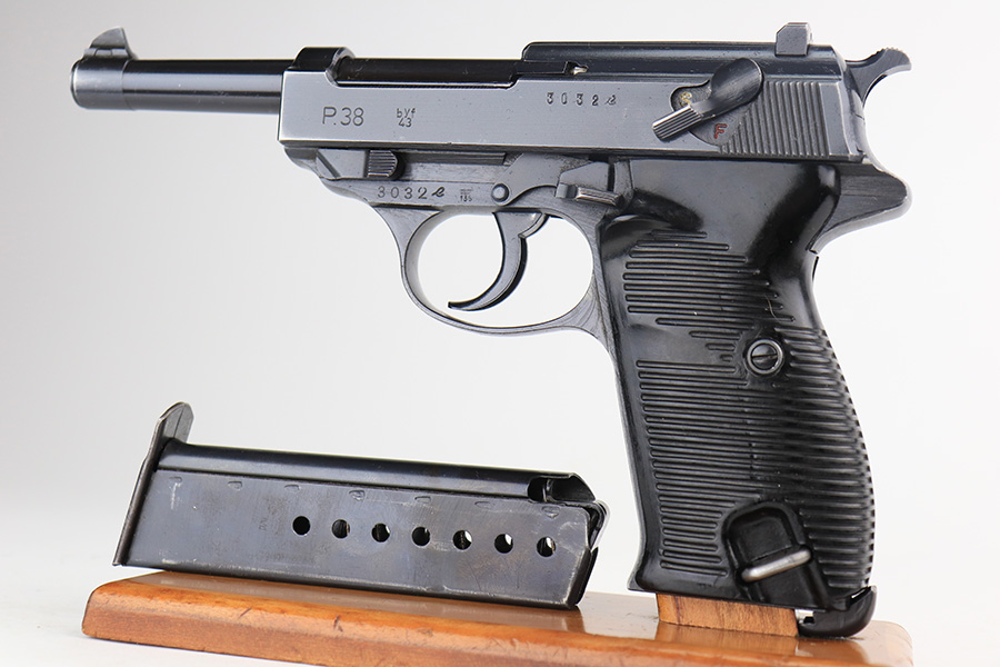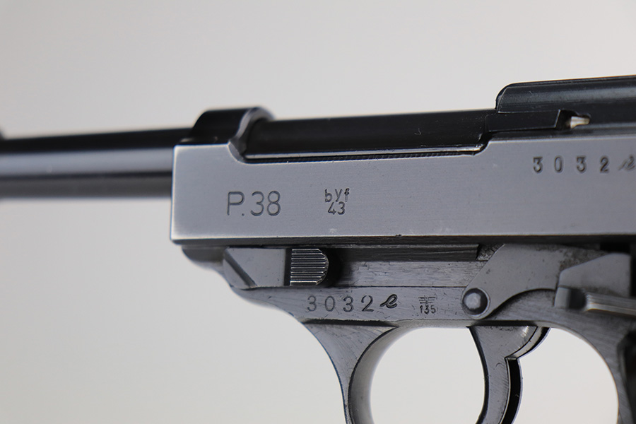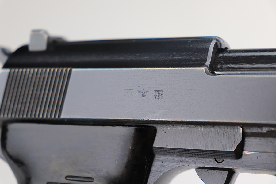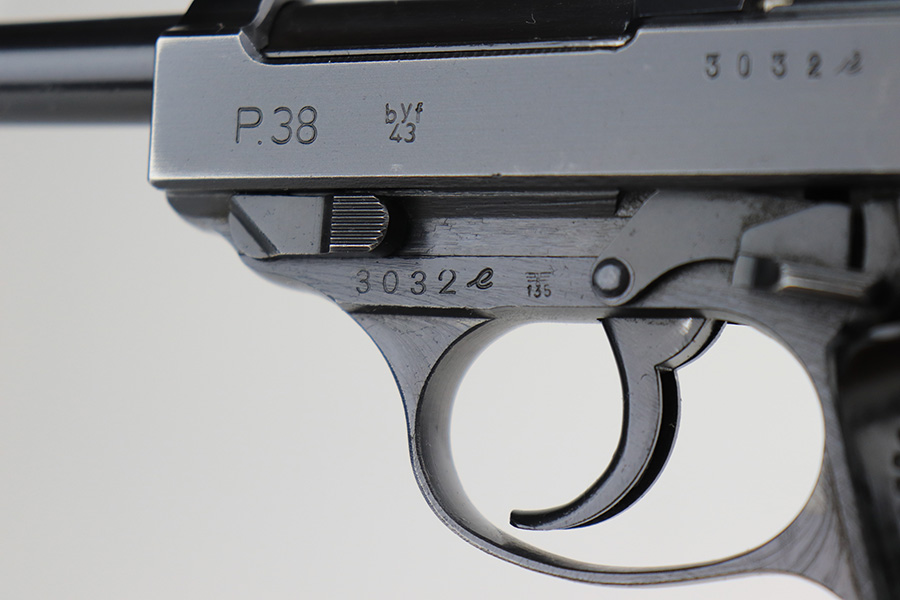 3/3/22 – This is a near-mint example of a Mauser P.38 issued to the Nazi military in 1943. The gun is all matching and has the proper “Eagle 135” Nazi military acceptance proofs throughout. It has retained about 98% of its iconic dust-blue finish, characteristic of these guns. There are just hints of wear on some of the high edges and around the muzzle. A hint of thinning on the front strap. Comes with excellent bakelite grips and a period-correct “jvd” magazine. The bore is shiny with very strong rifling and tiny freckles here and there. De-cocker is functional.