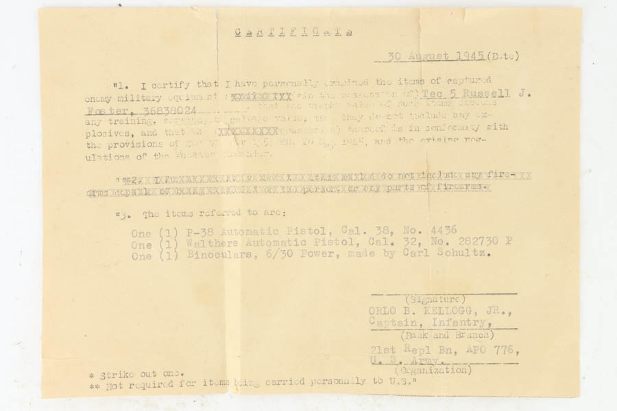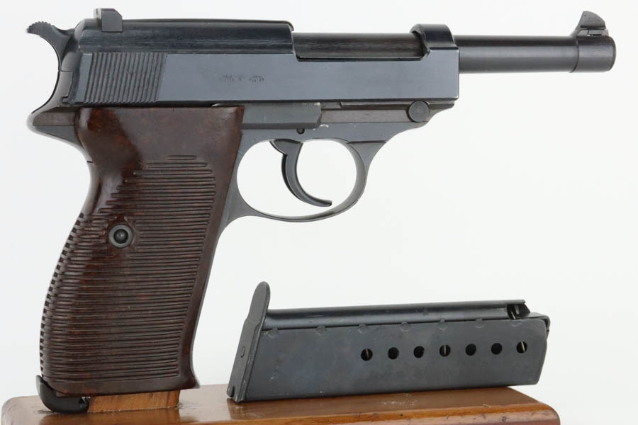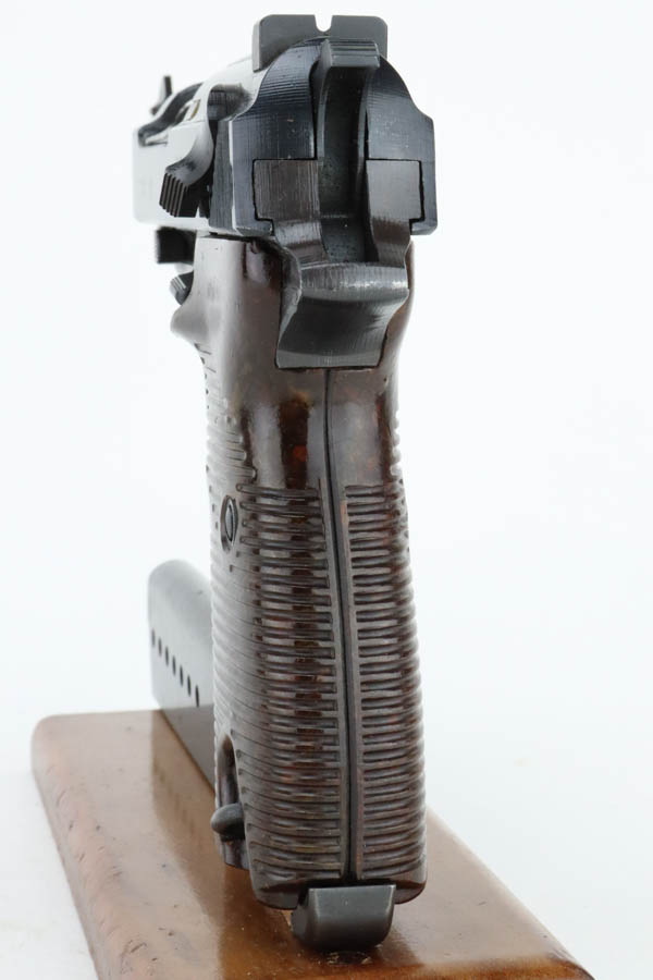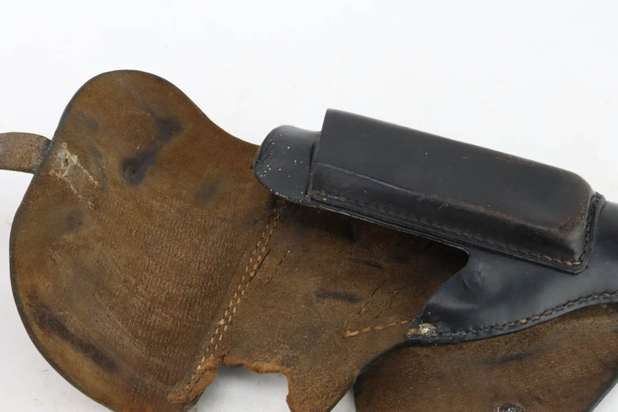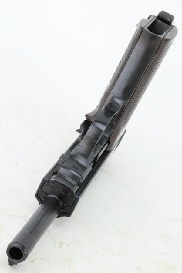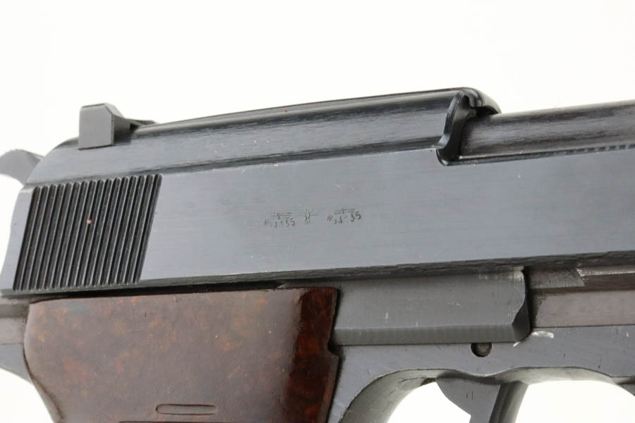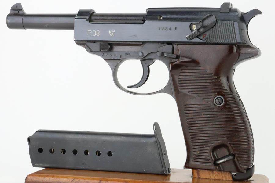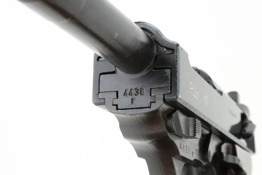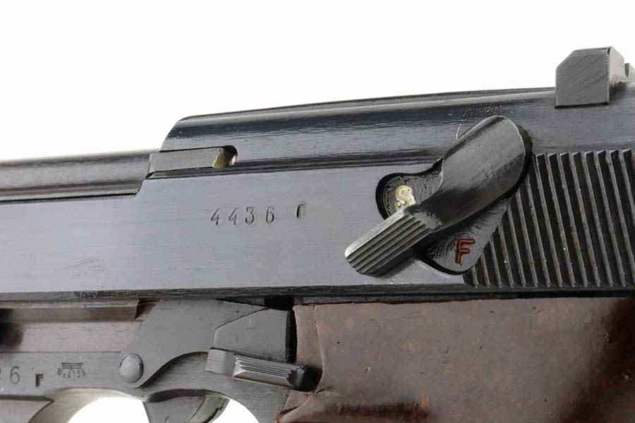 7/26/24 – This is a beautiful example of a BYF 43 Mauser P.38 issued to the Nazi military in 1943. All matching with the proper “Waffen 135” military acceptance proofs throughout. It comes as a rig with a “Waffen 135” Mauser magazine and a 1944-dated soft shell holster (there is a hole on the back). The rig also comes with the original copy of the WW2 capture document. The document lists this exact gun by serial number, along with a Walther PP and a pair of binoculars. The gun itself shows has very little bluing loss but there is rough/odd machining on the front strap. Fitted with period-correct reddish bakelite grips. Mint bore. De-cocker is functional.