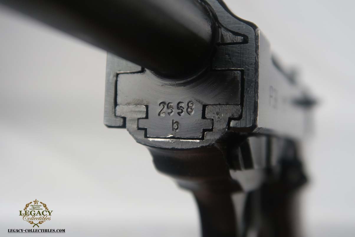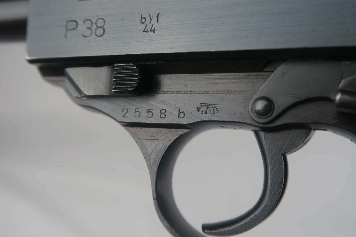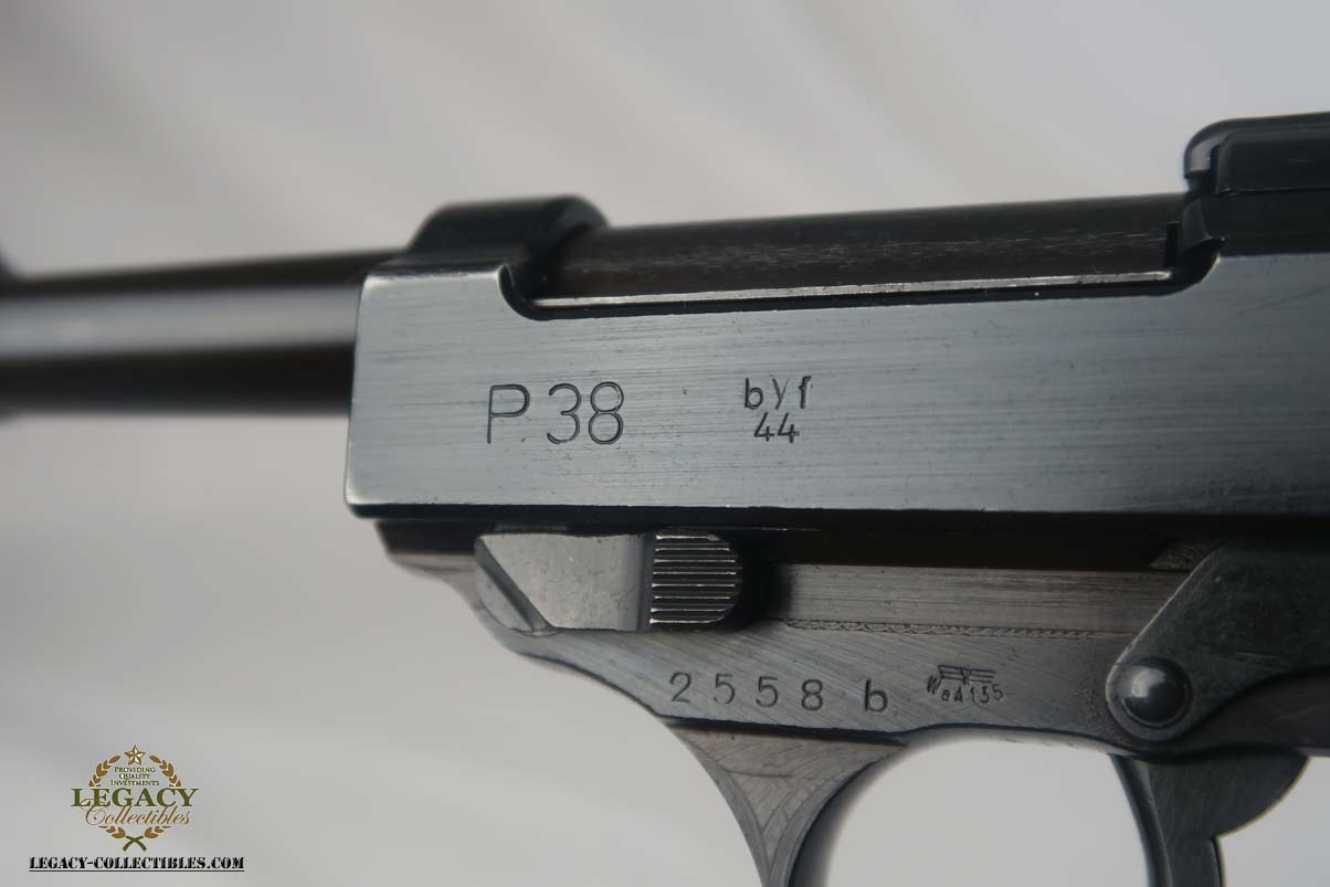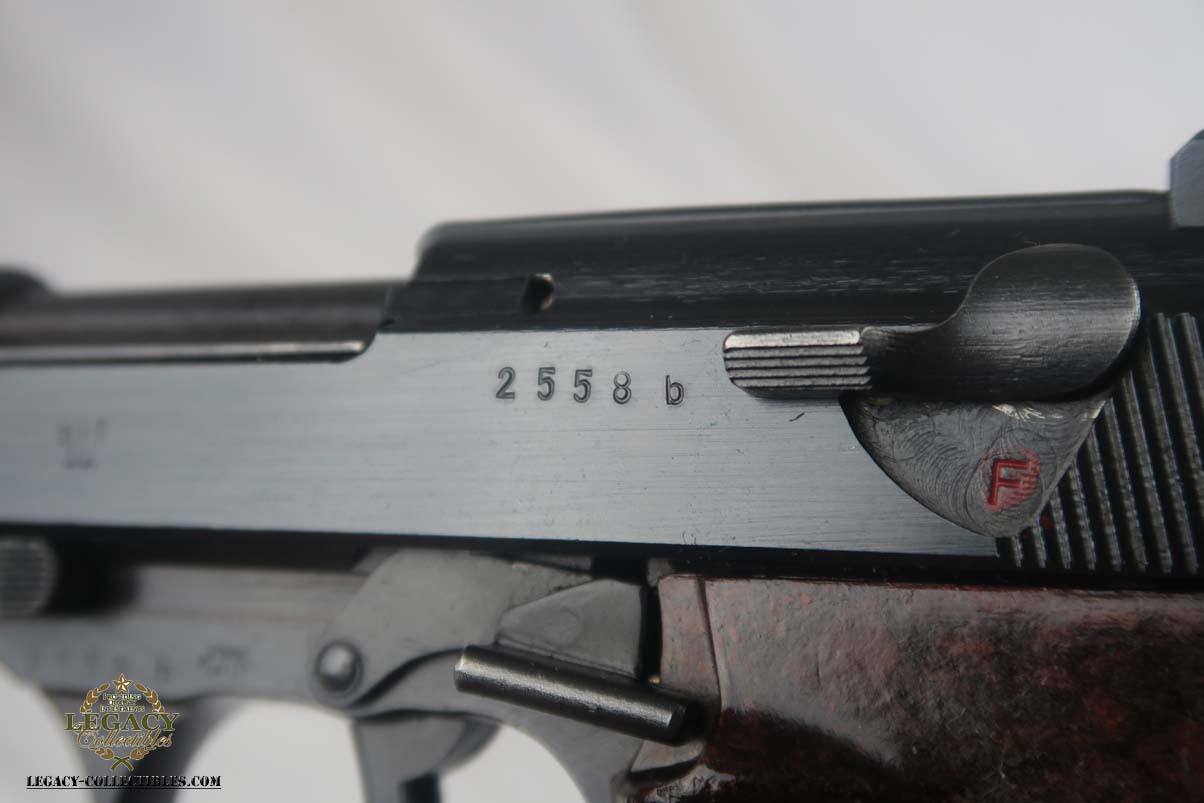 4/24/17 – This is a Mauser produced byf 44 P.38, in near mint condition.  The original finish is 99+%, with just the slightest edge wear.  Comes with an excellent set of proper reddish grips, and a WaA135 proofed magazine.  Bore is minty as well.  Tough piece to upgrade!