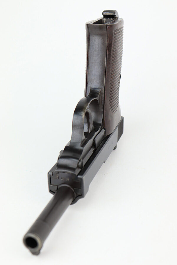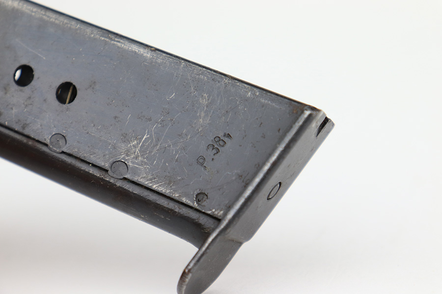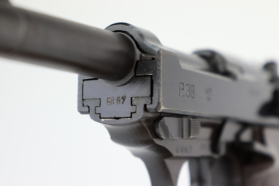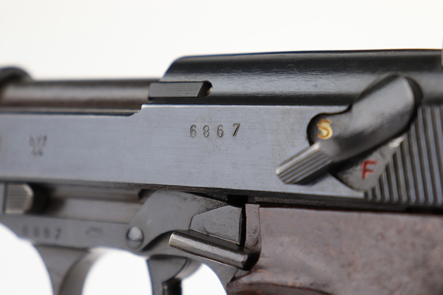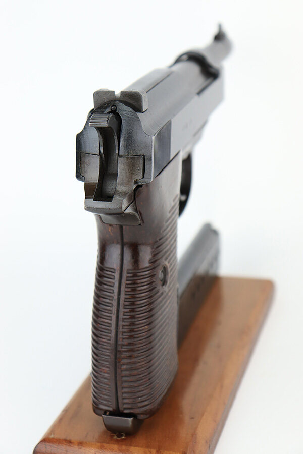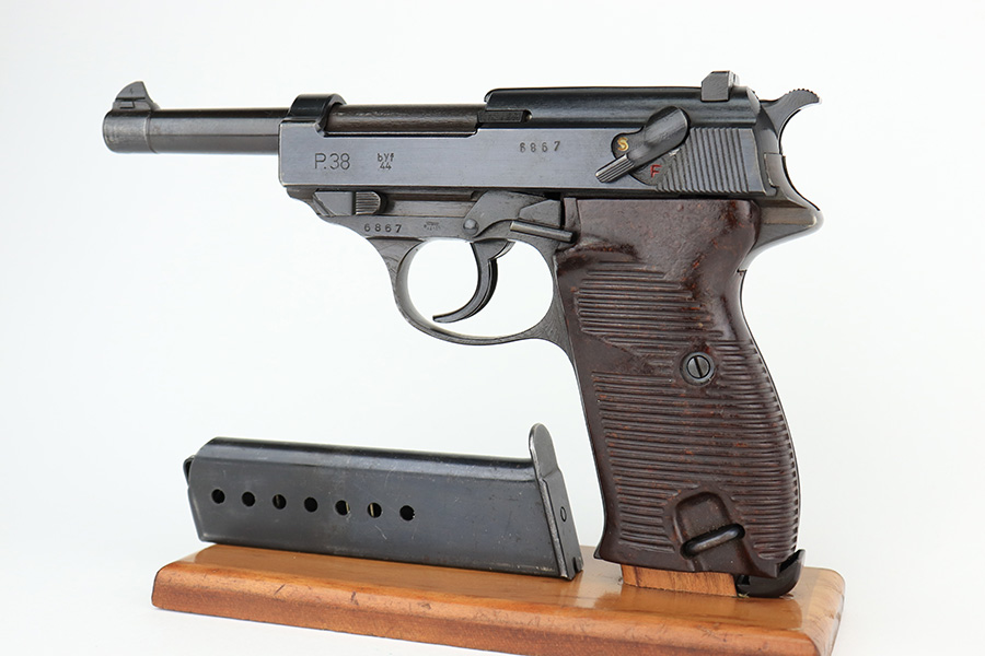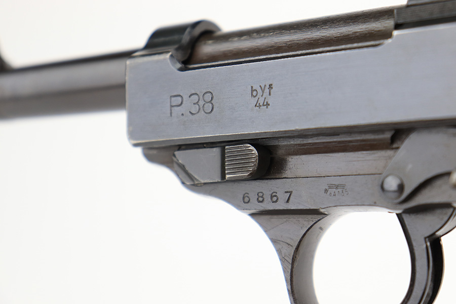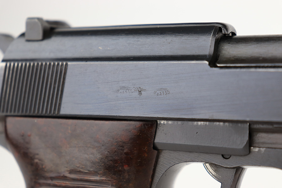 7/13/22 – This is a minty example of a BYF 44 Mauser P.38 issued to the Nazi military in 1944. The gun is all matching and has the proper “Waffen 135” military acceptance proofs throughout. The gun is in near-mint condition, retaining virtually all of its finish. However, we believe the top plate has been refinished. Comes with excellent reddish bakelite grips and a “Waffen 135” marked magazine. Mint bore. De-cocker is functional.