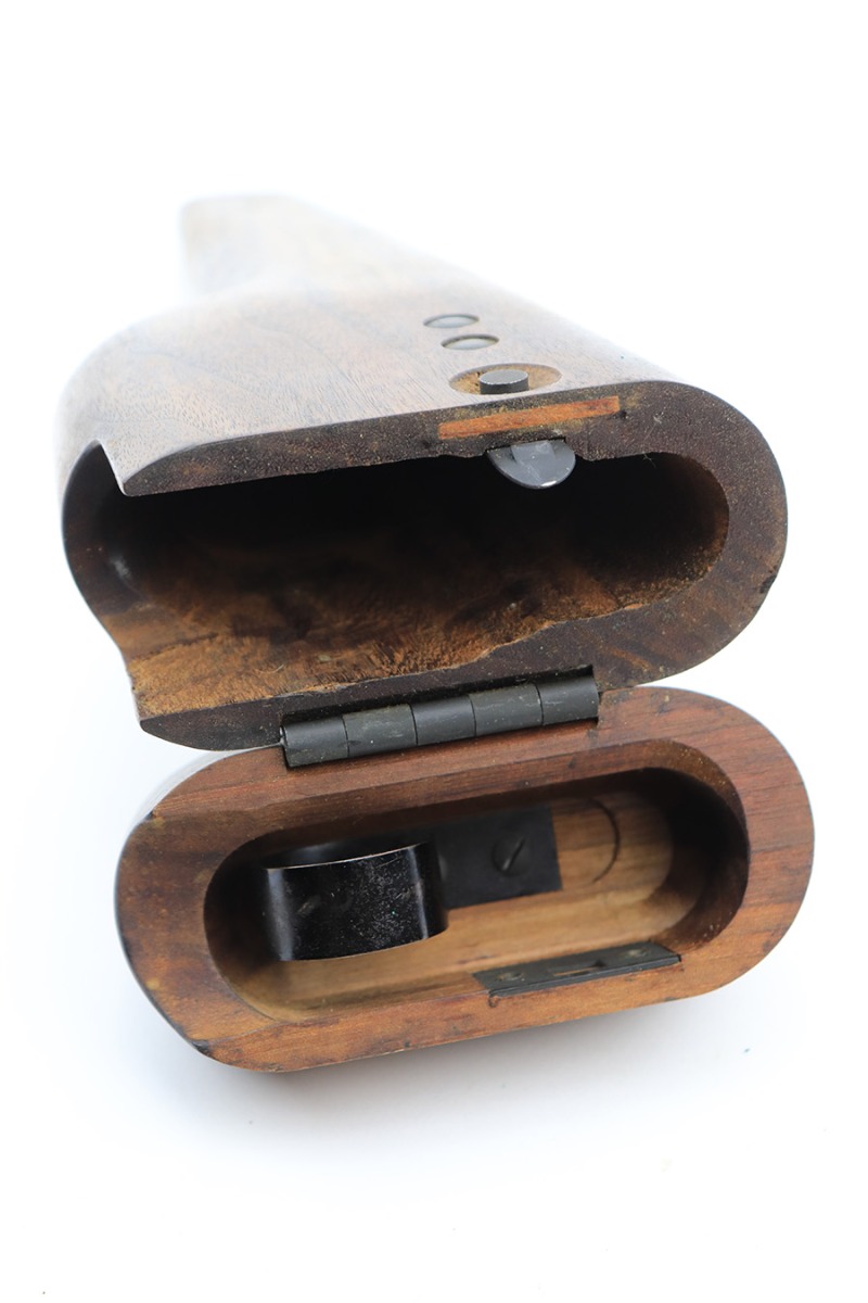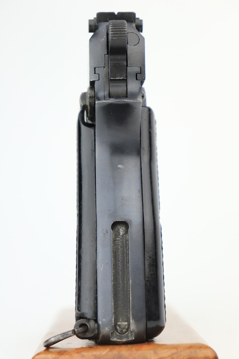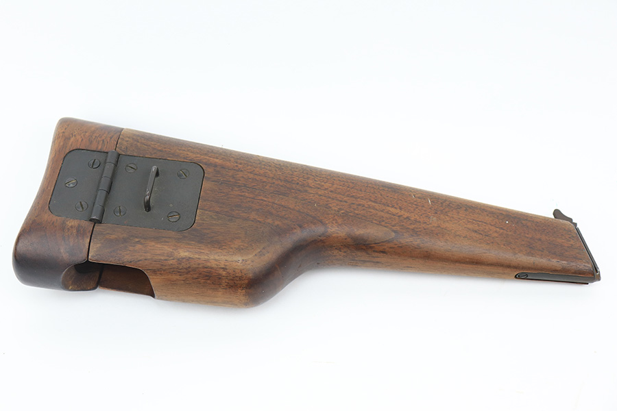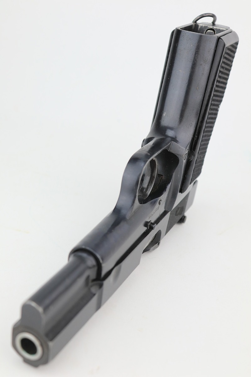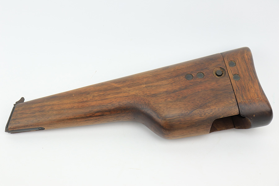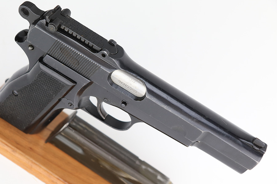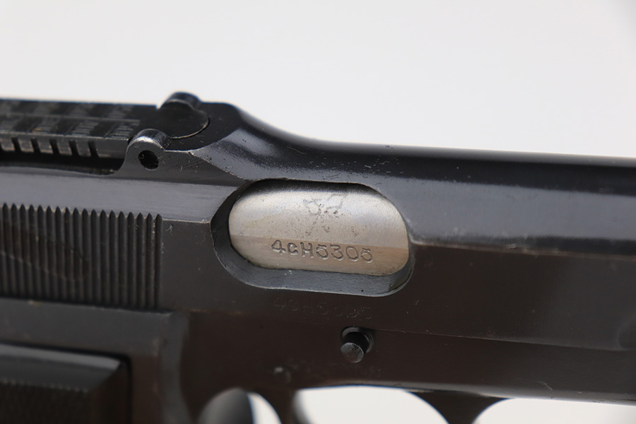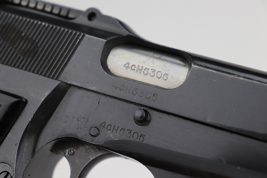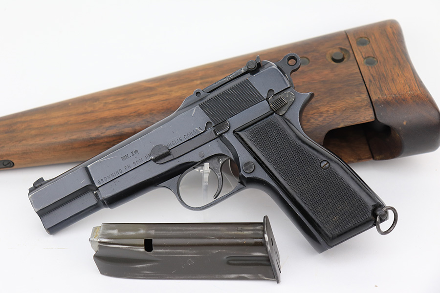 4/7/23 – This is a minty example of an Inglis High Power Mk 1* issued to the Canadian military during WW2. It is all matching with the proper proofs. It comes with a minty 1944-dated wood stock and a couple of reproduction Canadian Maple Leaf seals for the front strap. The gun itself has retained nearly all of its finish with hints of wear on the front strap and a few tiny handling marks here and there. Excellent black bakelite grips. The bore has good rifling, but there is minor freckling throughout.