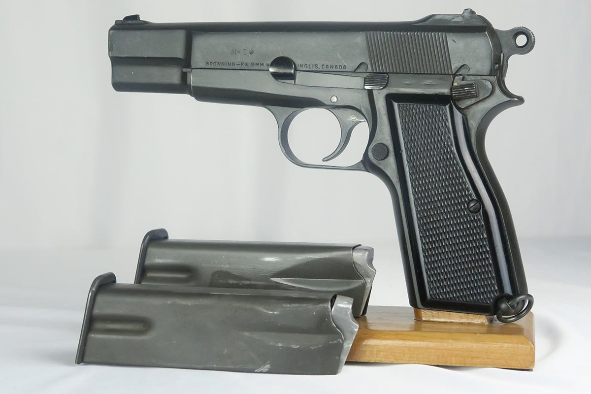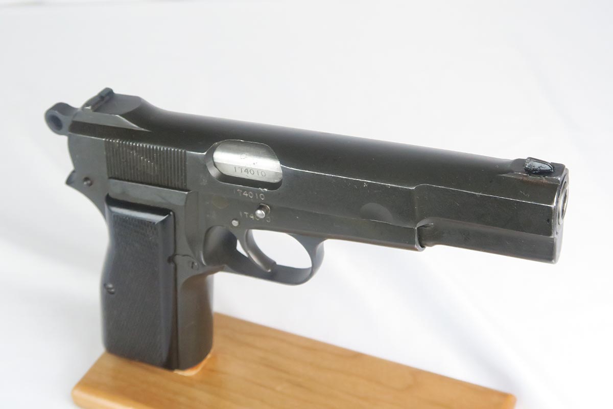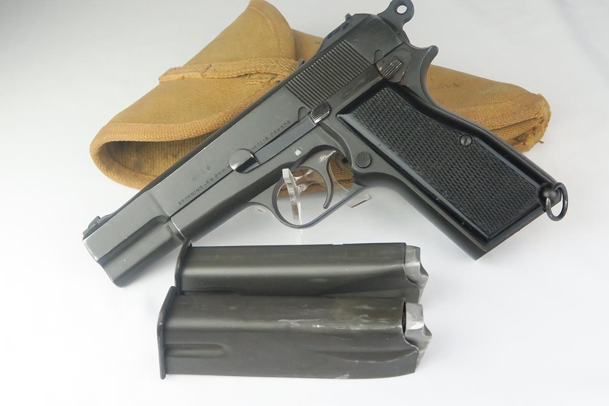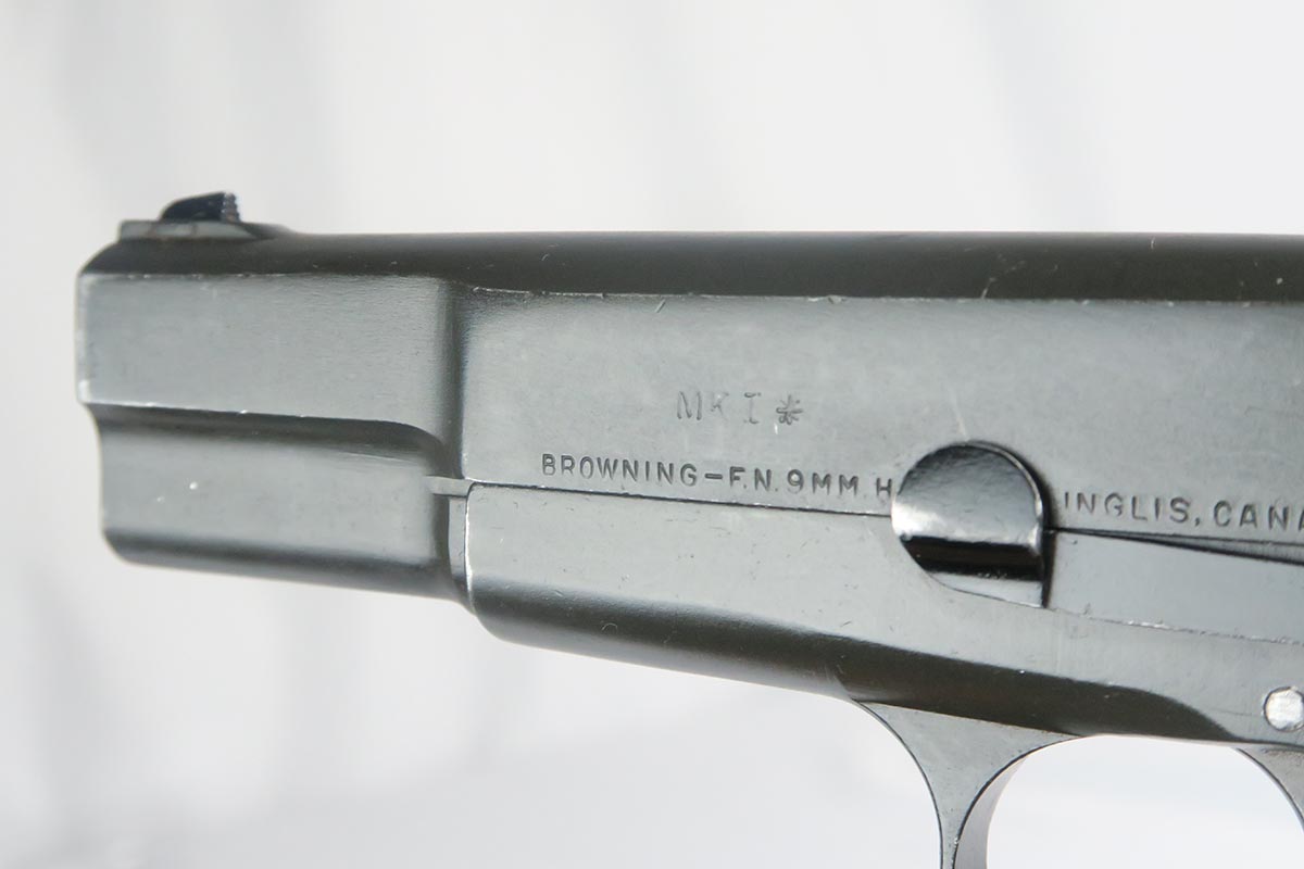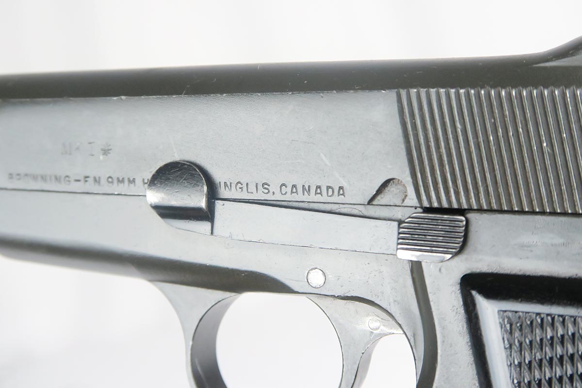 1/5/18 – This is a near-mint, complete and original Inglis High Power rig. This pistol was issued to the Canadian military during World War II, and the holster has MAJOR W.E. DAVIS – CDN ARMY written inside. The holster is also 1944 dated. The pistol has only minor high edge wear, and an excellent bore. Rig includes two total magazines, both of which are correct for this pistol and are marked JI on the bottom.