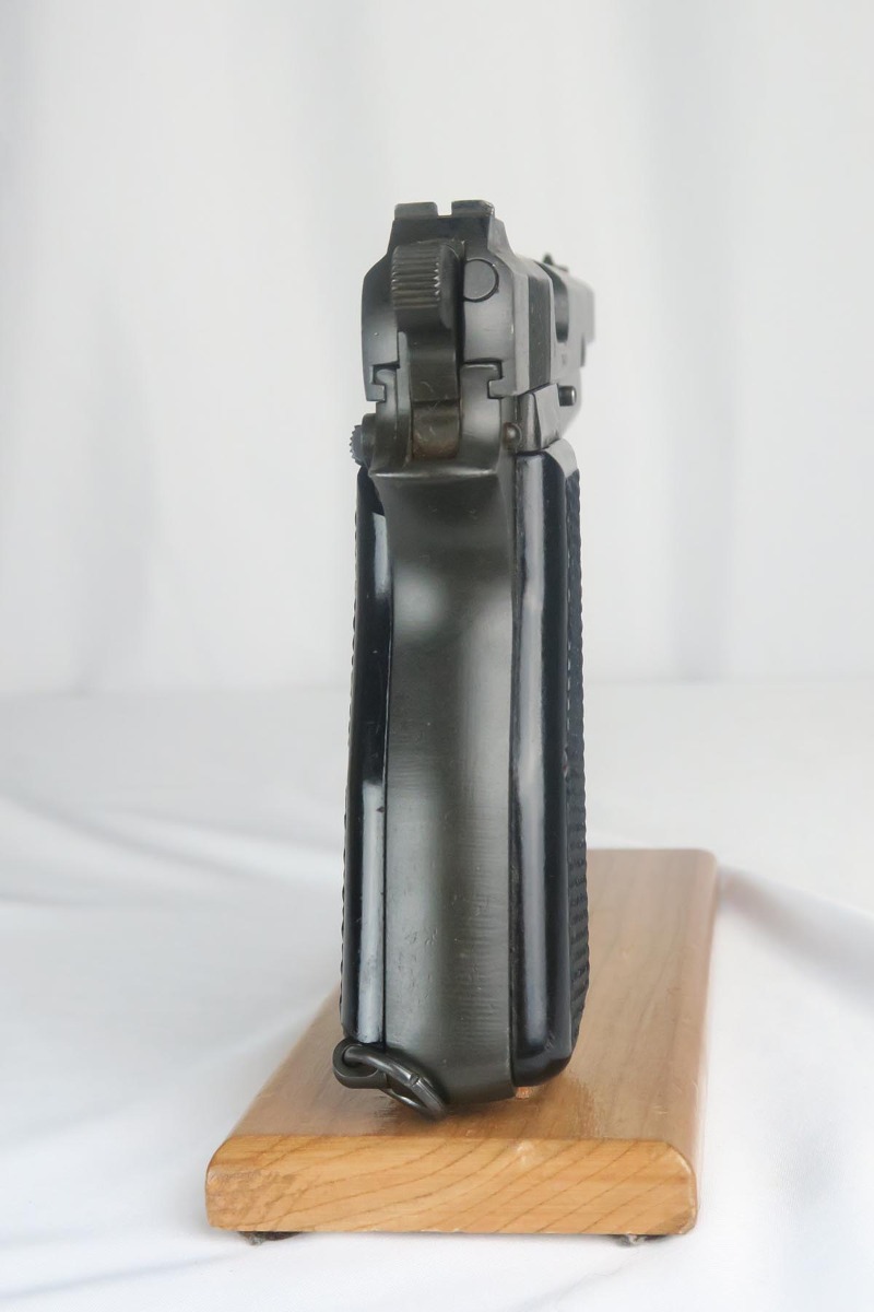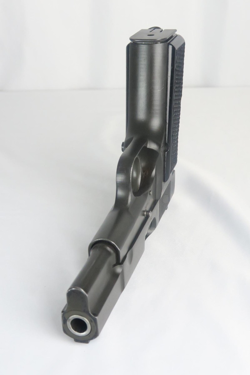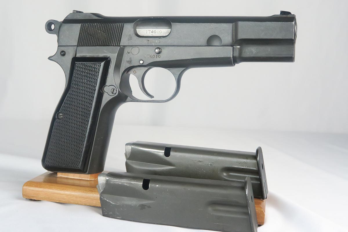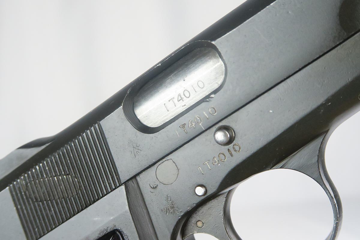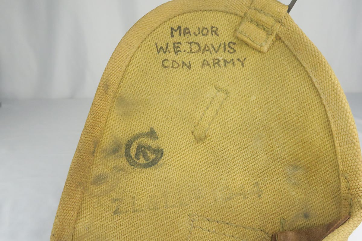 1/5/18 – This is a near-mint, complete and original Inglis High Power rig. This pistol was issued to the Canadian military during World War II, and the holster has MAJOR W.E. DAVIS – CDN ARMY written inside. The holster is also 1944 dated. The pistol has only minor high edge wear, and an excellent bore. Rig includes two total magazines, both of which are correct for this pistol and are marked JI on the bottom.