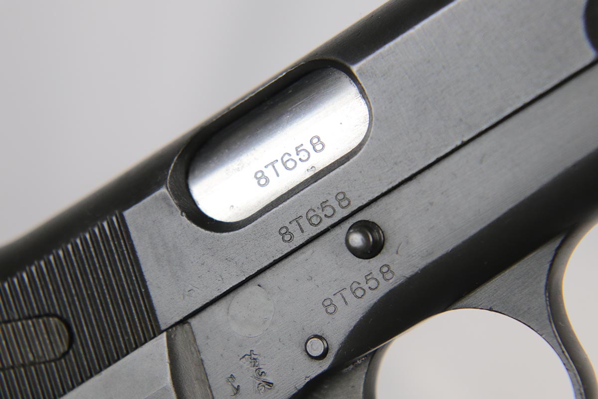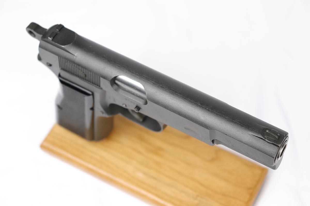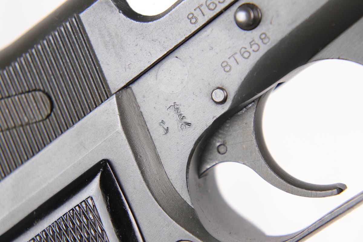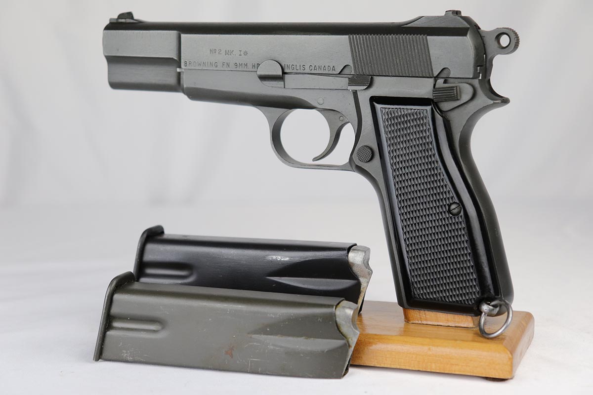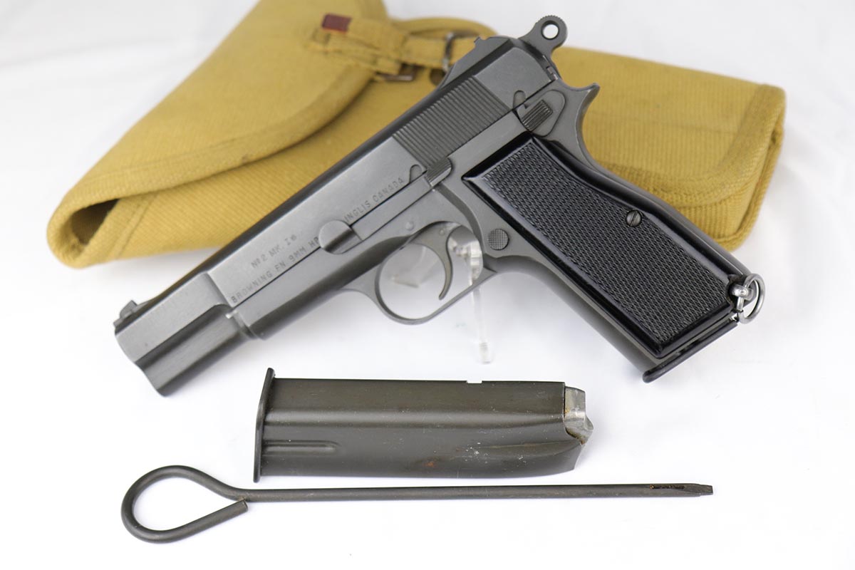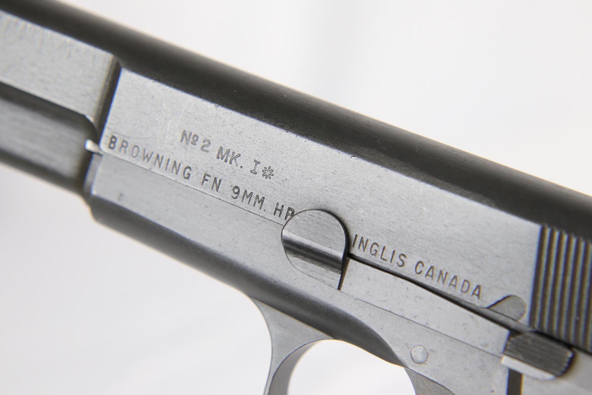5/15/18 – This is a near-mint Canadian Inglis High Power rig that was manufactured in 1945.  The parkerized finish rates at 99% with only minor thinning of the color on the high edges of the slide.  The gun comes with an original holster that is dated 1945, and includes a spare magazine and cleaning rod.  Both magazines are properly JI marked.  Pistol has an excellent bore.
