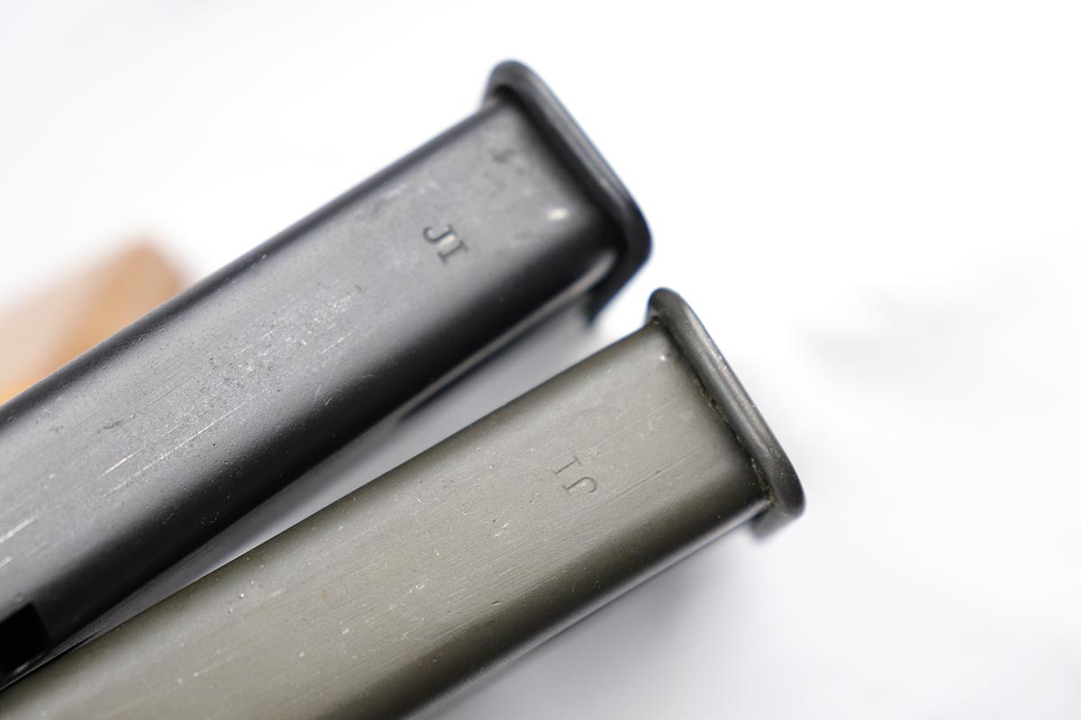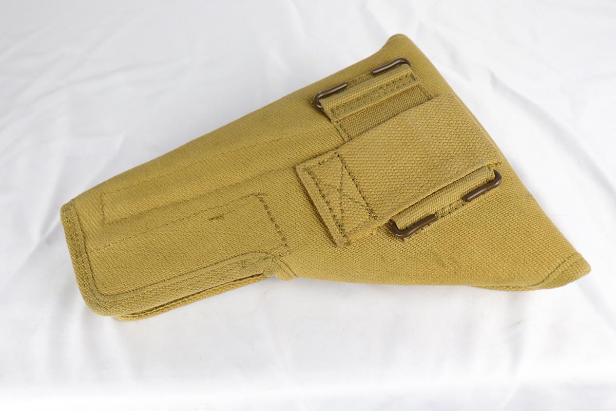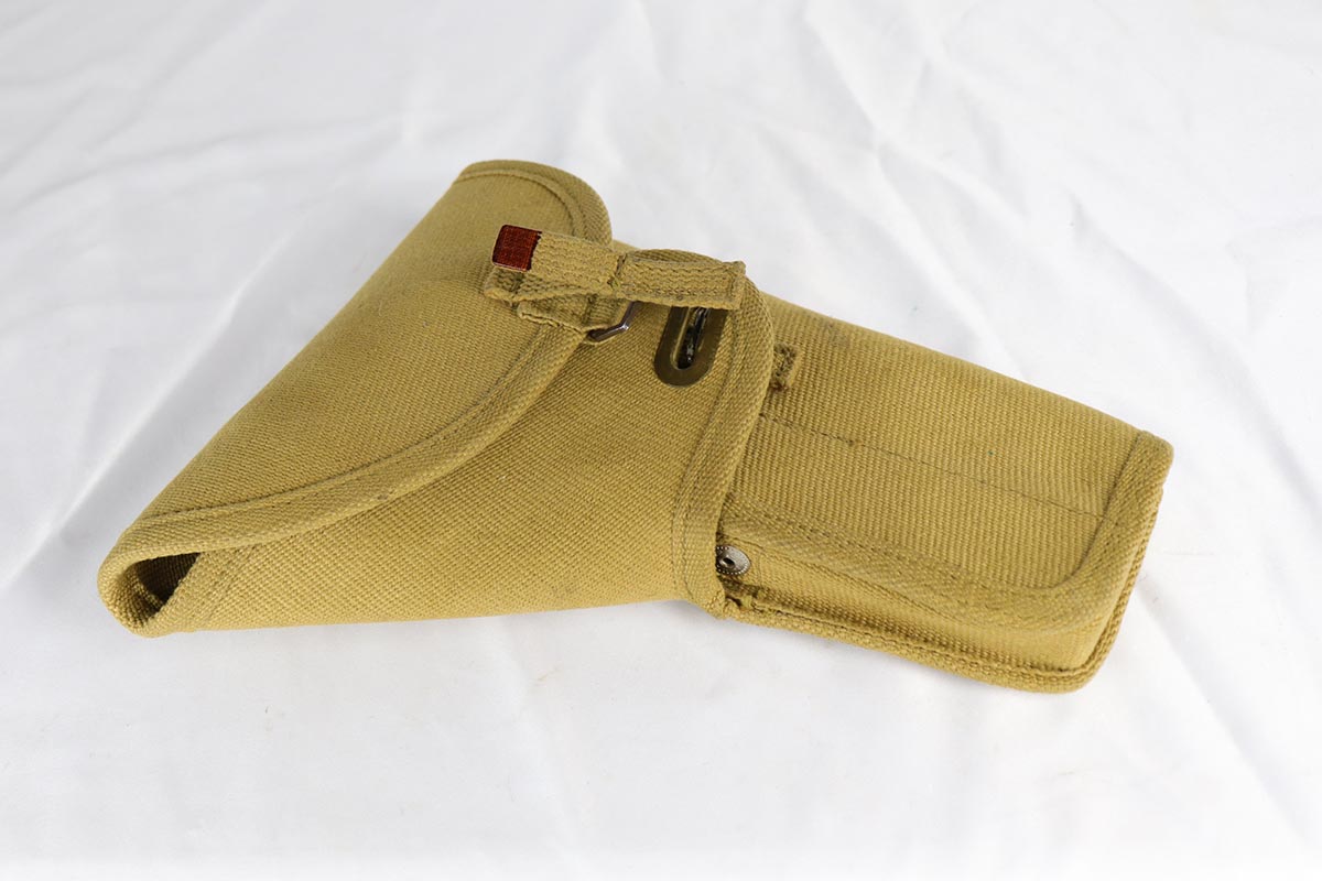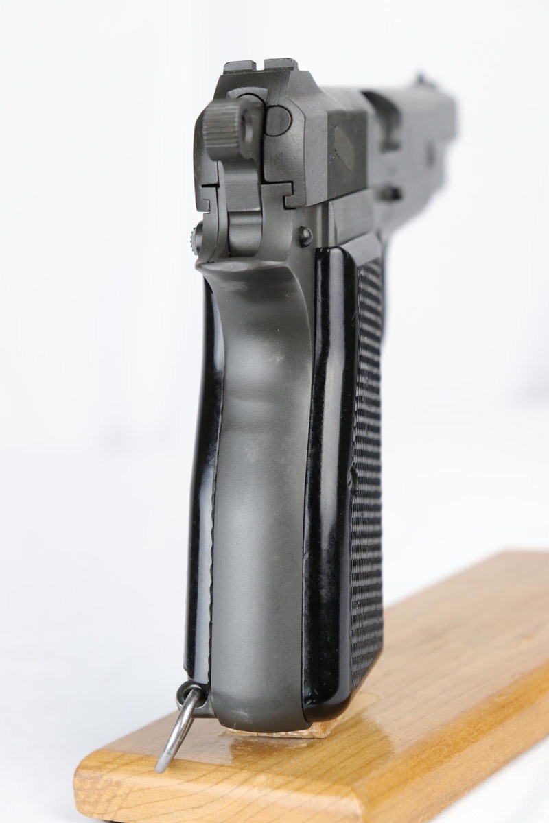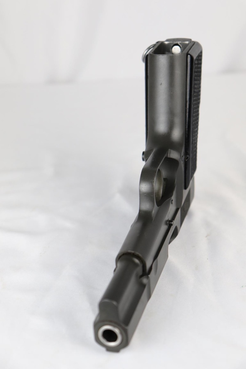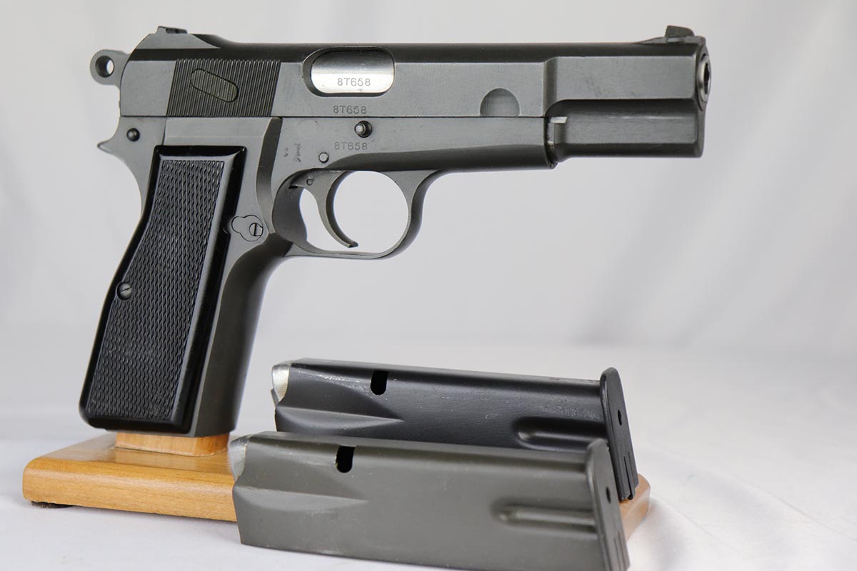 5/15/18 – This is a near-mint Canadian Inglis High Power rig that was manufactured in 1945.  The parkerized finish rates at 99% with only minor thinning of the color on the high edges of the slide.  The gun comes with an original holster that is dated 1945, and includes a spare magazine and cleaning rod.  Both magazines are properly JI marked.  Pistol has an excellent bore.
