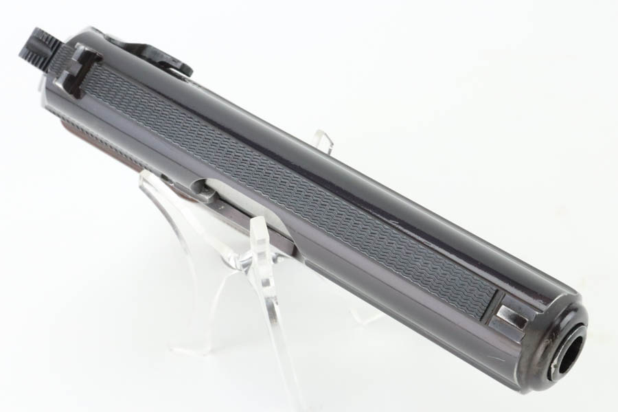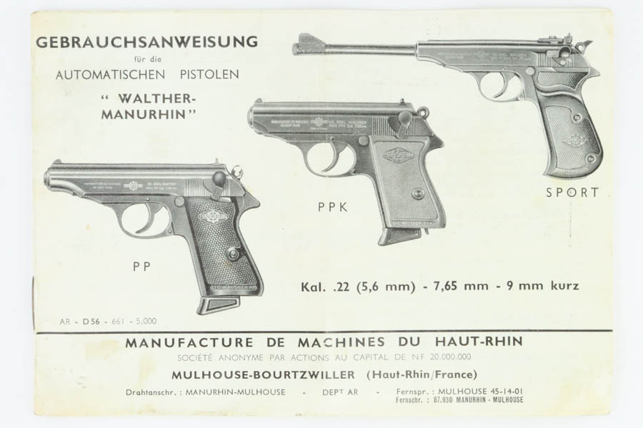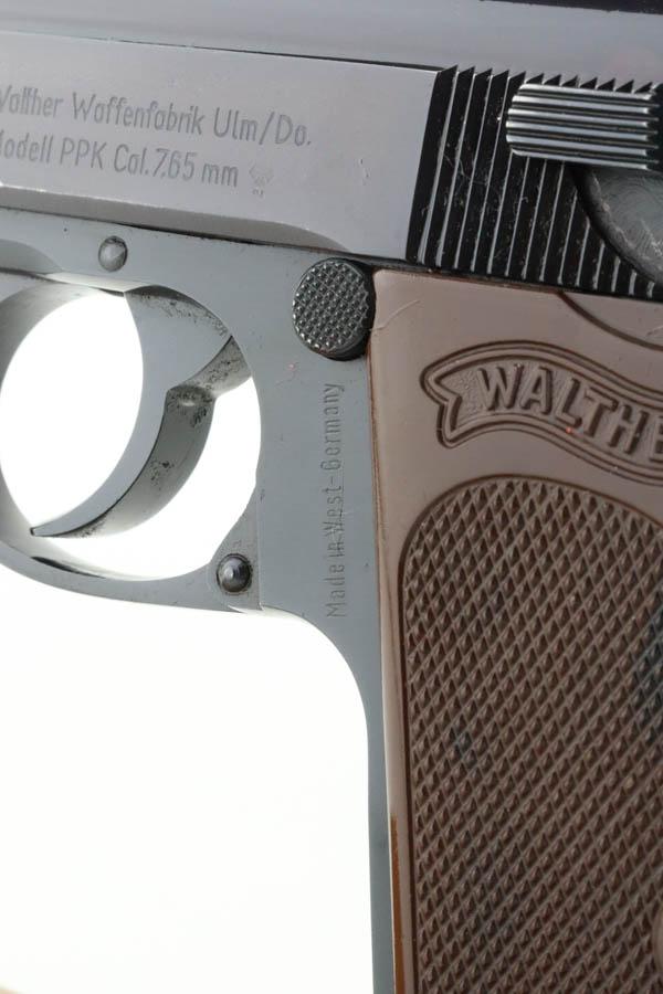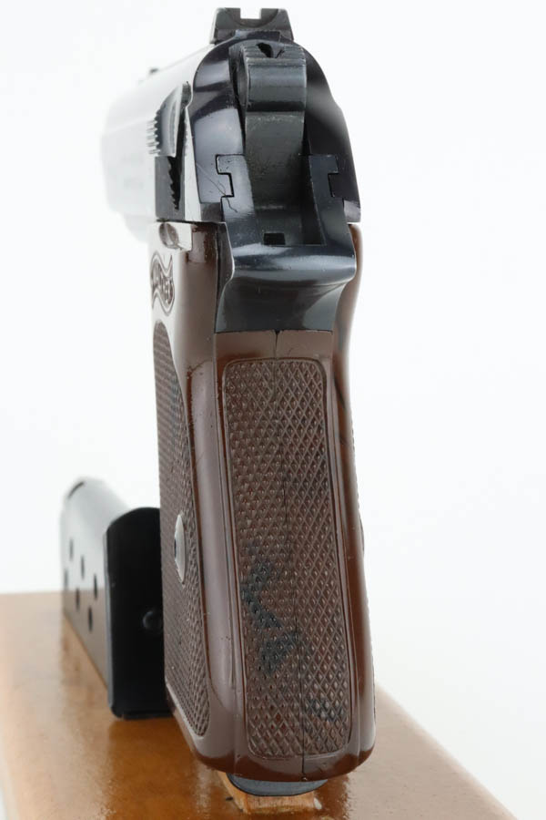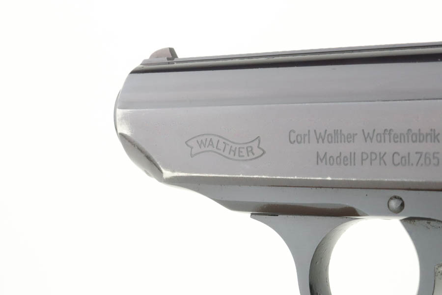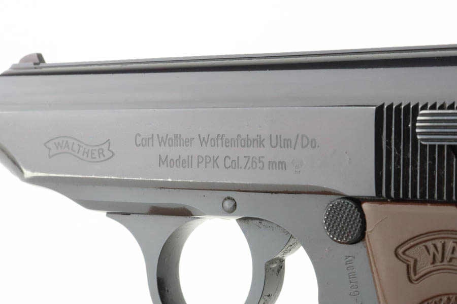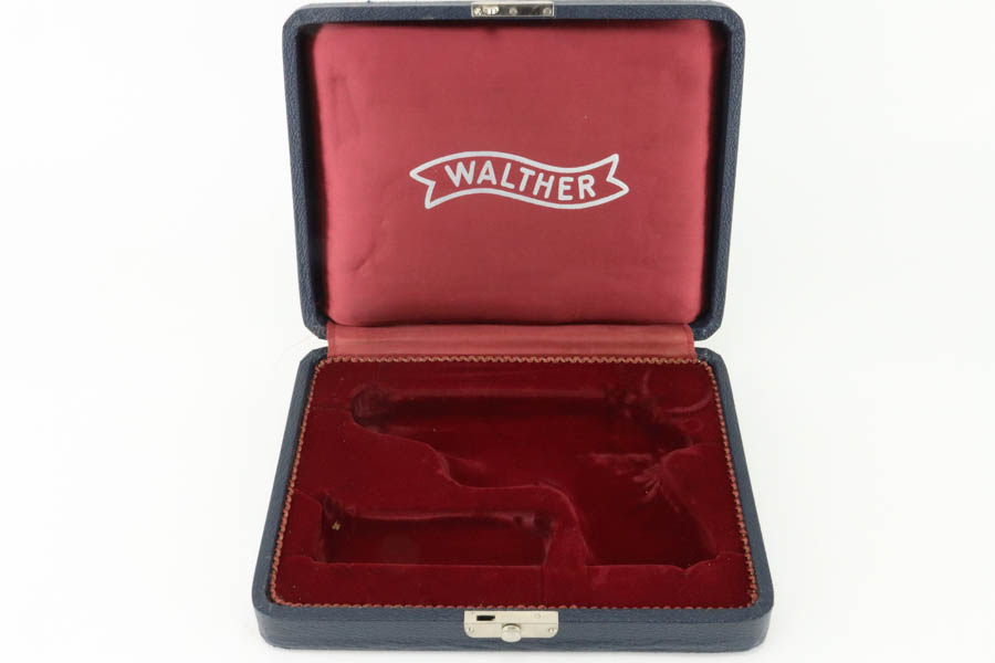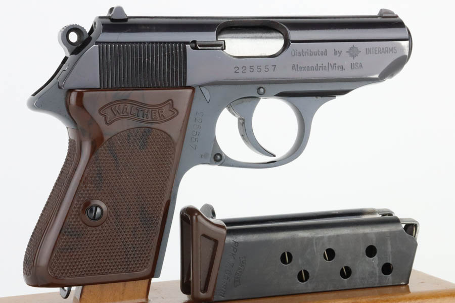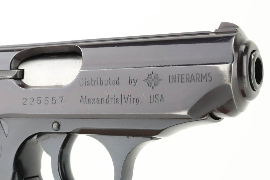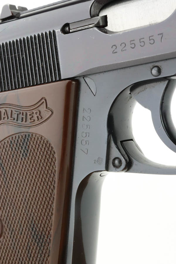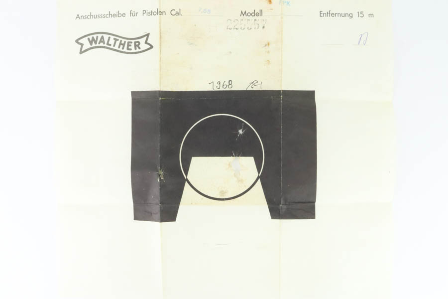 6/27/24 – This is a near-mint example of a Walther PPK, manufactured in 1968 and chambered in 7.65mm. All matching with West German proofs. Interarms marking on the slide. It comes with a Walther presentation case, matching test target, owners manual, cleaning rod, tool, and a spare magazine. The gun has retained nearly all of its original high polish finish with just minor muzzle wear. Fitted with black plastic grips. Minty bore.