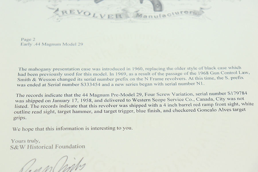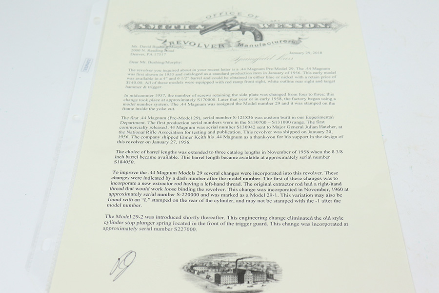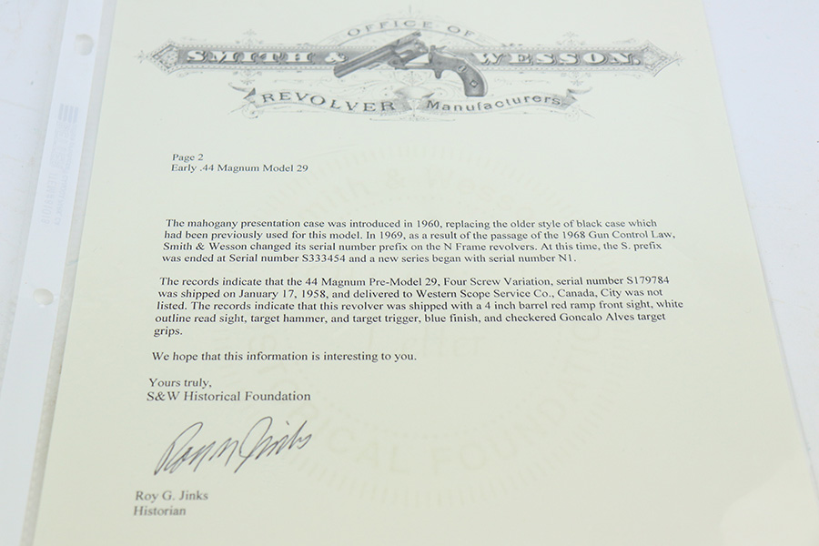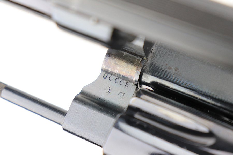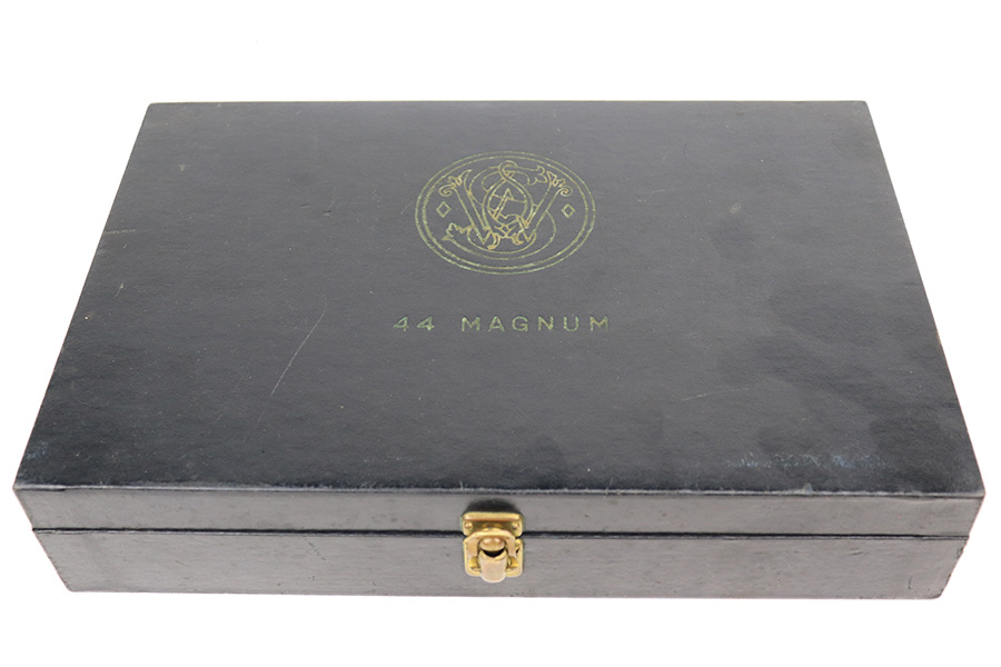 5/20/22 – This is a minty Smith & Wesson Pre-Model 29 in the black/blue factory S&W case with scarce 4in barrel. It is chambered for .44 magnum and has a minty bore. It’s accompanied by a S&W factory letter, though whether the mistake of the S&W archives or the buyer who ordered the letter, the serial number is incorrect (off by 60). So it’s likely this also shipped in January of 1958, but potentially not to where this letter states. The gun has 98% of the blue remaining with a minor turn line on the cylinder and a small area of wear on the left side of the frame. Minty bore and grips. Grips are not numbered. The case is in excellent condition and comes with the brush set.