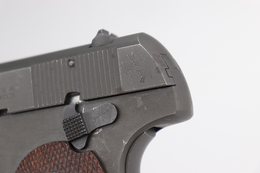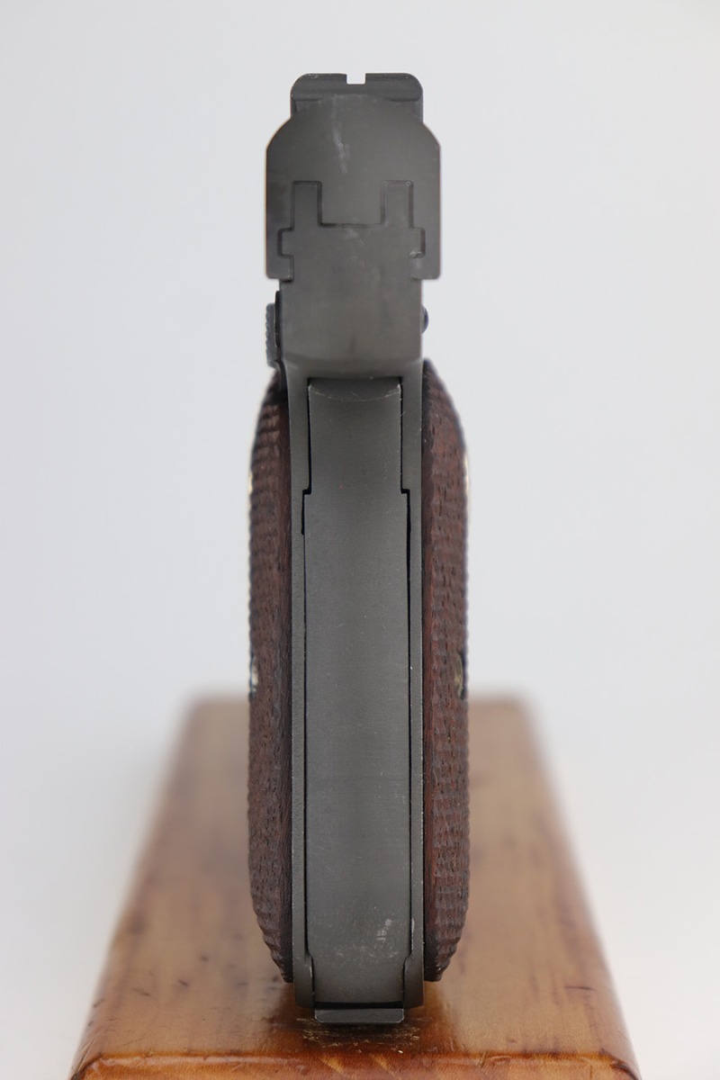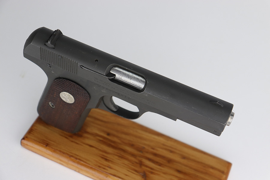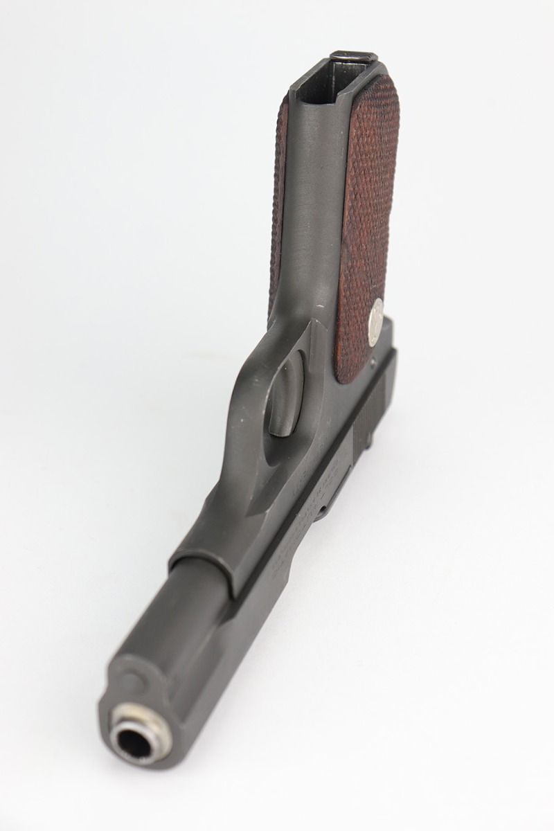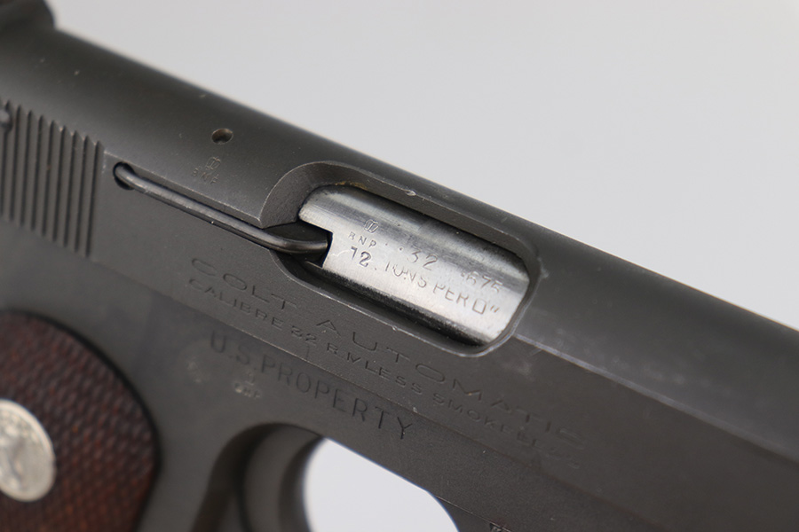 1/10/23 – This is a near-mint Colt M1903 officer’s pistol that was presumably sent to the UK as part of the lend-lease program during World War II. This is a U.S. Property marking on right side frame, and crossed cannons cartouche on left, and British proofs on the right side of the slide and frame. It has retained nearly all of its parkerized finish with a few tiny handling marks and scuffs here and there. Comes with minty wood grips and one proper blued magazine. Mint bore.