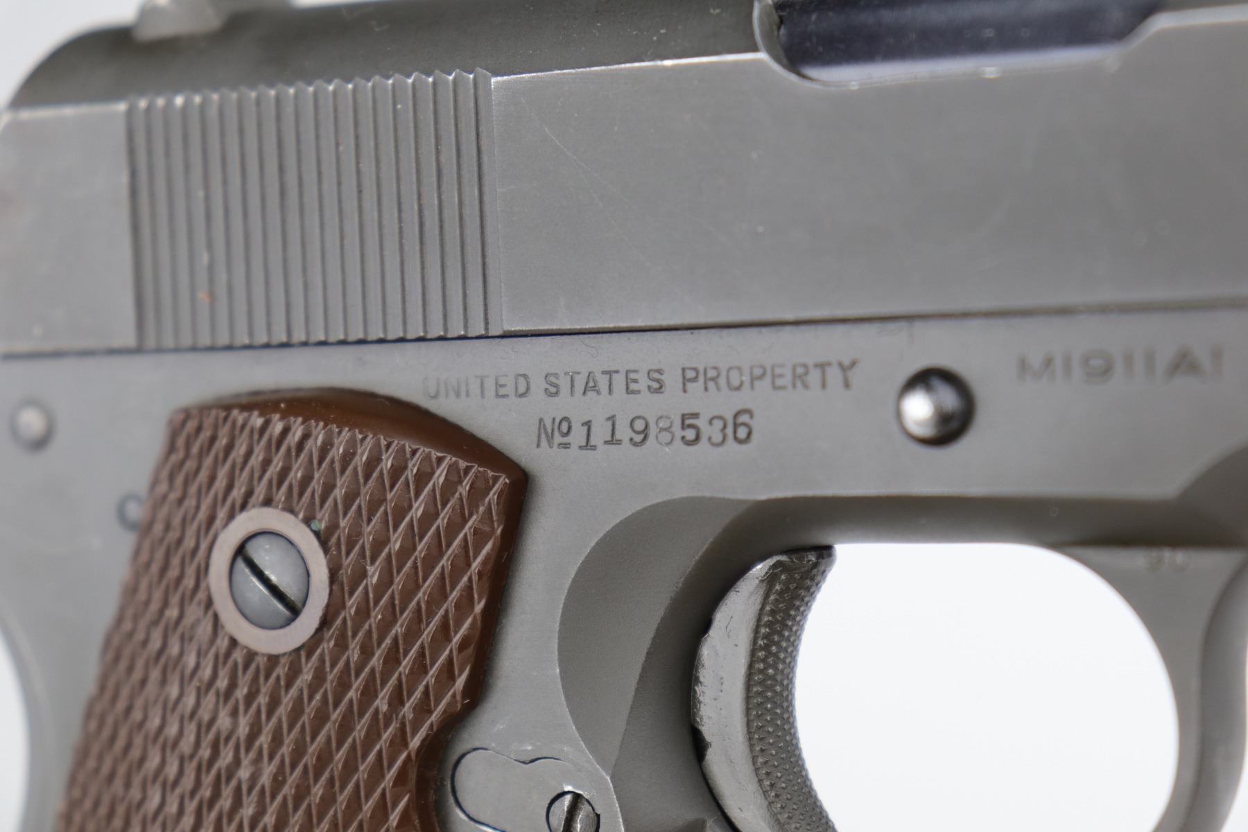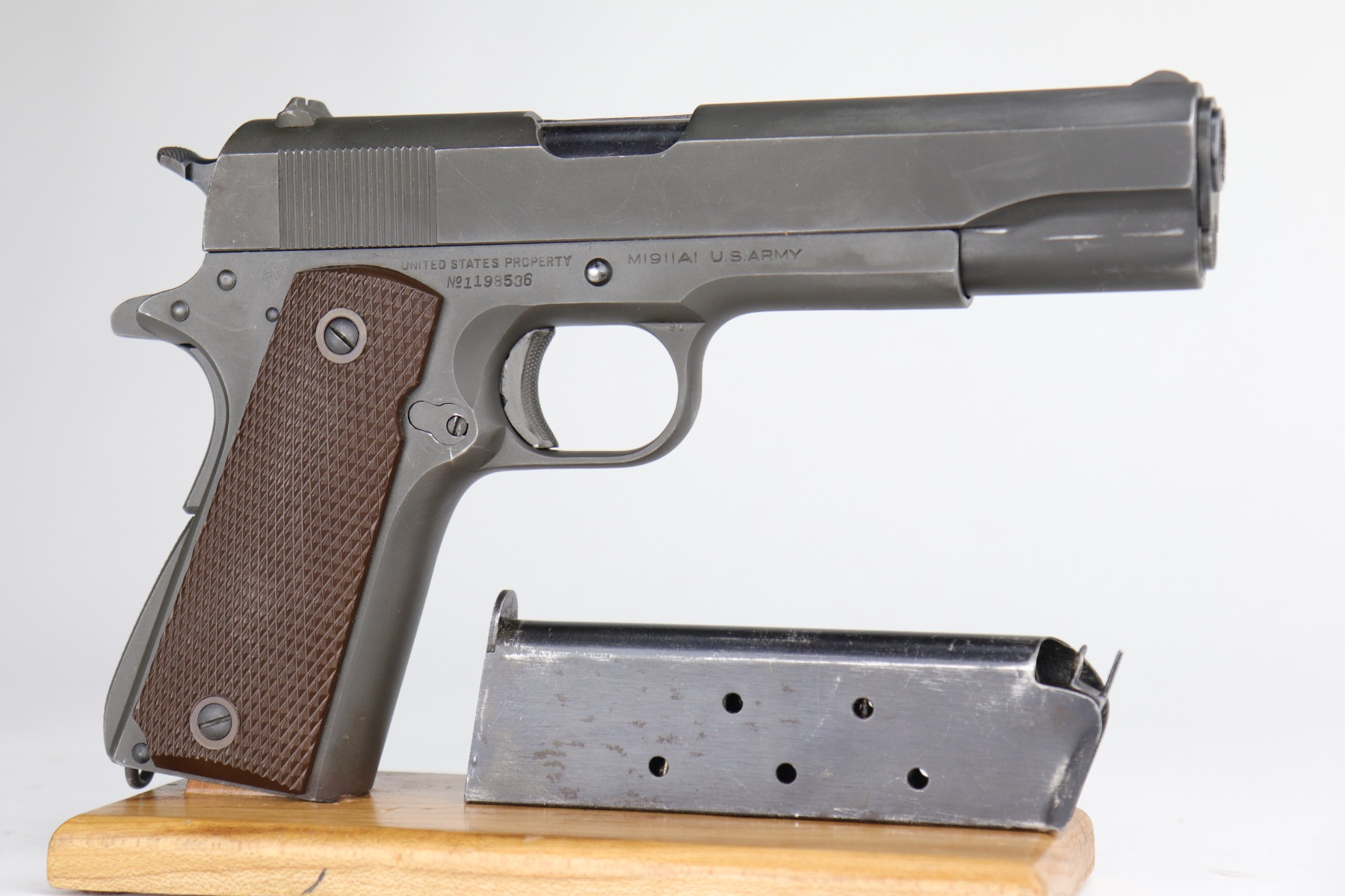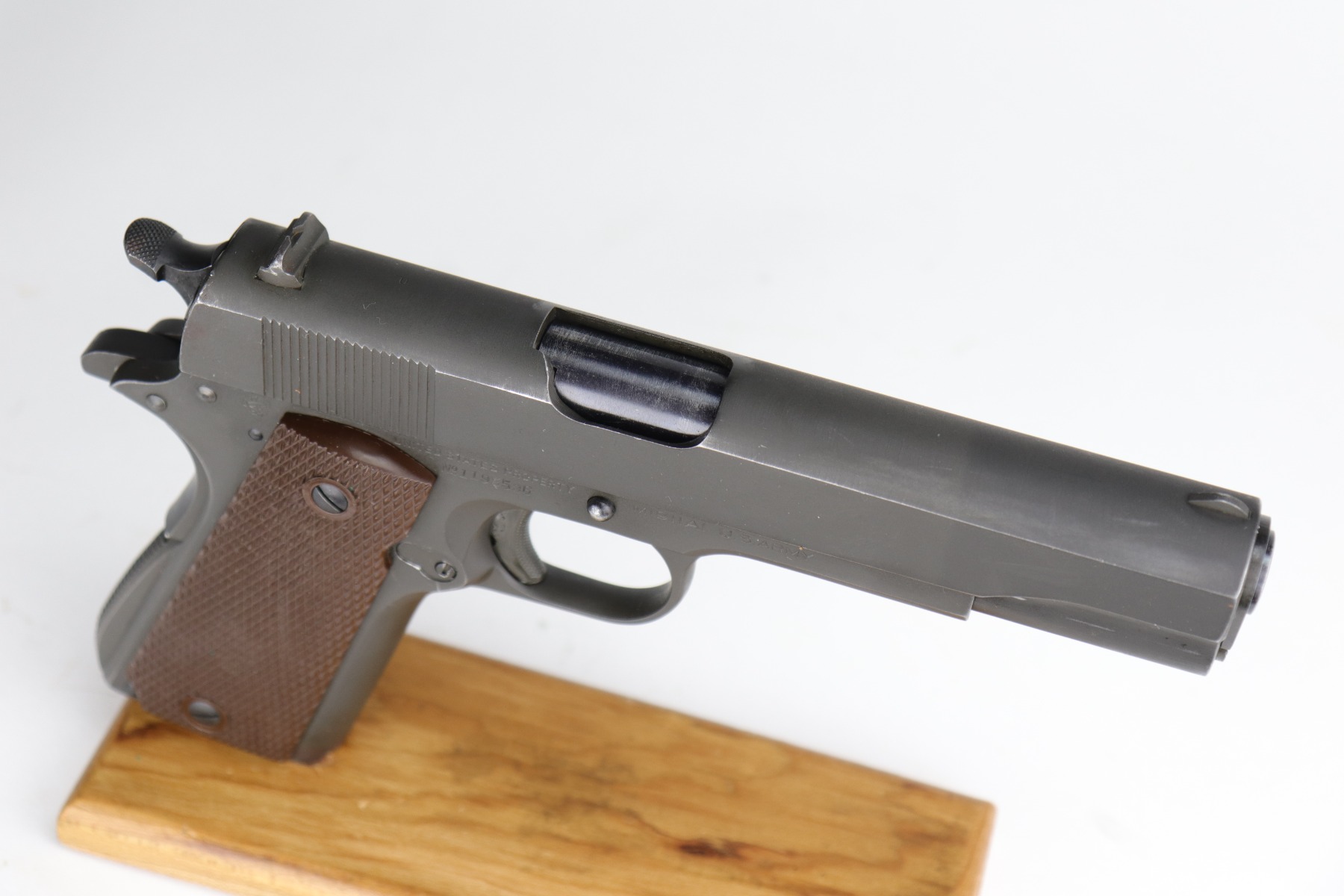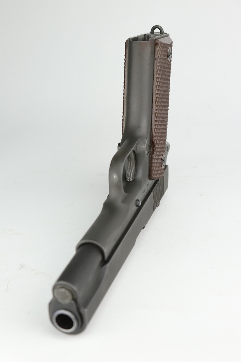 10/7/20 – This is a minty example of a Colt 1911A1 issued to the US Military in 1943. It is “US Property” marked and has a cross-canon cartouche on the tang. The slide is un-numbered, and it has a Colt barrel. This particular pistol is in beautiful condition, retaining about 98% of its original finish. There is just very minor high edge wear on the slide and frame. Very little oxidation at the base of the front strap. There are a few scratches from the takedown lever. It comes with one period-correct magazine and minty grips. The bore is nice, great rifling with some areas of light pin-pricking. Beautiful example.