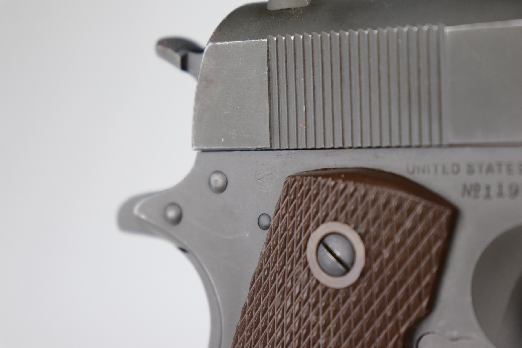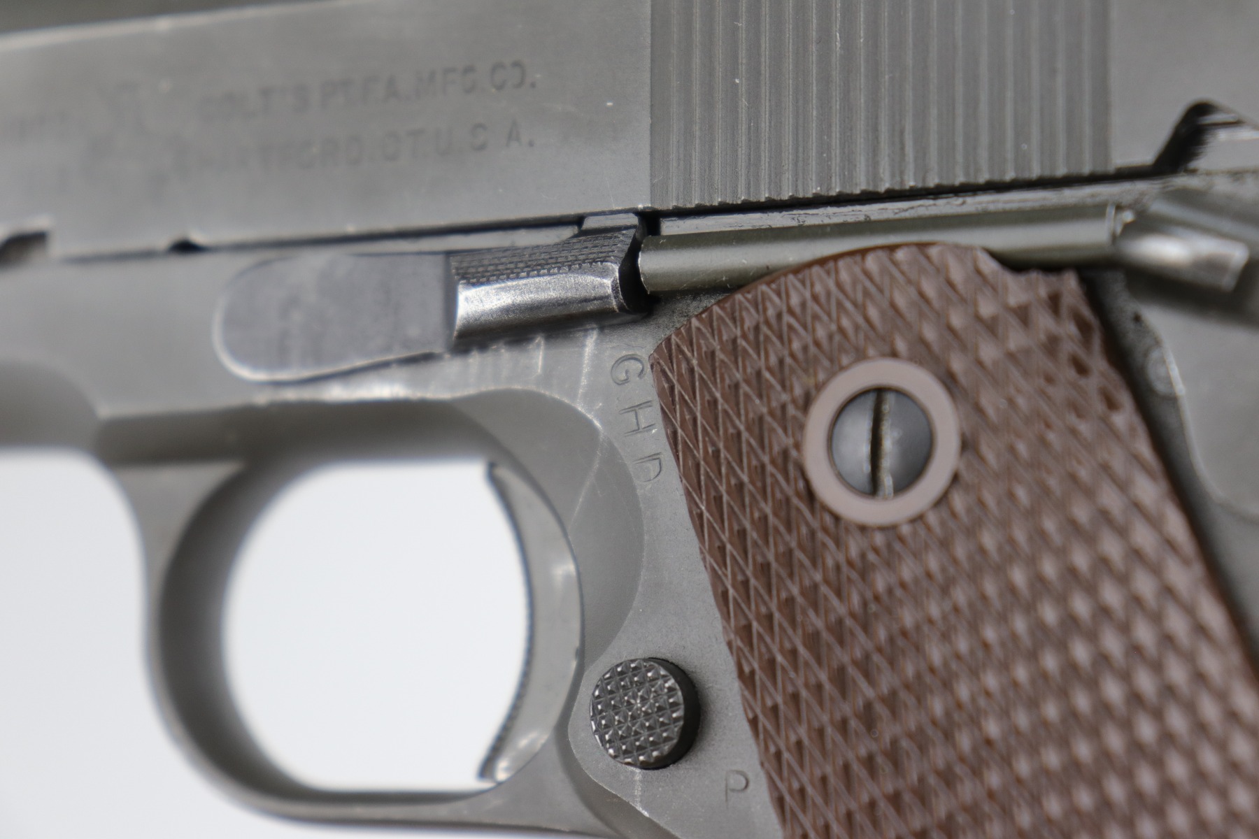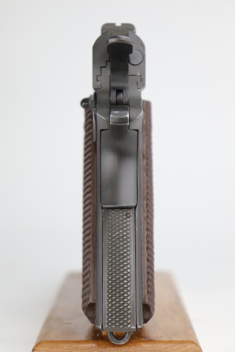 10/7/20 – This is a minty example of a Colt 1911A1 issued to the US Military in 1943. It is “US Property” marked and has a cross-canon cartouche on the tang. The slide is un-numbered, and it has a Colt barrel. This particular pistol is in beautiful condition, retaining about 98% of its original finish. There is just very minor high edge wear on the slide and frame. Very little oxidation at the base of the front strap. There are a few scratches from the takedown lever. It comes with one period-correct magazine and minty grips. The bore is nice, great rifling with some areas of light pin-pricking. Beautiful example.