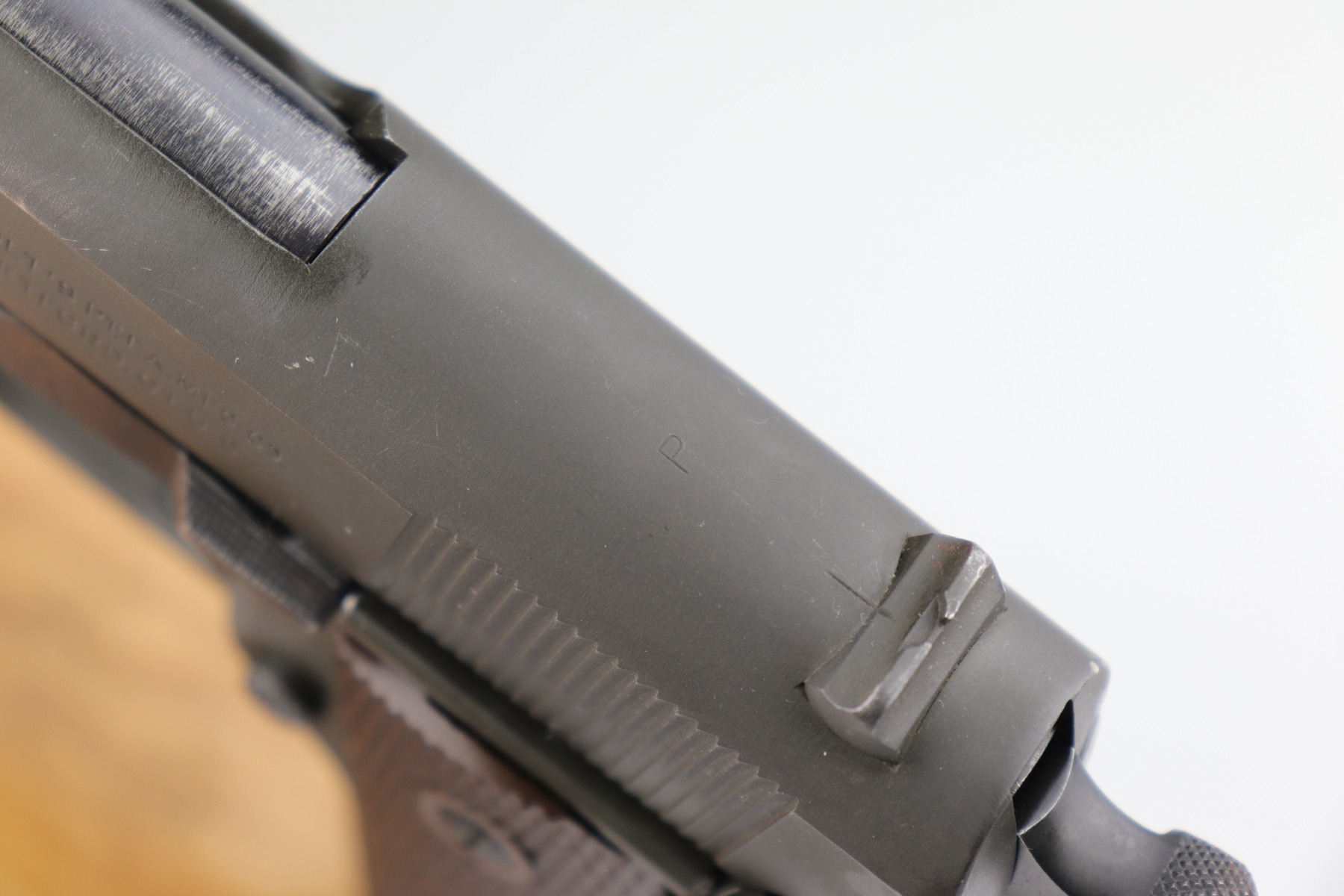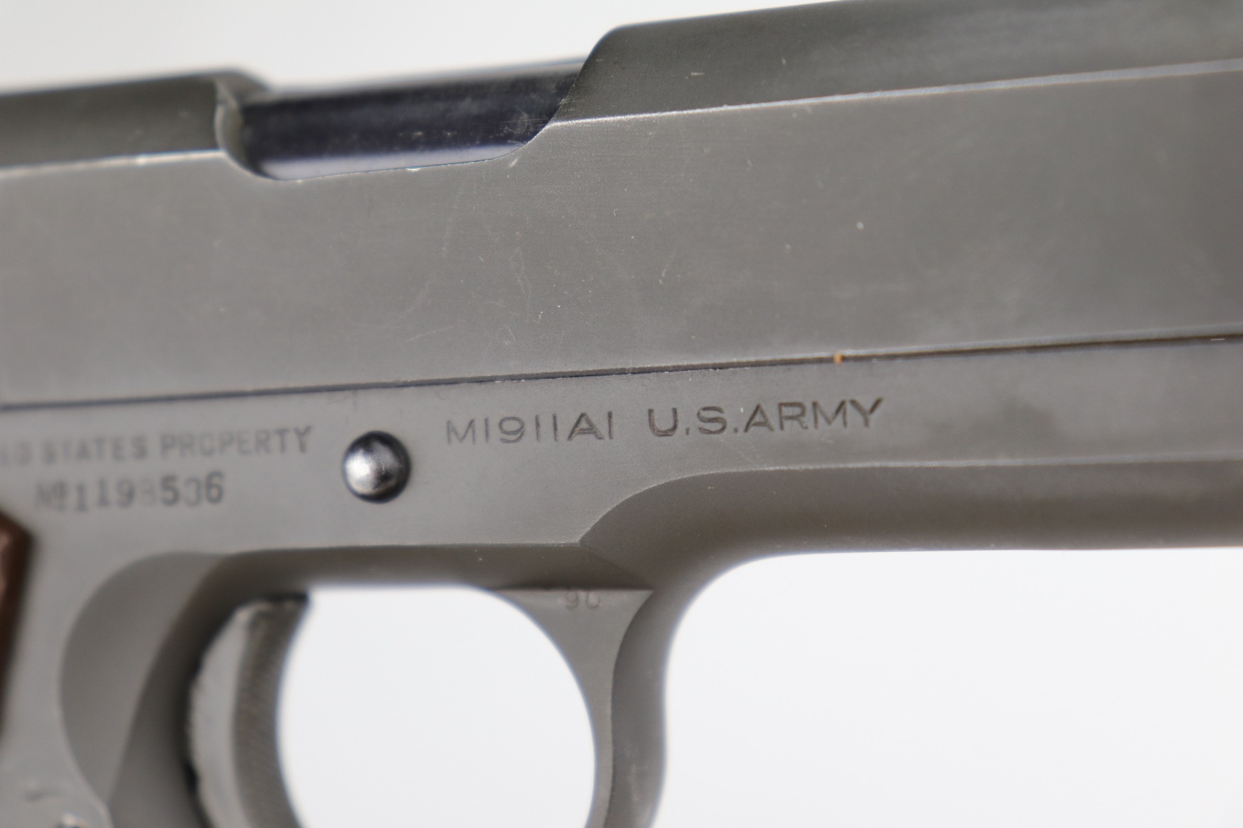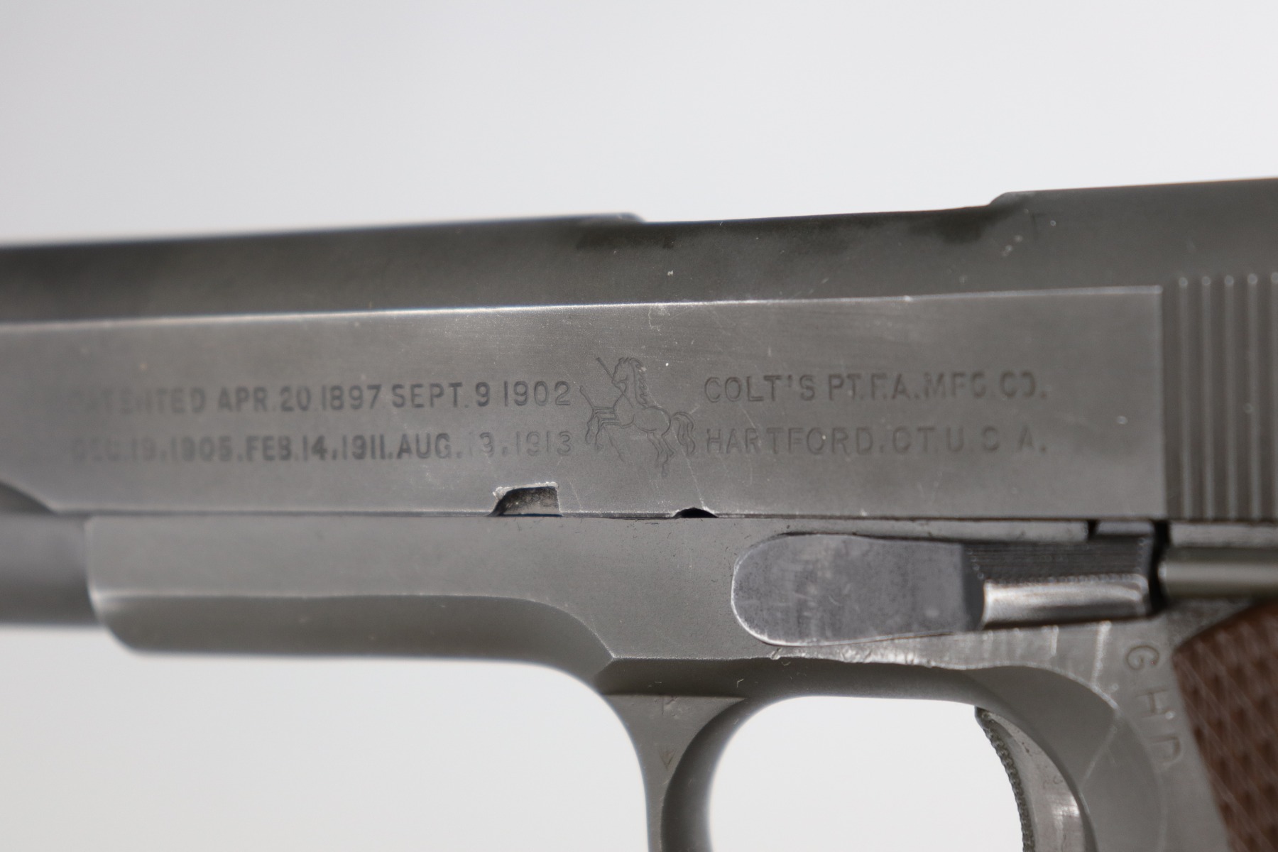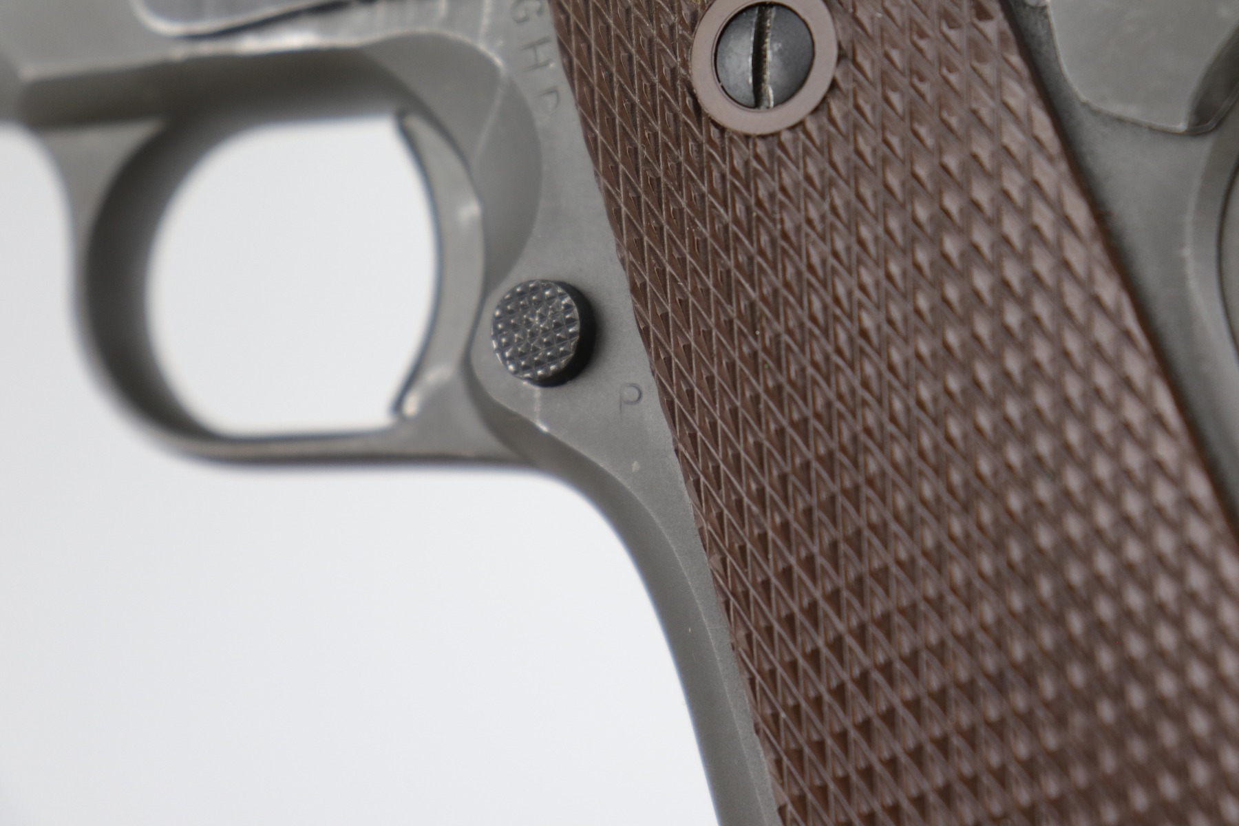 10/7/20 – This is a minty example of a Colt 1911A1 issued to the US Military in 1943. It is “US Property” marked and has a cross-canon cartouche on the tang. The slide is un-numbered, and it has a Colt barrel. This particular pistol is in beautiful condition, retaining about 98% of its original finish. There is just very minor high edge wear on the slide and frame. Very little oxidation at the base of the front strap. There are a few scratches from the takedown lever. It comes with one period-correct magazine and minty grips. The bore is nice, great rifling with some areas of light pin-pricking. Beautiful example.