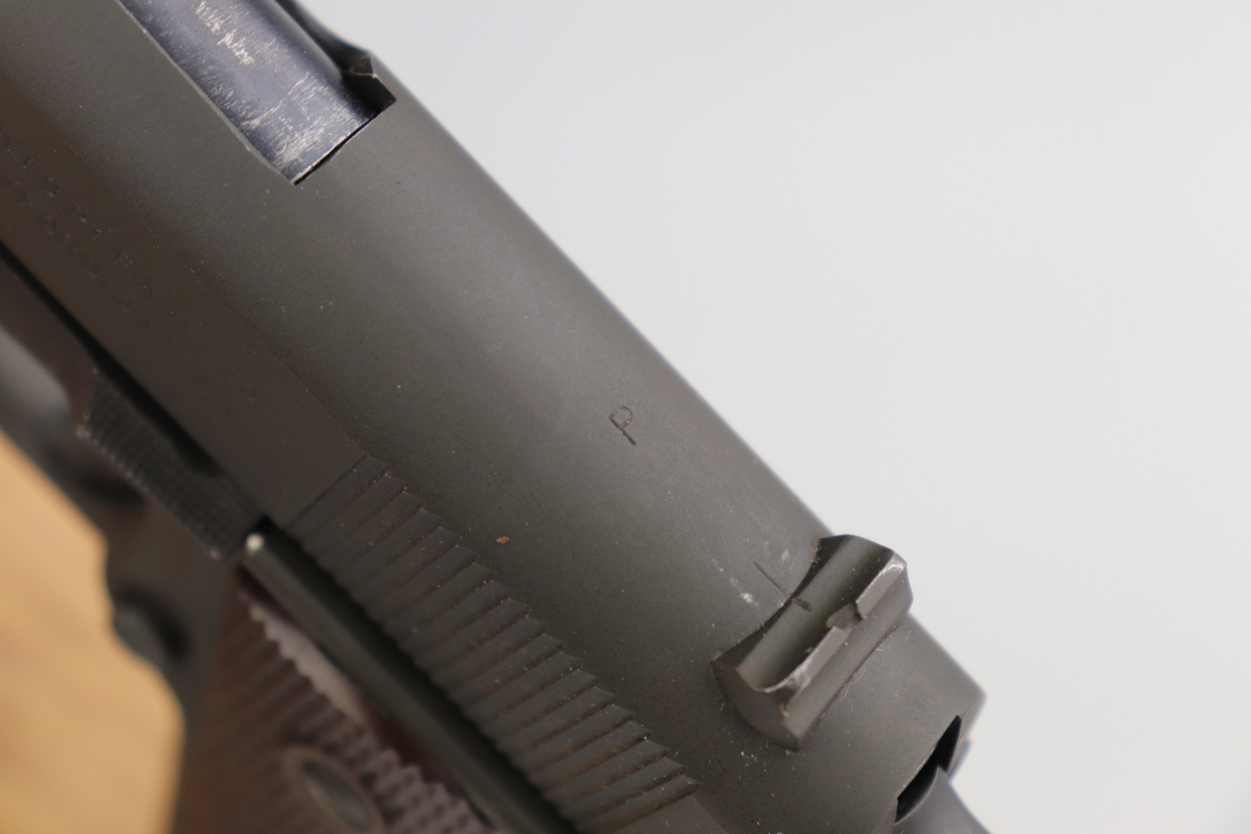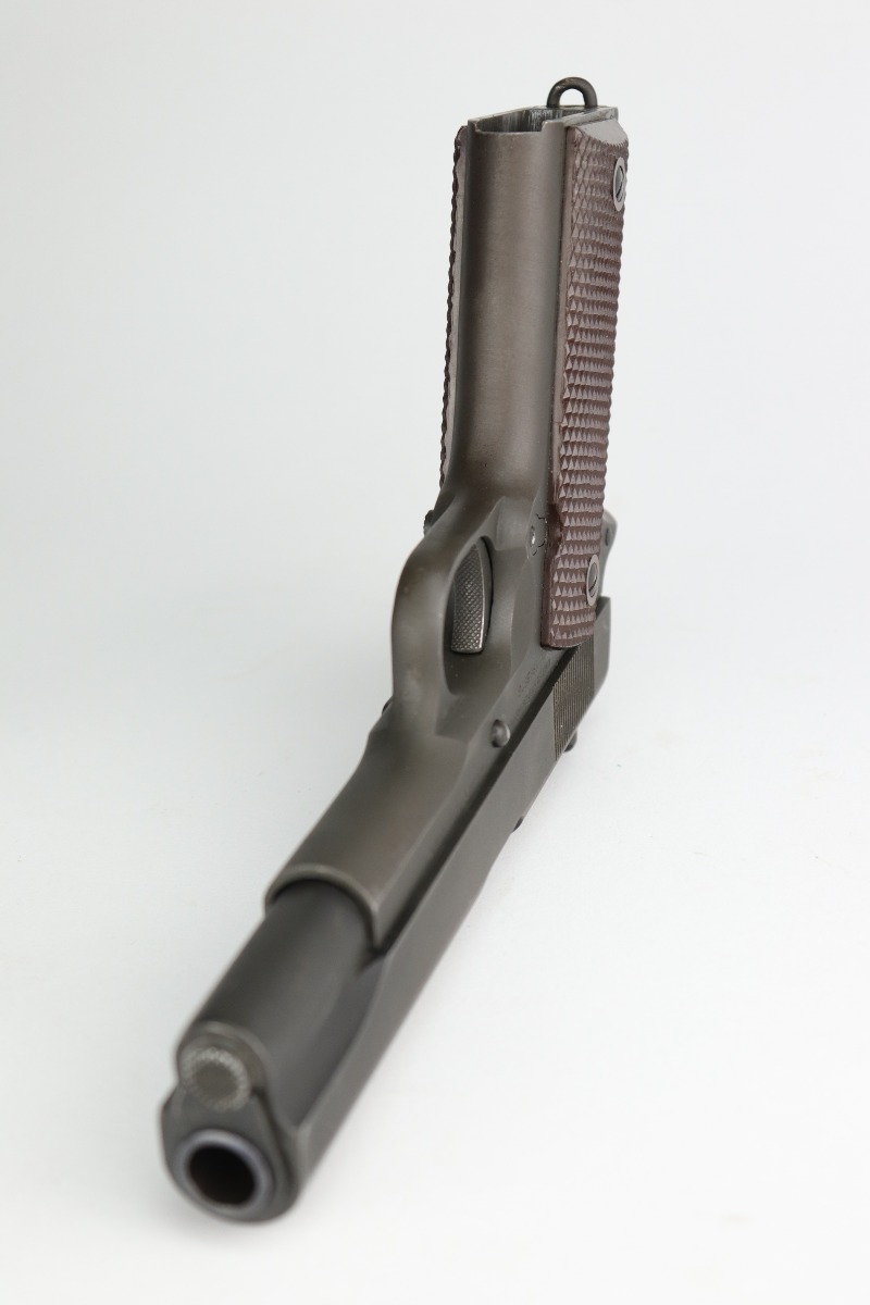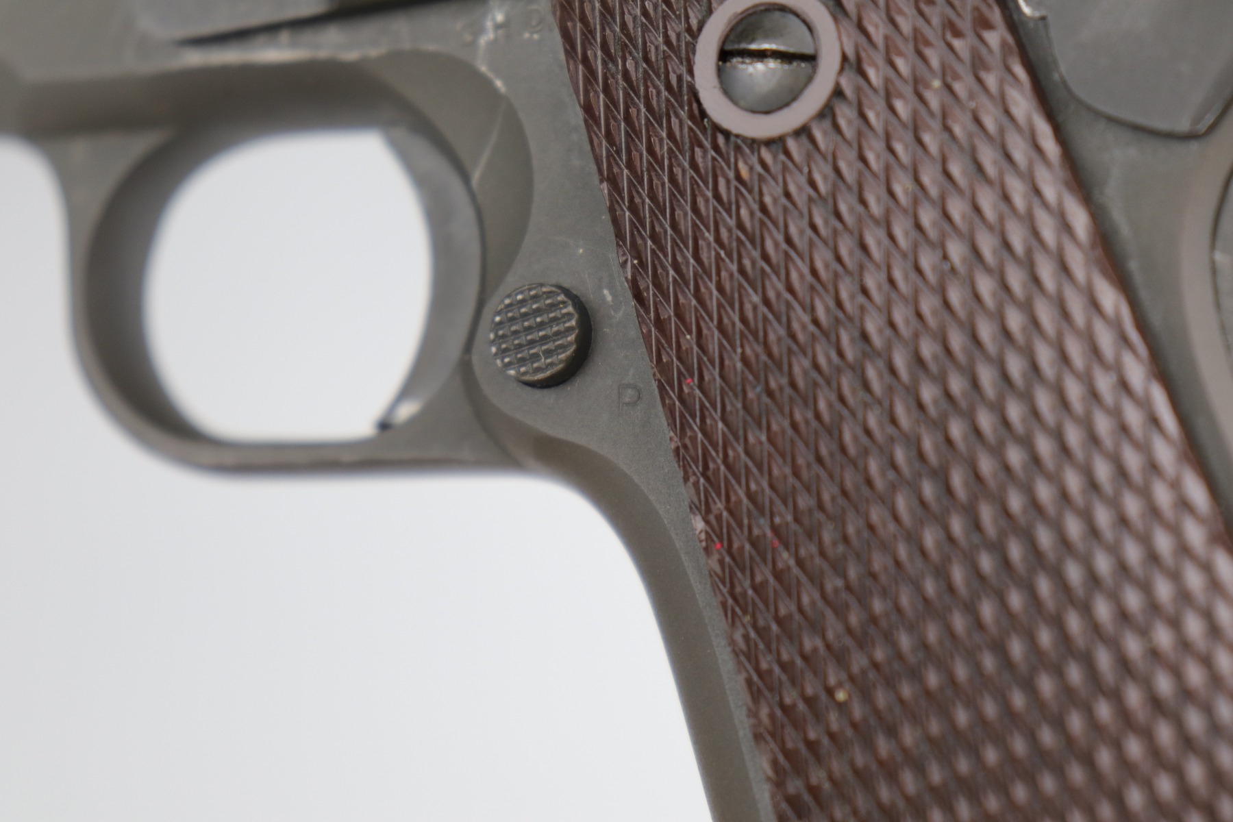 10/8/20 – This is a minty example of a Colt 1911A1, issued to the US Military in 1943. It is “US Property” marked and has a cross-canon military cartouche on the tang. The slide is numbered and matches the slide. This gun has retained over 98% of its finish. There is a hint of wear around the muzzle and a few scratches from the takedown lever. There is some freckling on the top of the slide toward the muzzle and one small area of pitting around the muzzle on the underside of the slide. It comes with excellent grips and a correct magazine. The bore has good rifling, but there is minor pitting in the grooves.