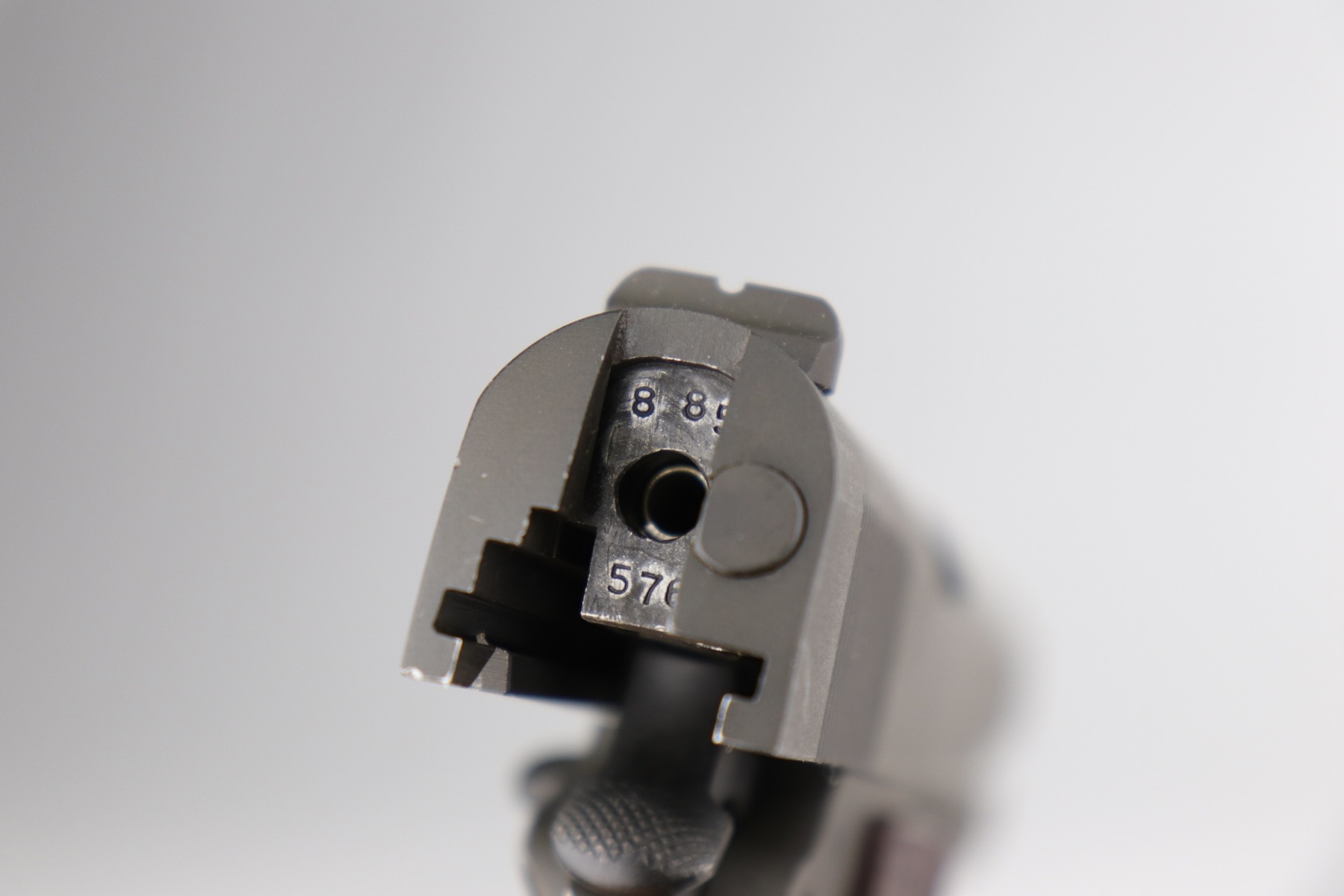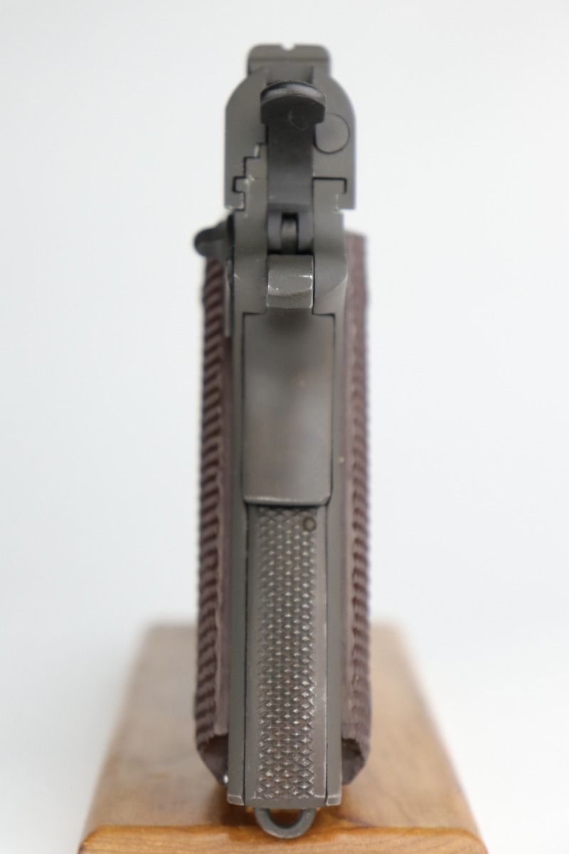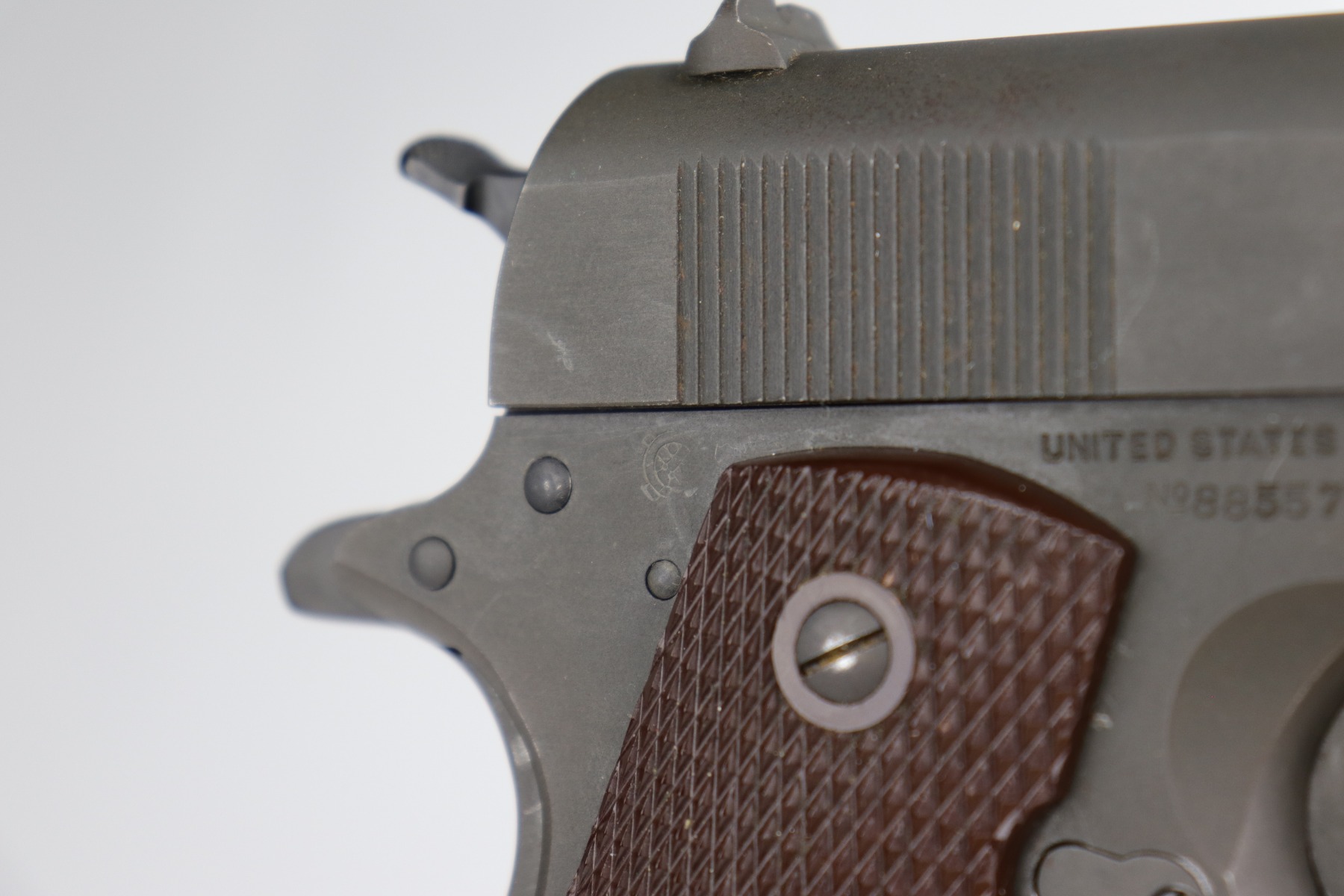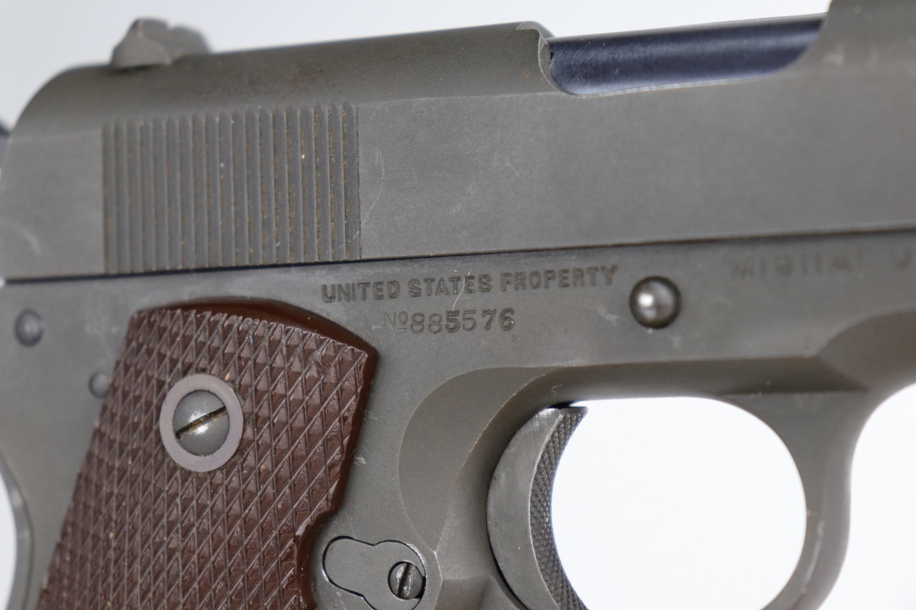 10/8/20 – This is a minty example of a Colt 1911A1, issued to the US Military in 1943. It is “US Property” marked and has a cross-canon military cartouche on the tang. The slide is numbered and matches the slide. This gun has retained over 98% of its finish. There is a hint of wear around the muzzle and a few scratches from the takedown lever. There is some freckling on the top of the slide toward the muzzle and one small area of pitting around the muzzle on the underside of the slide. It comes with excellent grips and a correct magazine. The bore has good rifling, but there is minor pitting in the grooves.