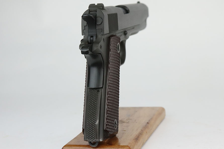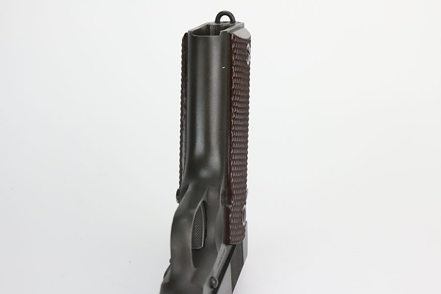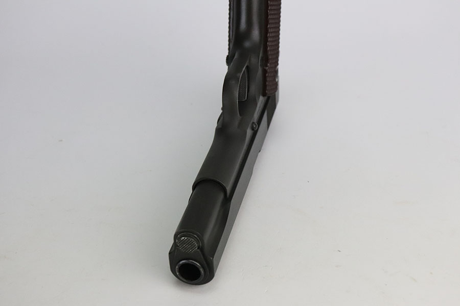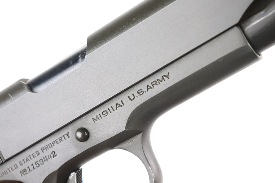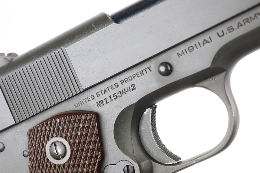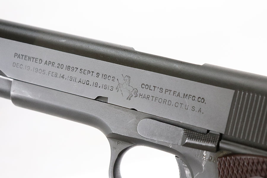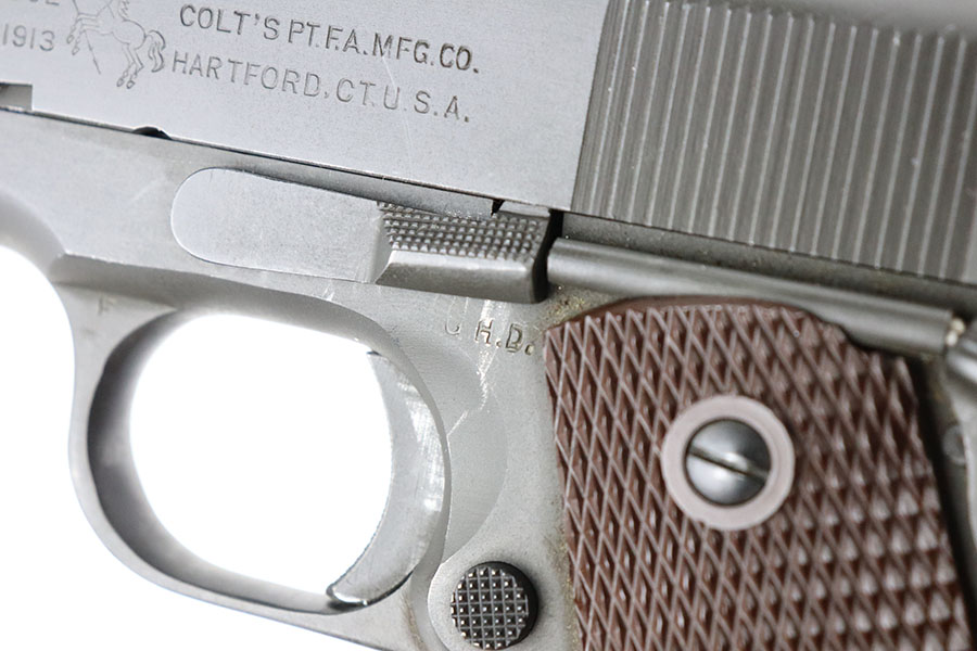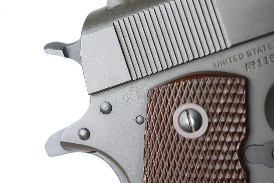 7/21/21 – This is a near-mint Colt 1911A1 that was made in 1943. It has about 98% of the original, parkerized finish remaining. Minor wear on the front edge of frame and a line of finish loss on left side of slide where it rubs against the inside of the frame. Proper G.H.D. inspector mark on frame, with P proofs on slide and frame. Correct Colt barrel with ‘F’ under lug and a minty bore. Minty grips, too, with hardly any handling wear. ‘R’ marked magazine.