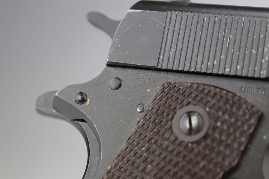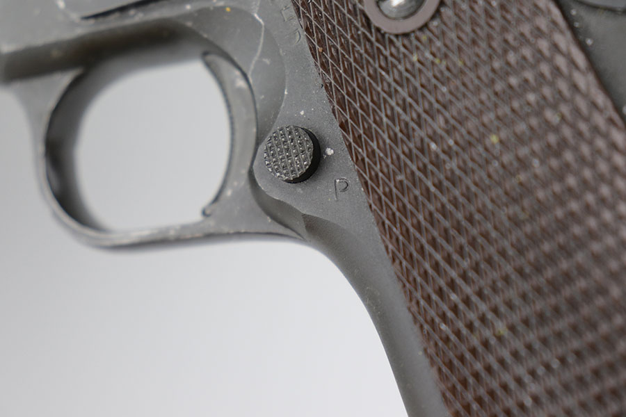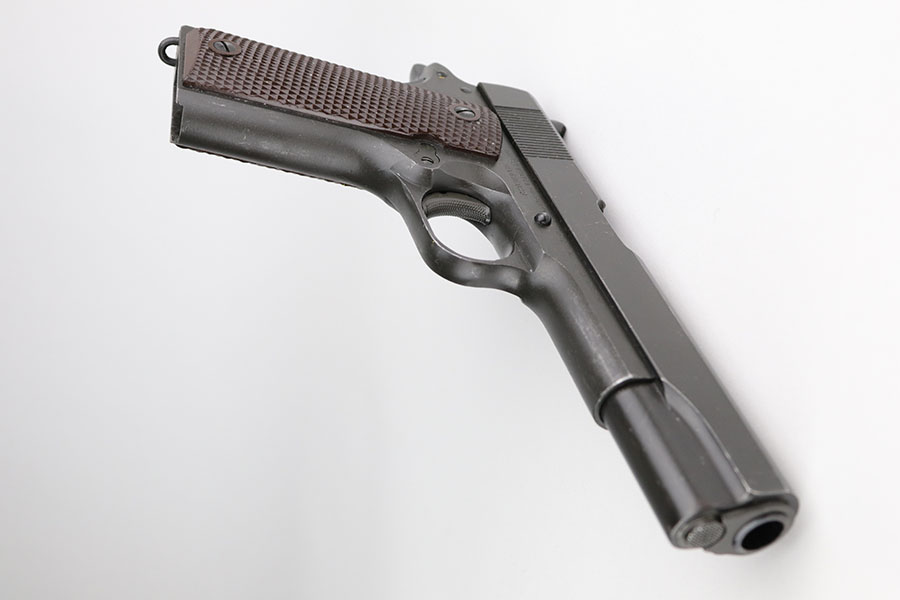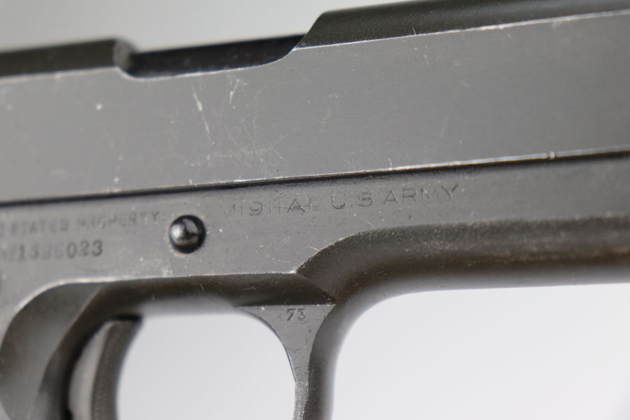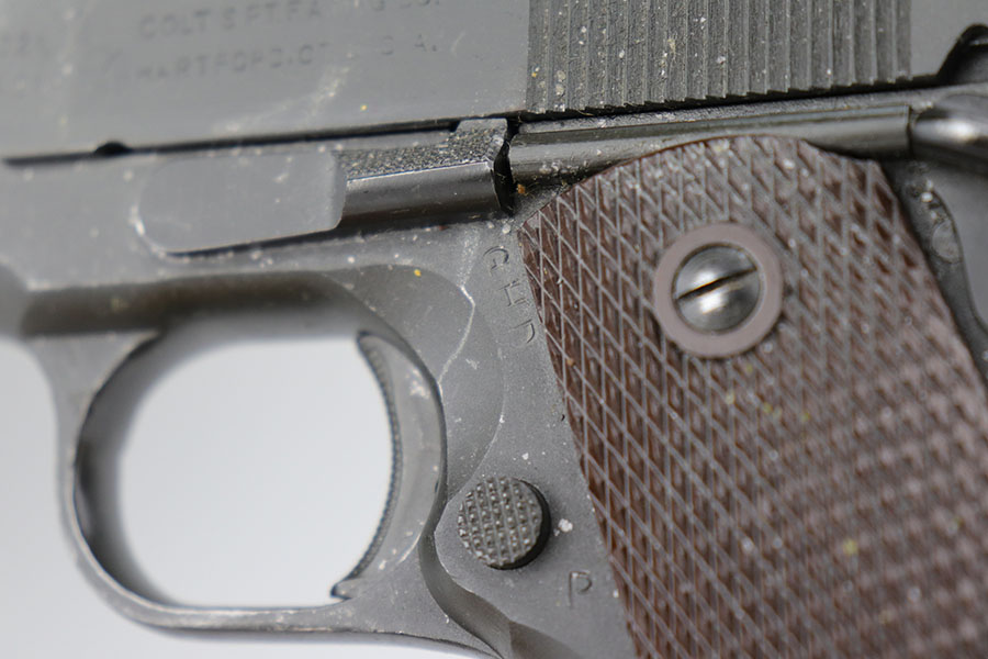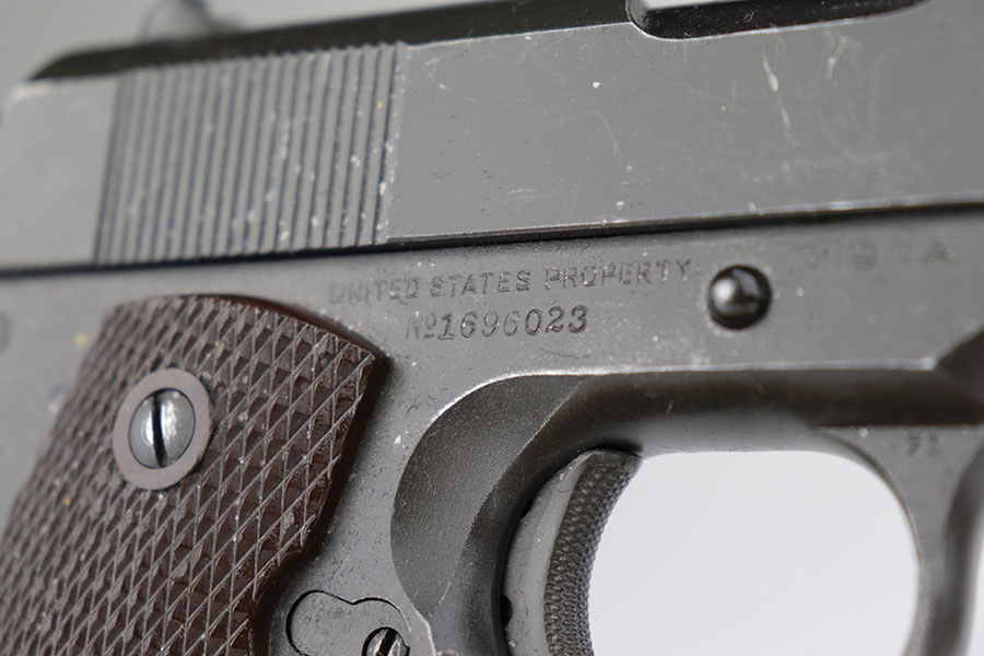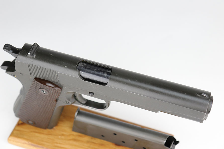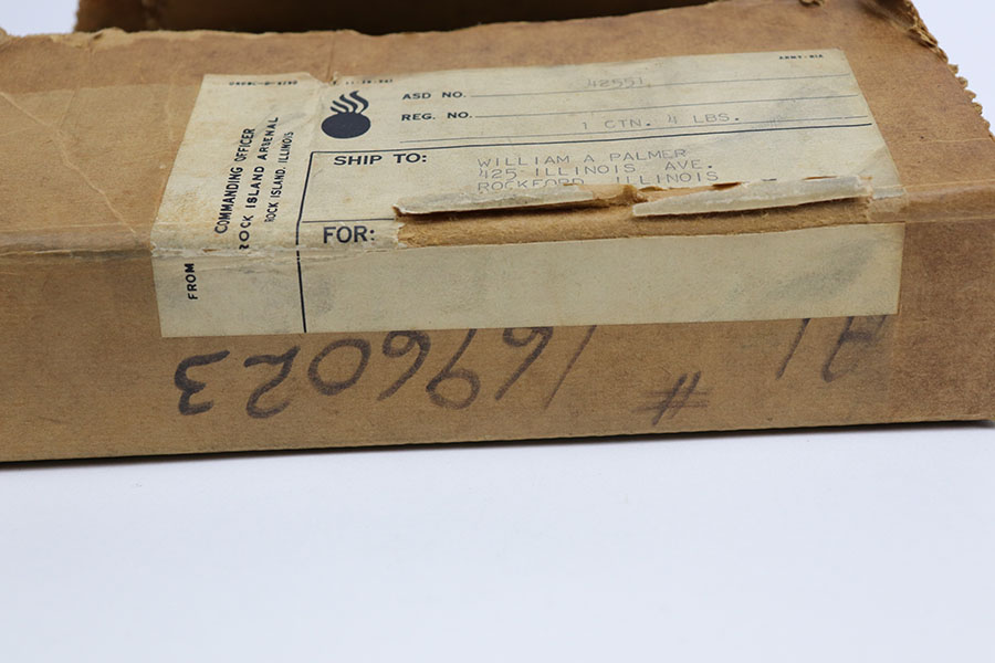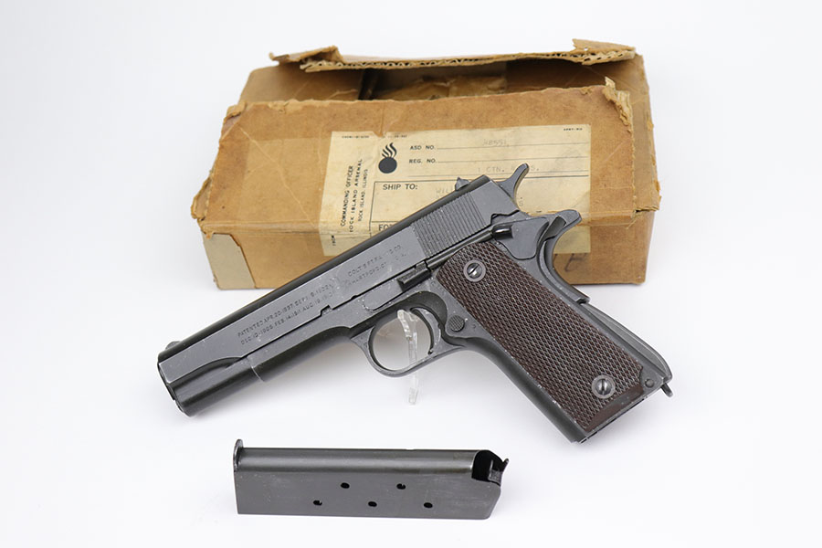 6/15/21 – This is a near-mint Colt 1911A1, manufactured in 1944. It is 100% correct and original with no changed or swapped parts. The finish on all parts is all original and not a re-arsenal and has not been re-parkerized. The pistol comes with the original Rock Island Armory shipping box (properly pencil numbered to the gun), with shipping label still intact, and the original U.S. Government requisition and invoice shipping documents (DD-1149-4) . This pistol is NOT one of the recent DCM released 1911’s, but a true government release. The date of the sale is noted as 3-20-61. There is no serial number noted on the shipping document, but the shipping label on the box and the shipping document both contain the same name, address, and city of sale and delivery. There is no doubt that the shipping document makes reference to this particular Colt 1911A1. To find a WW2 1944 manufactured Colt 1911A1 in this condition, along with the matching original shipping box and matching U.S. Government release papers is scarce and this example would be nearly impossible to upgrade. Proper inspectors marks with mint bore. Original Colt barrel. Magazine is ‘S’ marked.