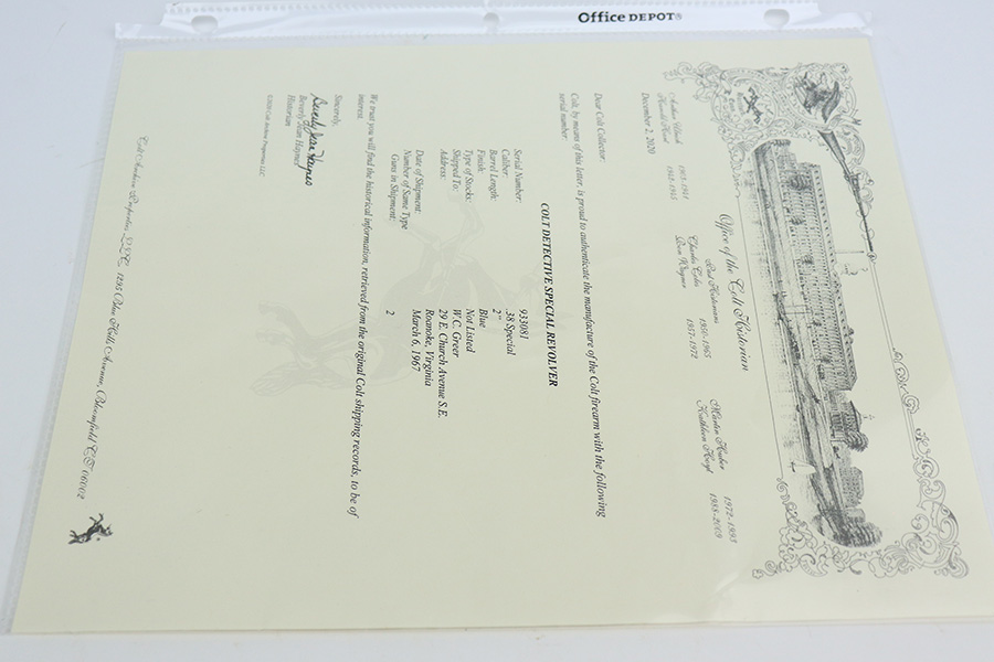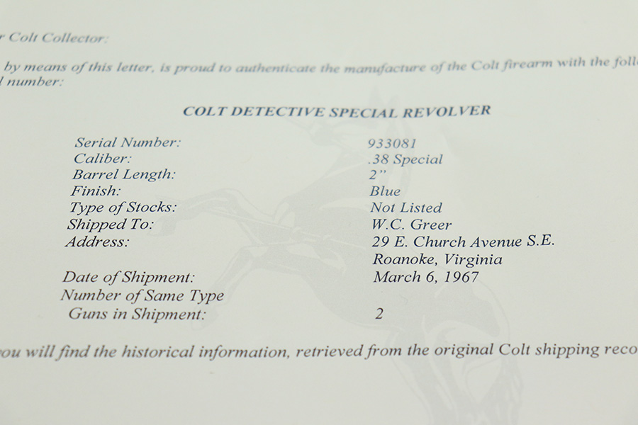 12/1/21 – This is a minty Colt Detective Special revolver with Colt archive letter included. It has 99% of the original blue with only a hint of a turn line on the cylinder, and bit of patina on the trigger guard. Minty bore and grips. Two inch barrel, chambered for .38 special. The archive letter states it was shipped to an individual in Virginia in March of 1967. C&R eligible.
