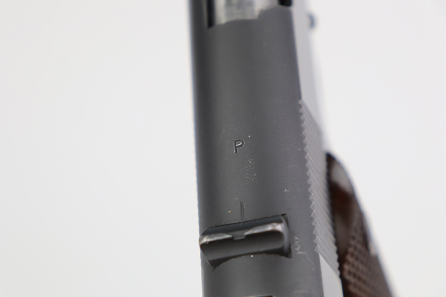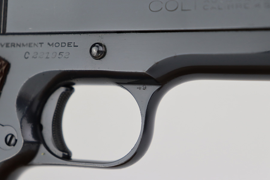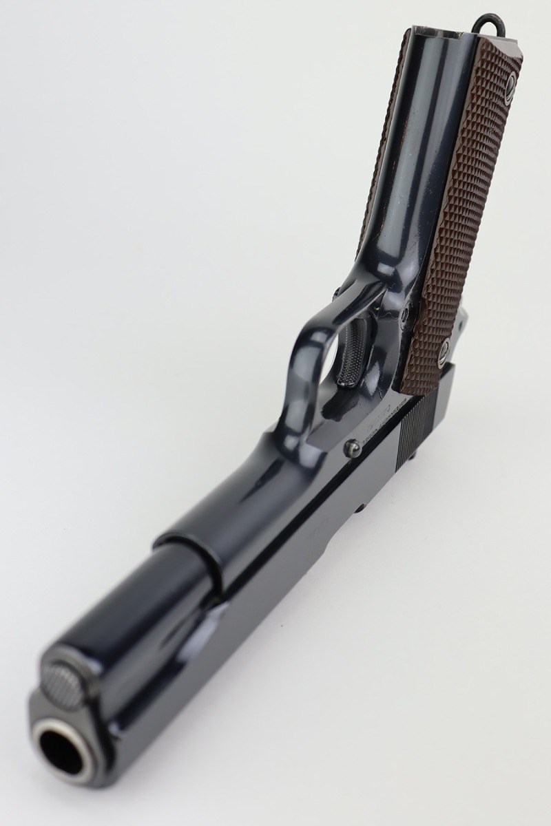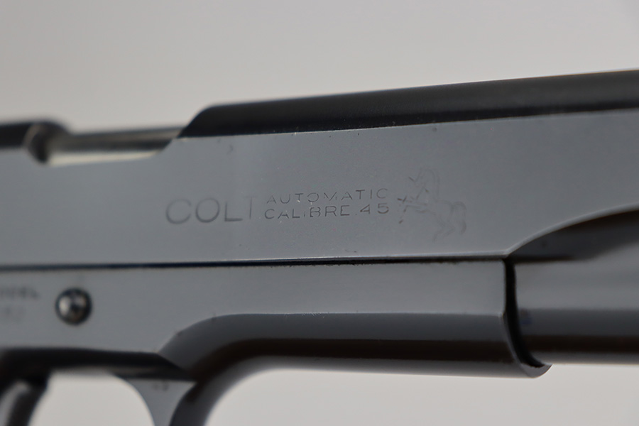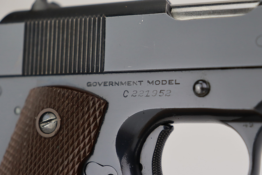 6/26/23 – This is a near-mint Colt Government Model 1911A1 from 1946. Gorgeous profile view with just a hint of edge wear near the muzzle. Proper matte finish along the top of the slide with polished blue elsewhere. Nearly all of the finish loss is on the grip safety, and a few minuscule surface scratches on the left side of the frame. Also a minor ding on front strap. Mint bore and excellent grips. Barrel is Colt marked with a small ‘F’ under the lug. Unmarked commercial mag.