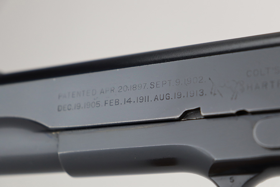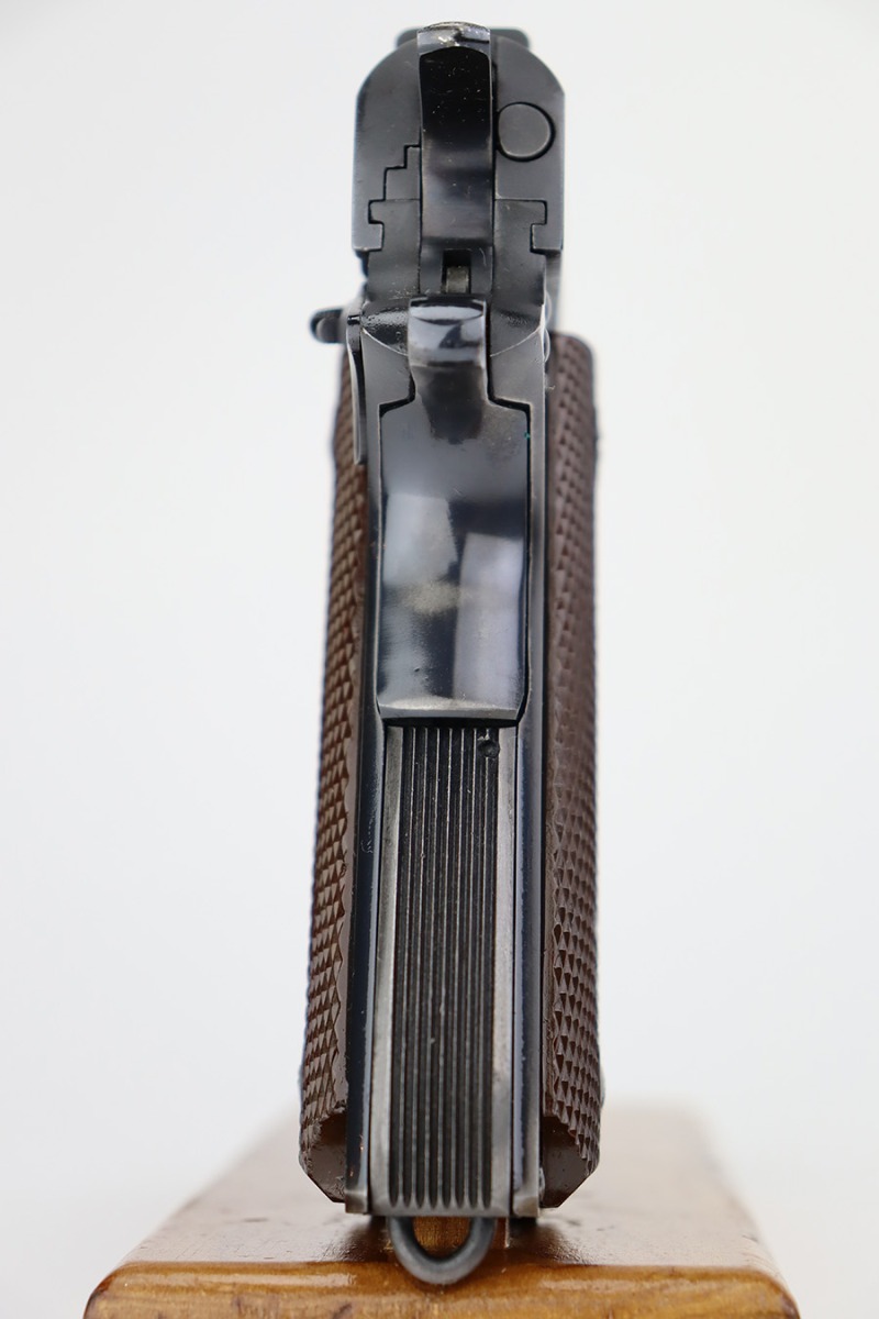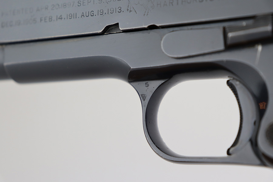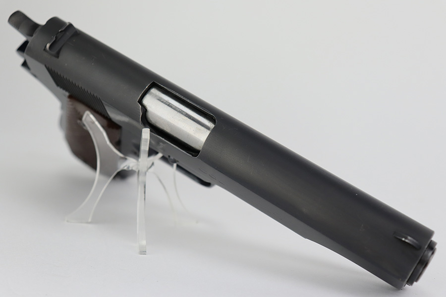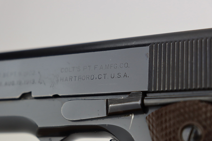 6/26/23 – This is a near-mint Colt Government Model 1911A1 from 1946. Gorgeous profile view with just a hint of edge wear near the muzzle. Proper matte finish along the top of the slide with polished blue elsewhere. Nearly all of the finish loss is on the grip safety, and a few minuscule surface scratches on the left side of the frame. Also a minor ding on front strap. Mint bore and excellent grips. Barrel is Colt marked with a small ‘F’ under the lug. Unmarked commercial mag.