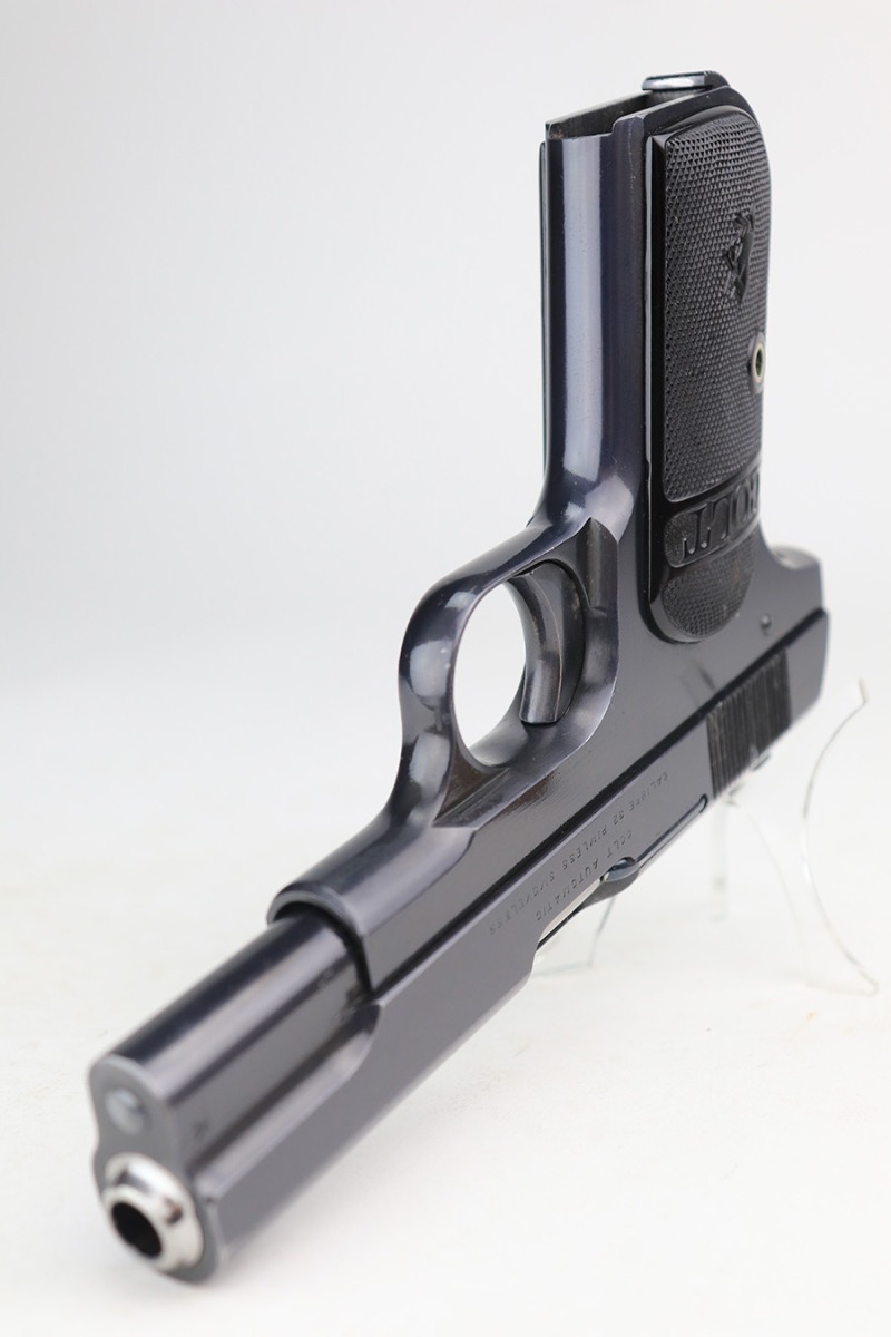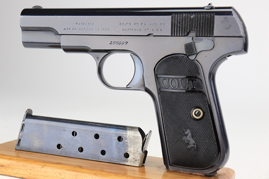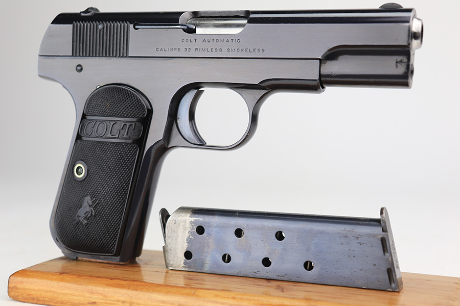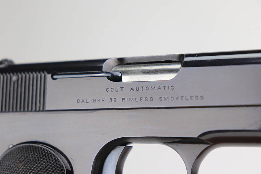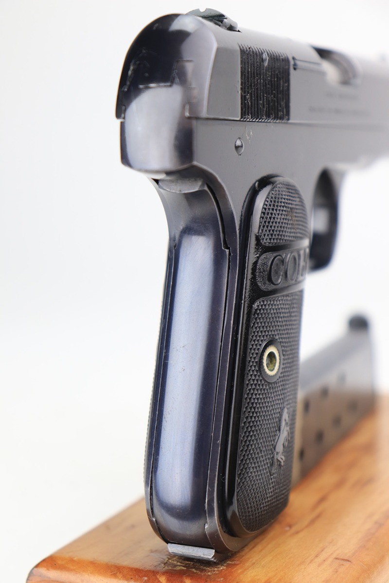 3/22/22 – This is a minty Colt M1903 Pocket Hammerless from 1914. Very little bluing loss overall, but minor pinpricking along the left side of the slide. A few minor surface scratches on the rear of the slide/frame, but excellent condition overall. Strong, shiny bore with just a little frost through the grooves. Excellent Colt grips with no cracks or chips. Original two-tone magazine marked ‘CAL .32 COLT’ on the base.