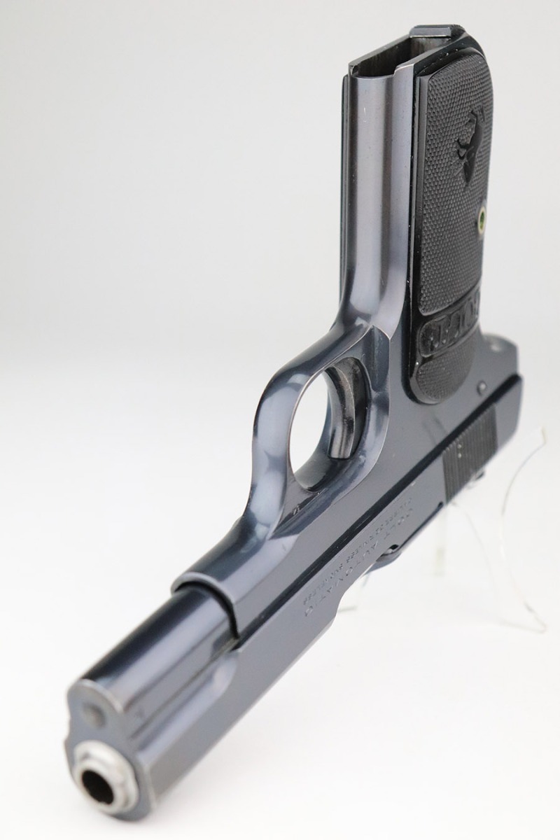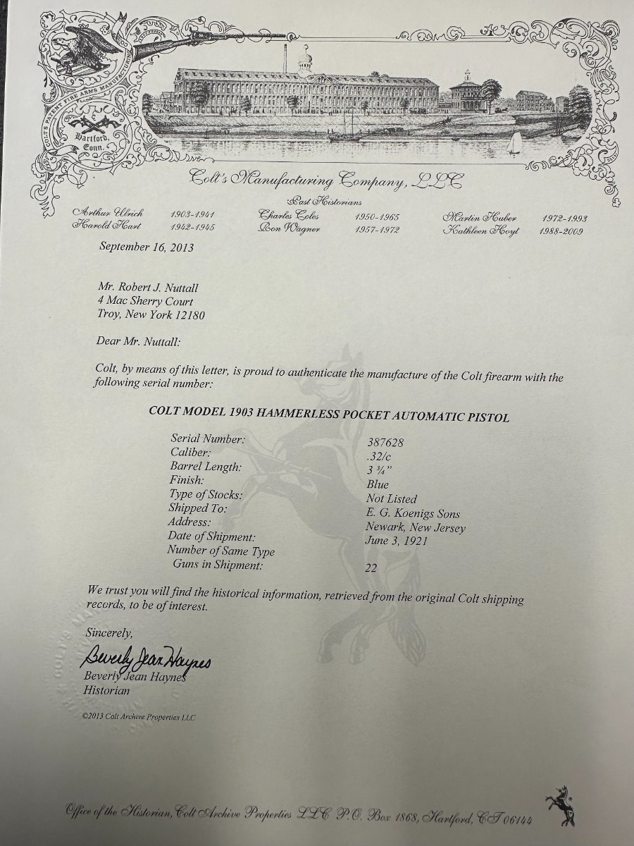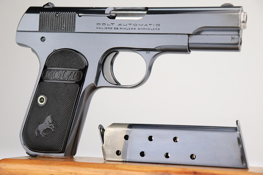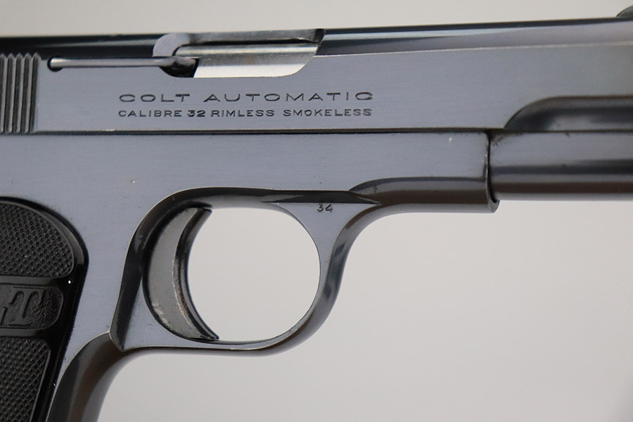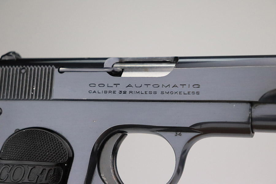 11/4/22 – This is a near-mint example of a Colt Model 1903 Pocket Hammerless, sold in the commercial market in 1921 and chambered in .32 ACP. It comes with the Colt archives letter stating it shipped in June of that year to a store in Newark, NJ. It is all matching and has retained about 98% of its beautiful high polish Colt bluing. There is just very minor wear and a few tiny pits around the muzzle. Very minor dulling on the back grip strap. Comes with excellent period-correct black hard rubber Colt grips and one proper magazine. The bore is near-mint.