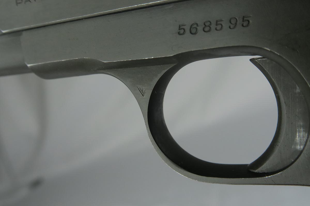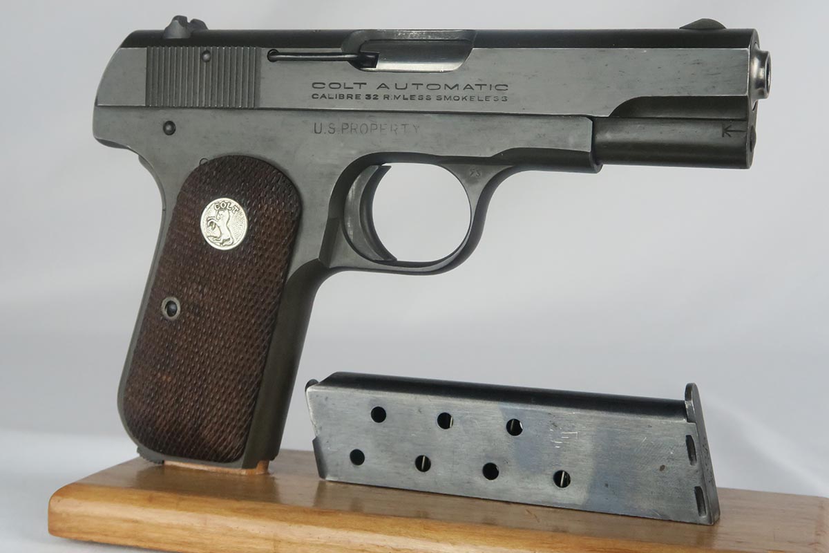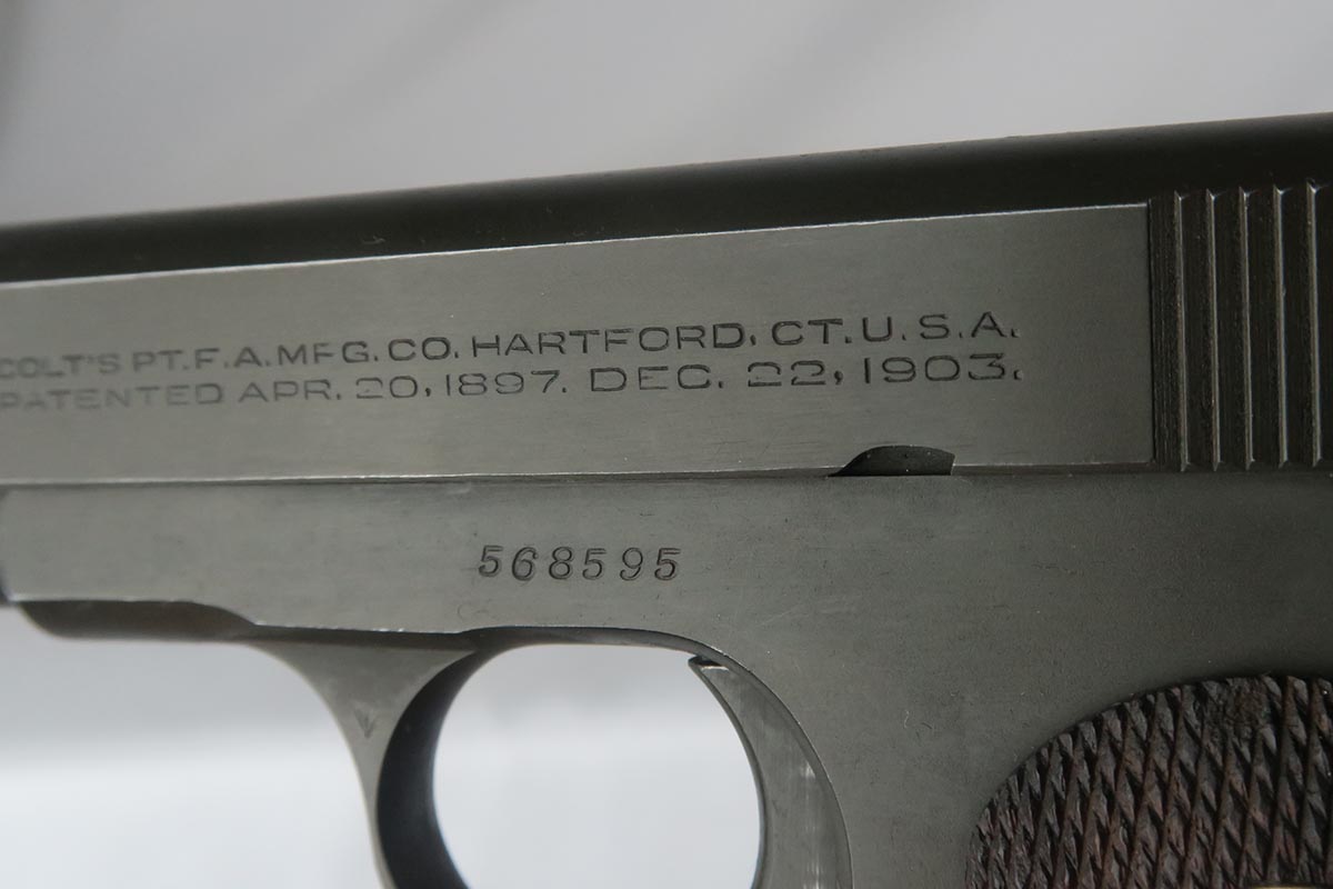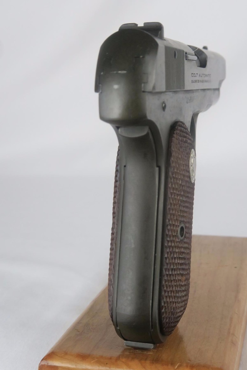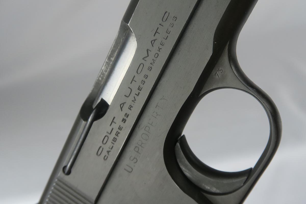 11/3/17 – This is a near-mint and original Colt 1903 hammerless that was manufactured in 1943.  It is marked U.S. PROPERTY on the frame, denoting it was military issued during World War II.   The original and correct parkerized finish rates at 99% with only minor muzzle wear.  Excellent wood grips with silver Colt medallion.  Magazine is marked CAL. 32 COLT on the base.  Minty bore.