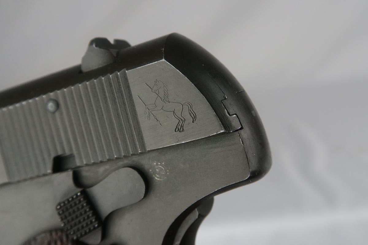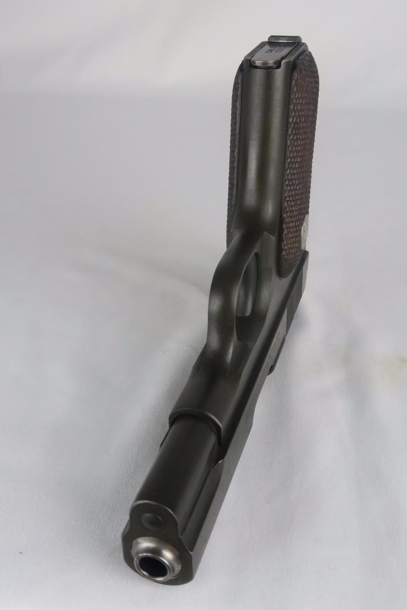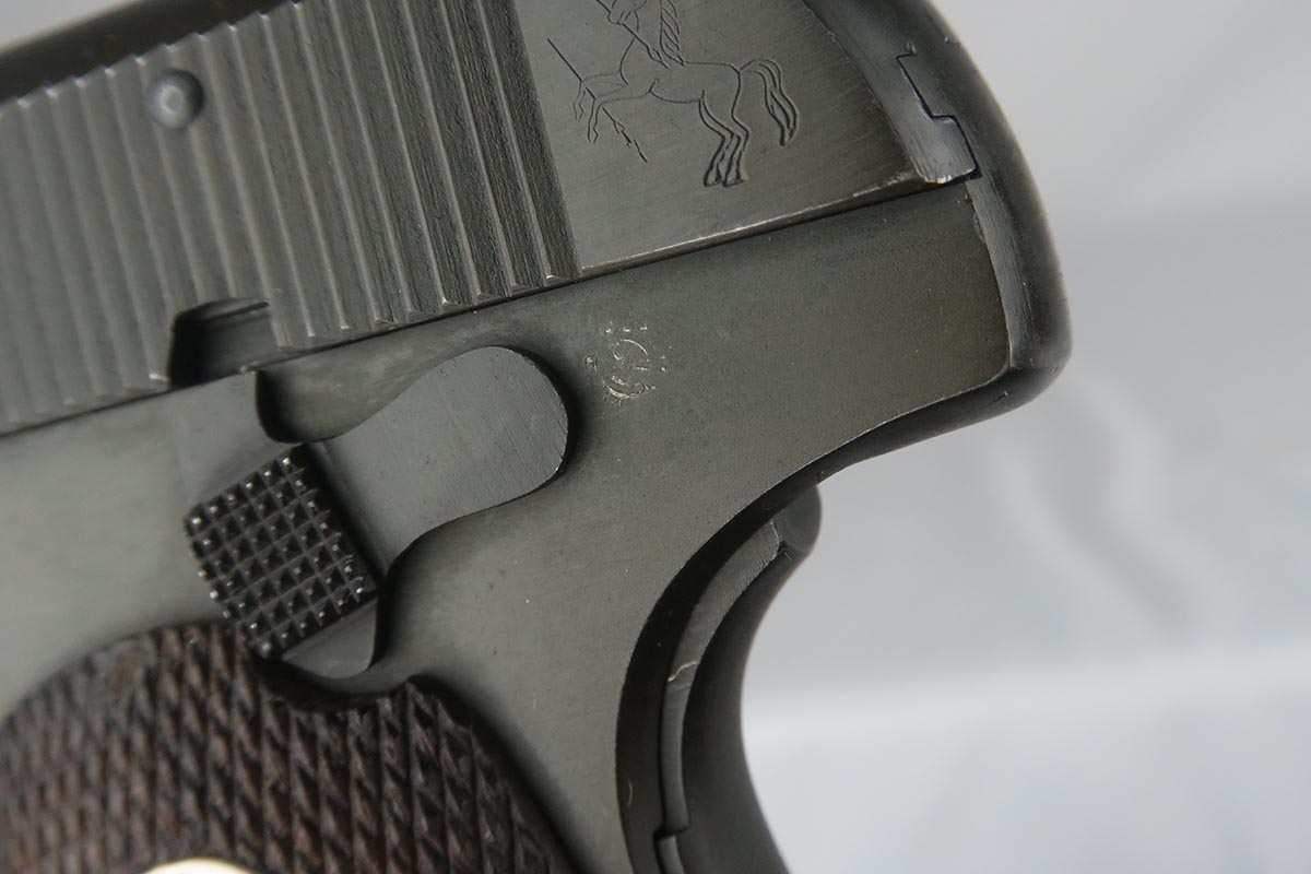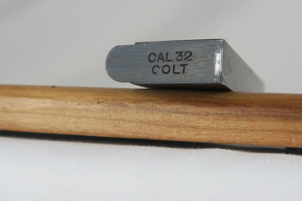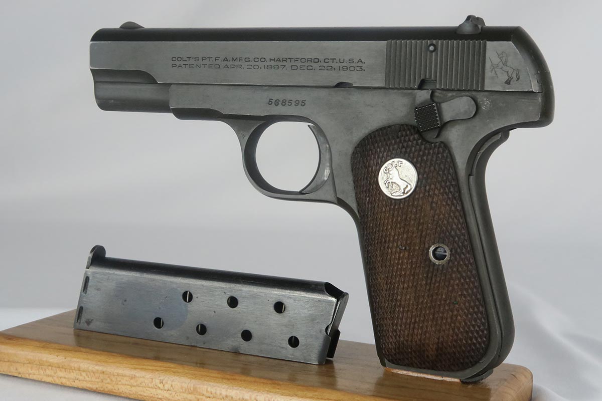 11/3/17 – This is a near-mint and original Colt 1903 hammerless that was manufactured in 1943.  It is marked U.S. PROPERTY on the frame, denoting it was military issued during World War II.   The original and correct parkerized finish rates at 99% with only minor muzzle wear.  Excellent wood grips with silver Colt medallion.  Magazine is marked CAL. 32 COLT on the base.  Minty bore.