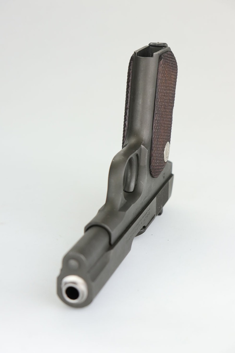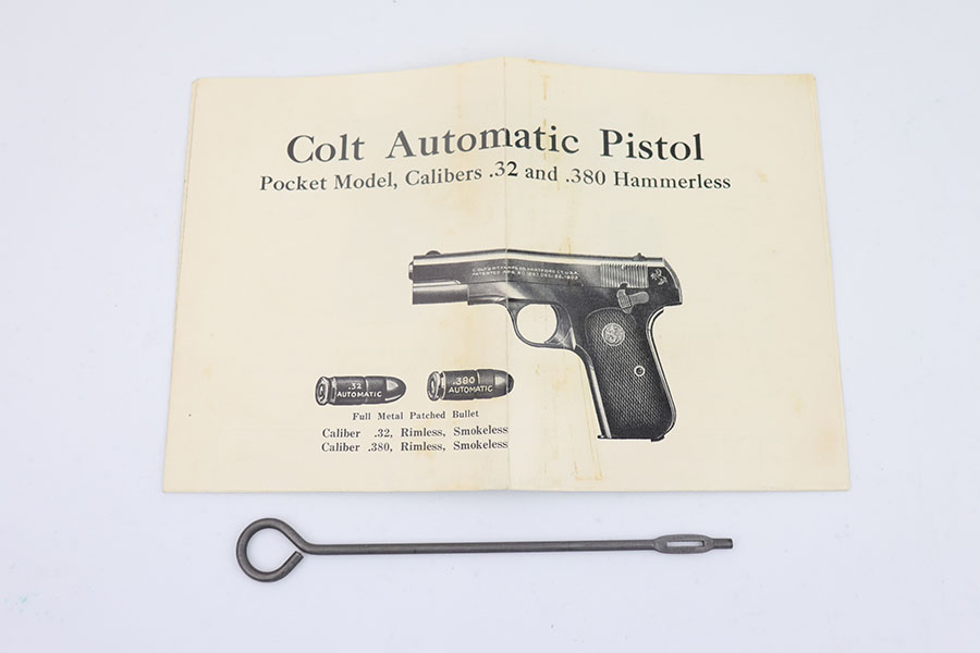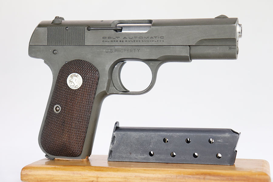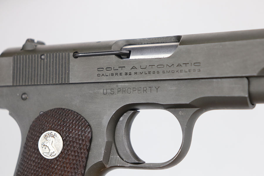 3/27/20 – This is a near-mint example of a scarce Colt M1903 with US Property marking on frame. These were issued to Officers and OSS Officers in the WW2 period or given out post war. Carried through Korean and Vietnam wars. The pistol was made in 1945 and retains about 99% of the original parkerized finish, as there’s only a small spot of finish loss on the left side of the slide. Minty bore and grips. The gun comes with two correct magazines, manual, cleaning rod and hand numbered original box which makes it matching to the gun. Very rare found in this BOXED original configuration.